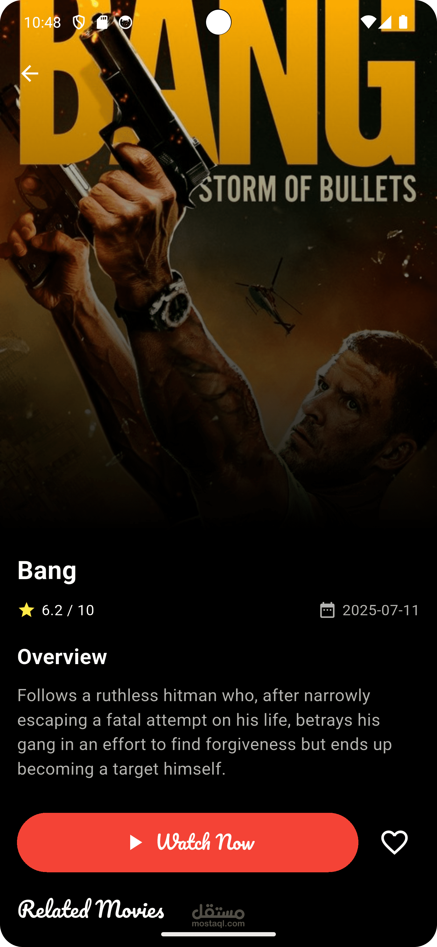 The app includes advanced search functionality allowing users to filter movies by genre and release year while saving recent searches locally for quick access. Detailed movie pages display full information including ratings release dates overviews related movies and a watch now placeholder for future streaming integration.