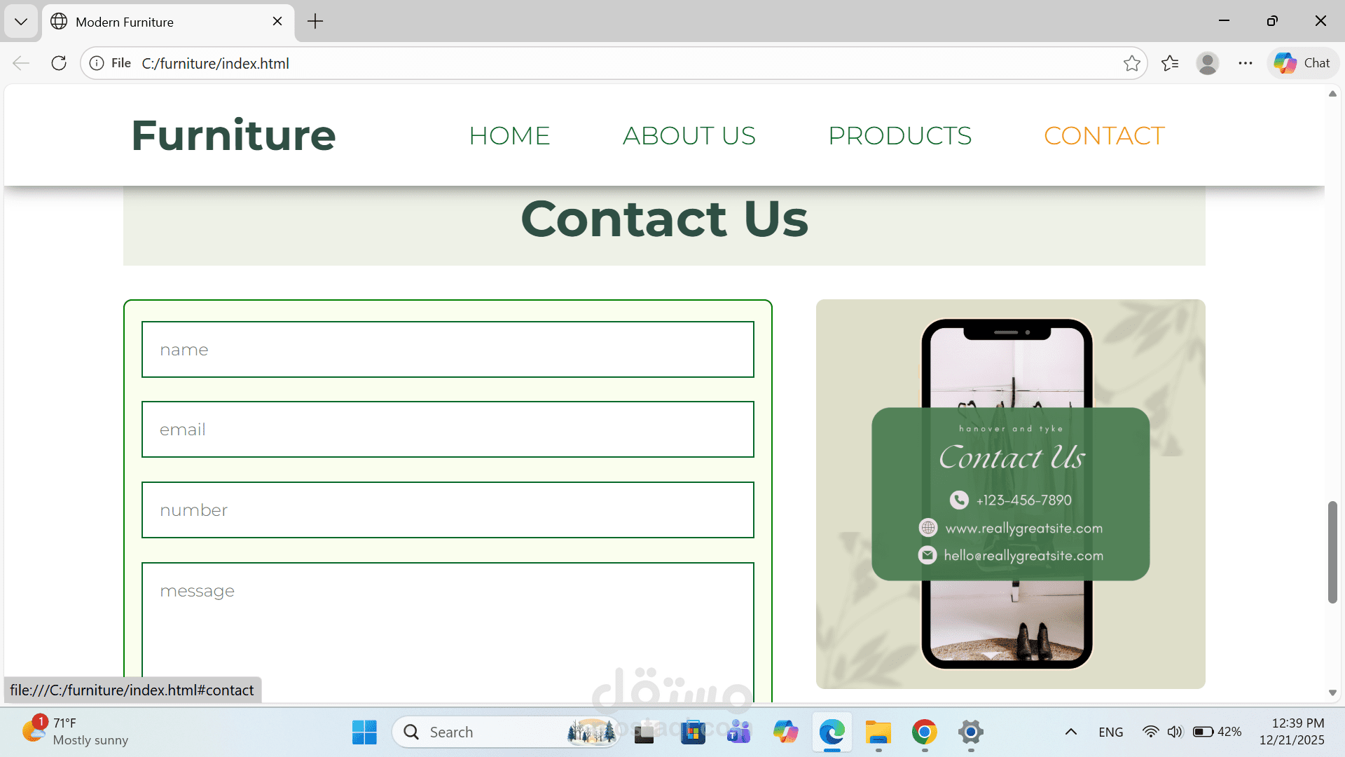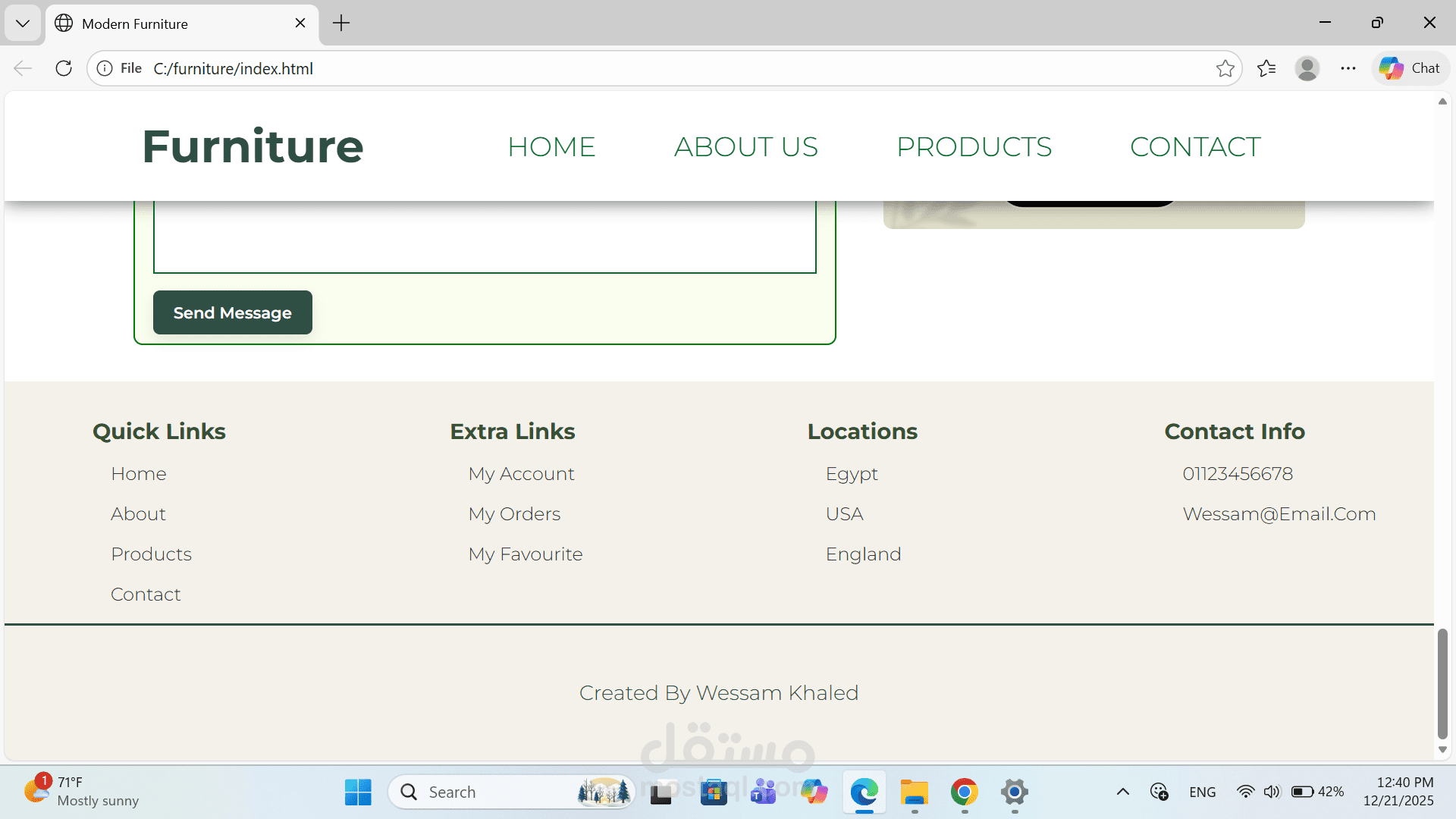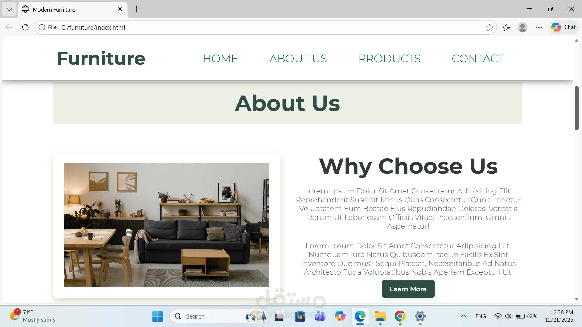 تصميم وتطوير موقع خاص بالأثاث (Furniture Website) باستخدام HTML5 و CSS3 فقط، مع التركيز على البساطة، الأناقة، وتجربة المستخدم.