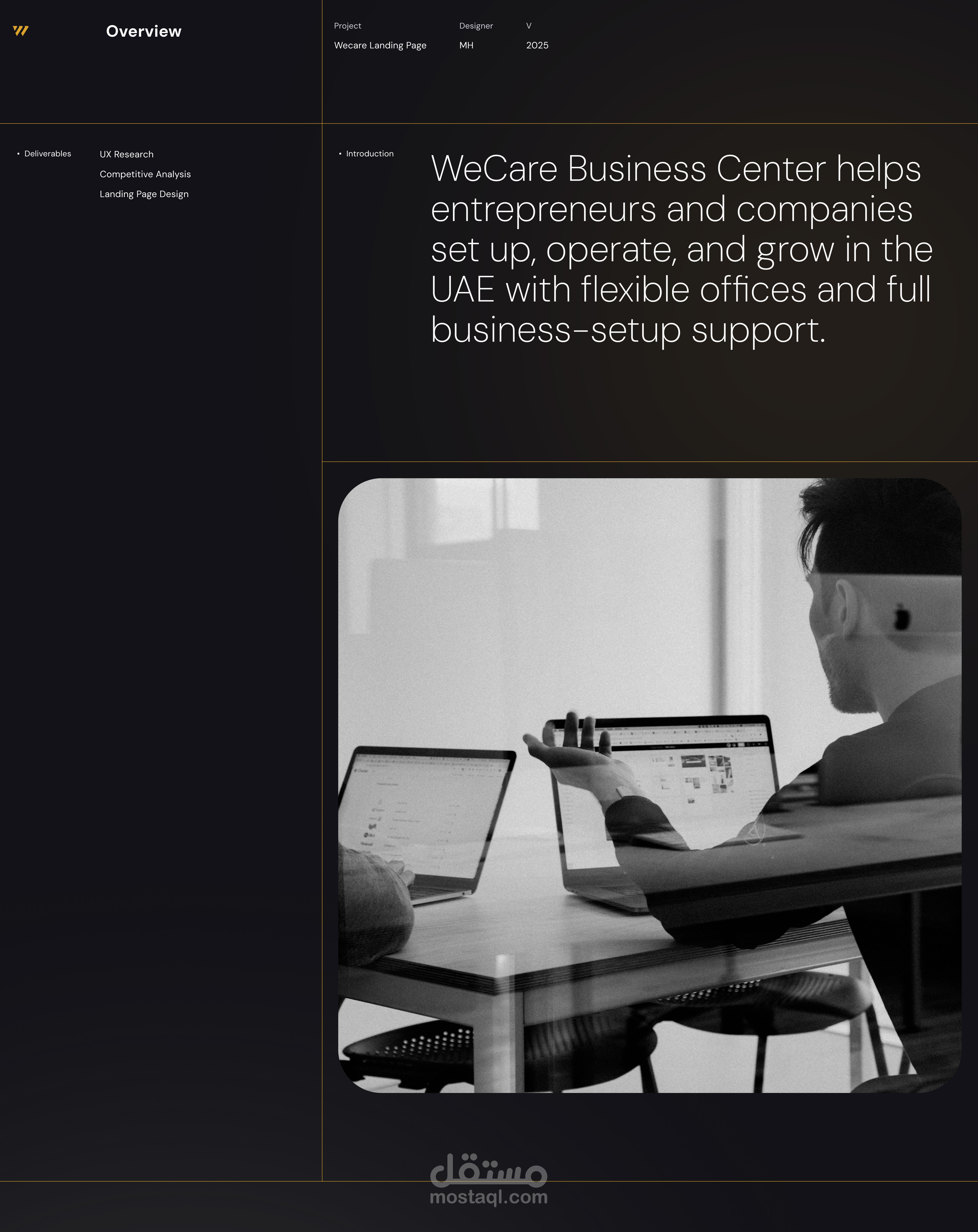 تقدم WeCare مساحات مكتبية حديثة لرواد الأعمال في الإمارات. قمت بإعادة تصميم صفحة الهبوط الخاصة بهم من خلال تحليل المنافسين، بحث UX، وتصميم بصري نظيف وفلات، مع التركيز على وضوح العلامة التجارية وبساطة التجربة.