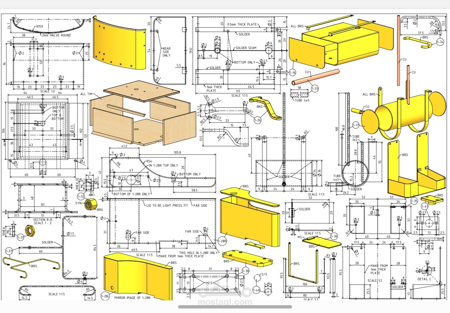 الإخراج الهندسي: لوحة رسم هندسي توضح المساقط الأربعة بأبعاد دقيقة، مما يعكس الجاهزية للتصنيع أو التجميع المصغر."