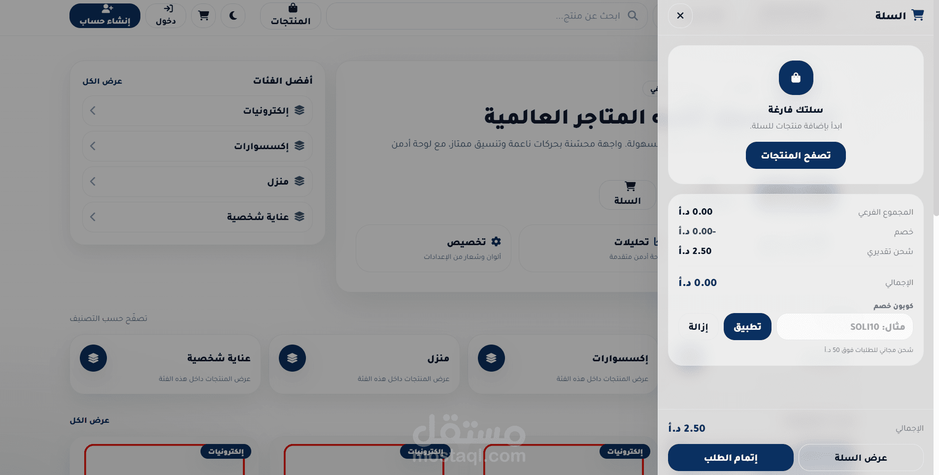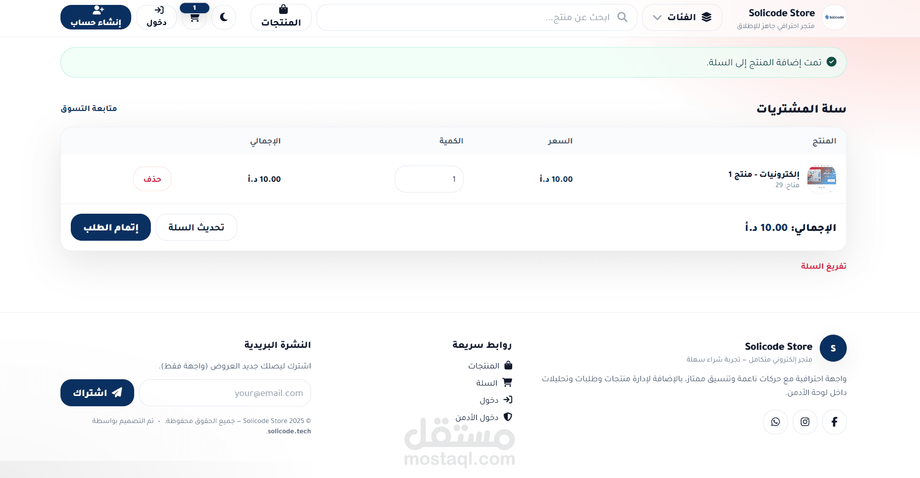 منصة تجارة إلكترونية متكاملة تتيح عرض وبيع المنتجات عبر واجهة حديثة وسهلة الاستخدام، مع تجربة شراء سلسة من التصفح حتى إتمام الطلب. يركّز النظام على سرعة الأداء، وإدارة فعّالة للمنتجات والطلبات، ودعم نمو الأعمال من خلال بنية مرنة قابلة للتوسع وإضافة مزايا مستقبلية مثل وسائل الدفع المتعددة، التقارير التحليلية، وإدارة العملاء.