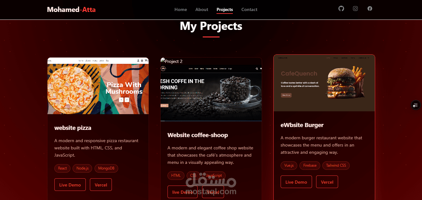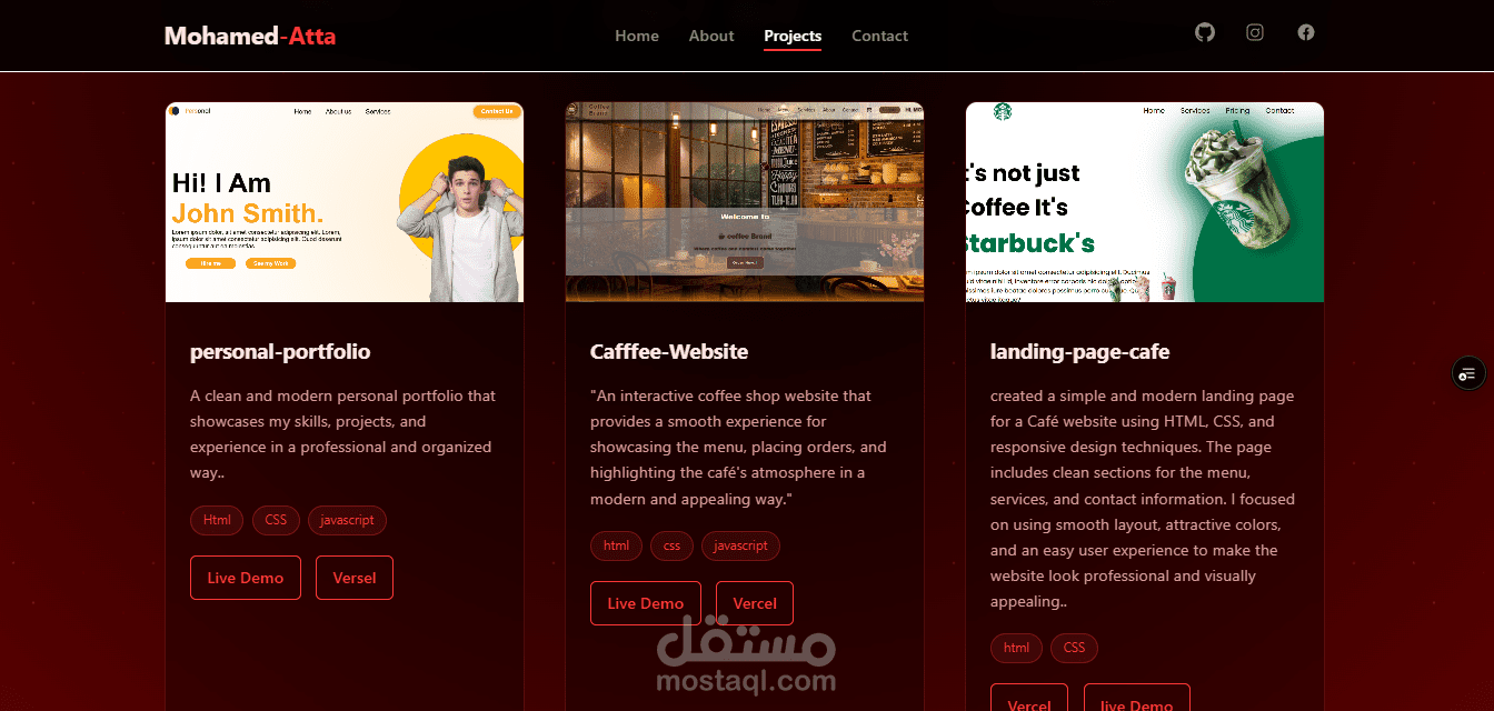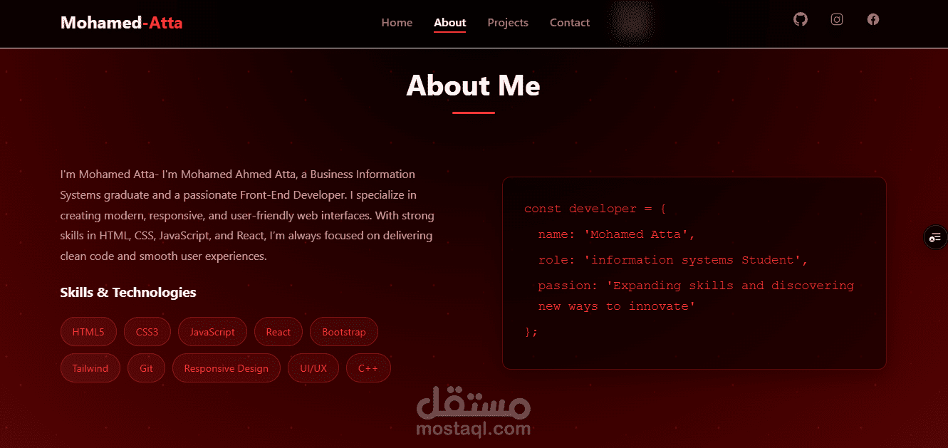 قمت بتصميم وتطوير بورتفوليو شخصي يعرض مهاراتي وخبراتي كمطور واجهات أمامية، مع التركيز على تصميم عصري وتجربة مستخدم مميزة. الموقع متجاوب بالكامل مع جميع الأجهزة ويحتوي على أقسام مثل نبذة عني، المهارات، المشاريع، وطرق التواصل، مع كود منظم وسهل التعديل.