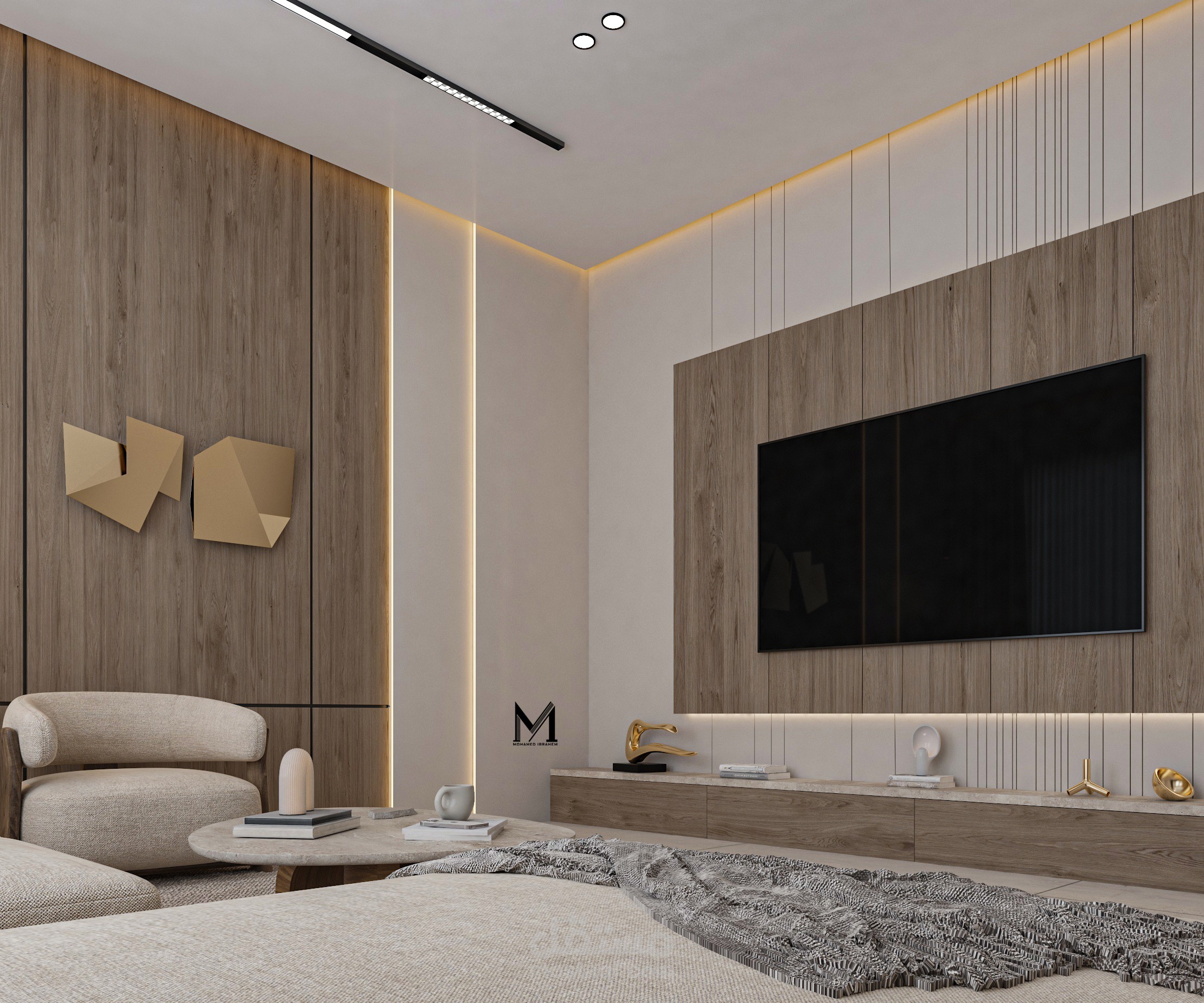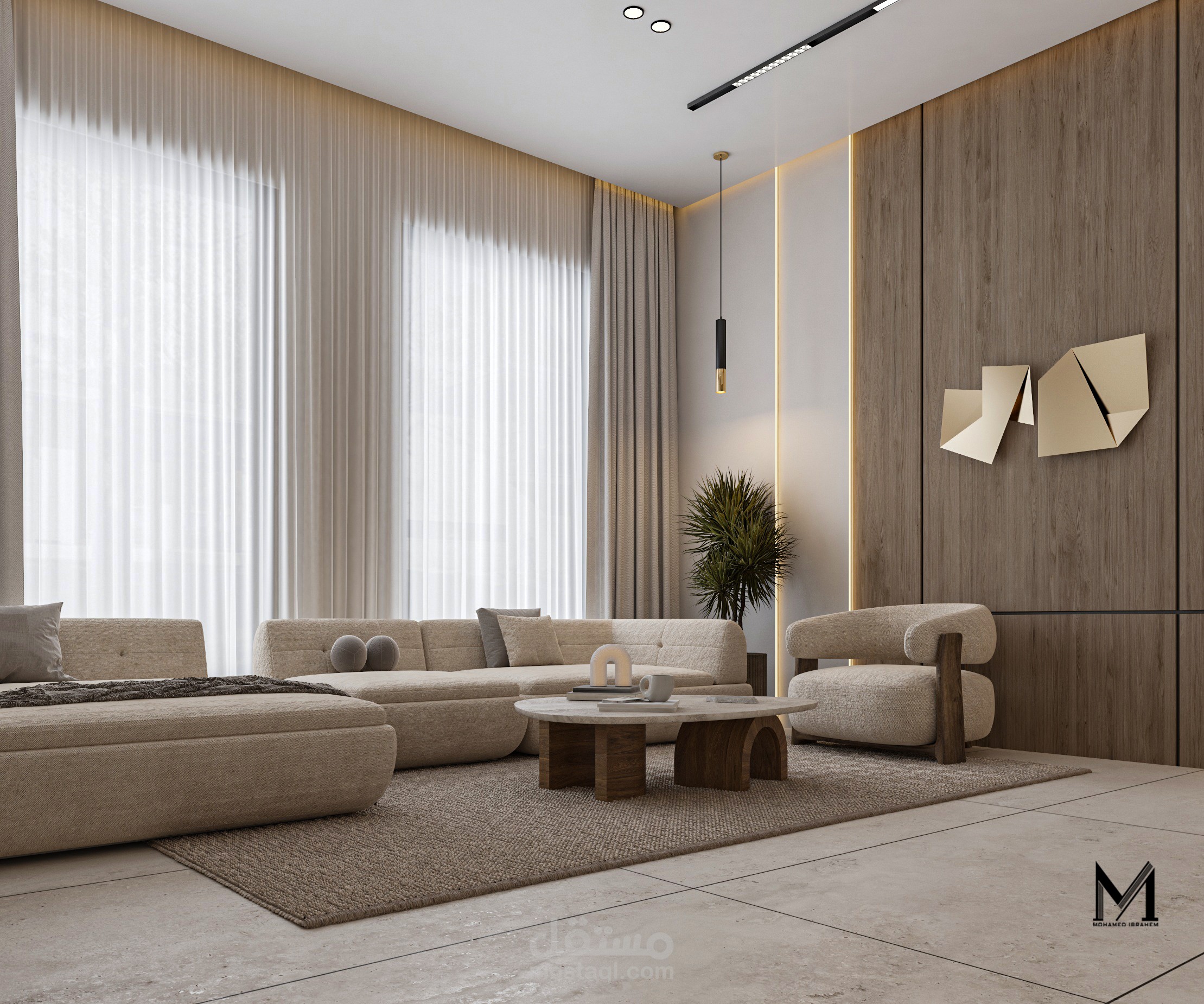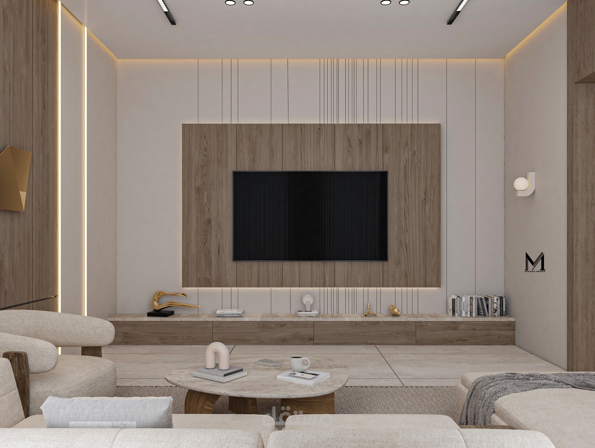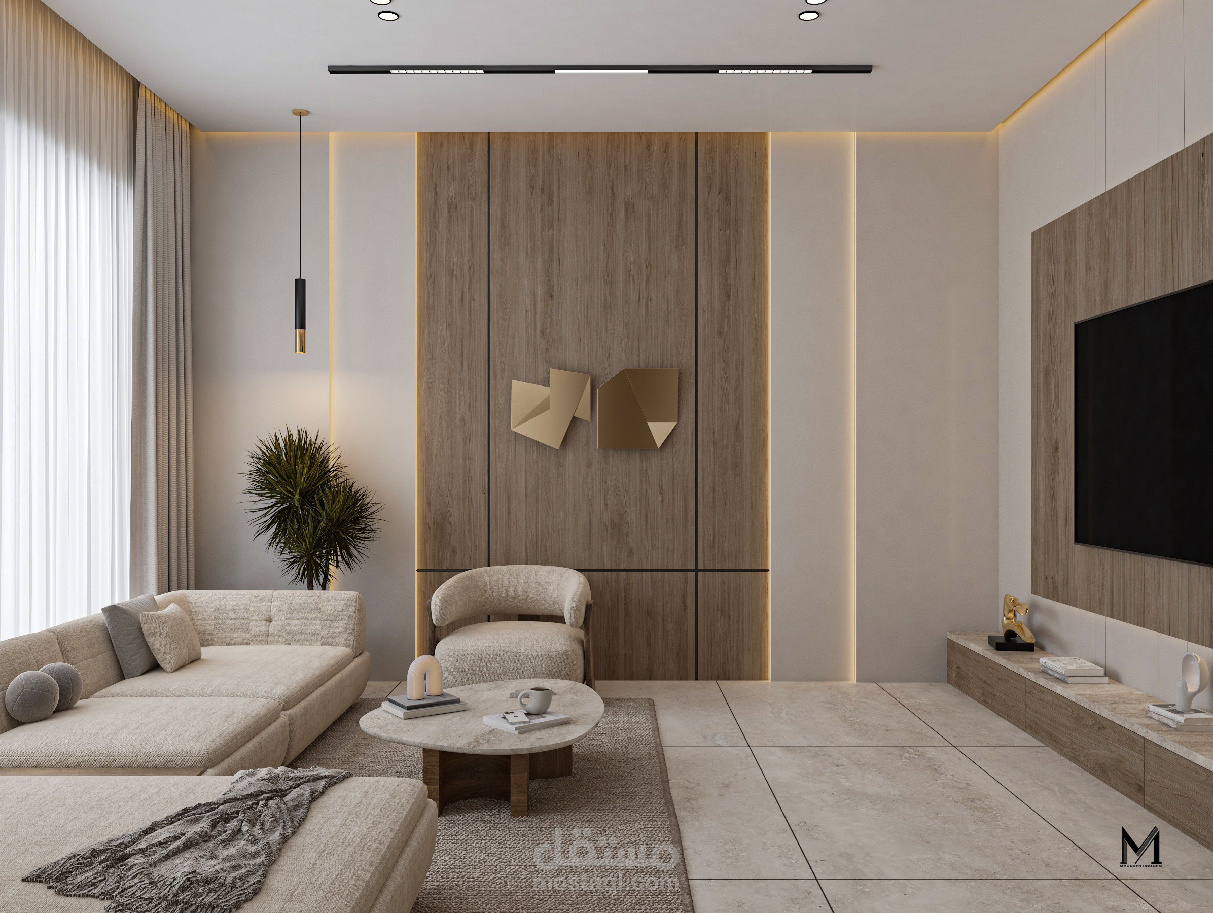 تصميم غرفة معيشة عصرية يعكس أسلوبًا حديثًا قائمًا على البساطة والأناقة، مع توزيع متوازن للأثاث يضمن الراحة وسهولة الحركة. يعتمد التصميم على ألوان هادئة وخامات عصرية تضيف طابعًا دافئًا ومتناغمًا، مع توظيف الإضاءة الطبيعية والصناعية لإبراز التفاصيل المعمارية وخلق أجواء مريحة وعملية تناسب الاستخدام اليومي.