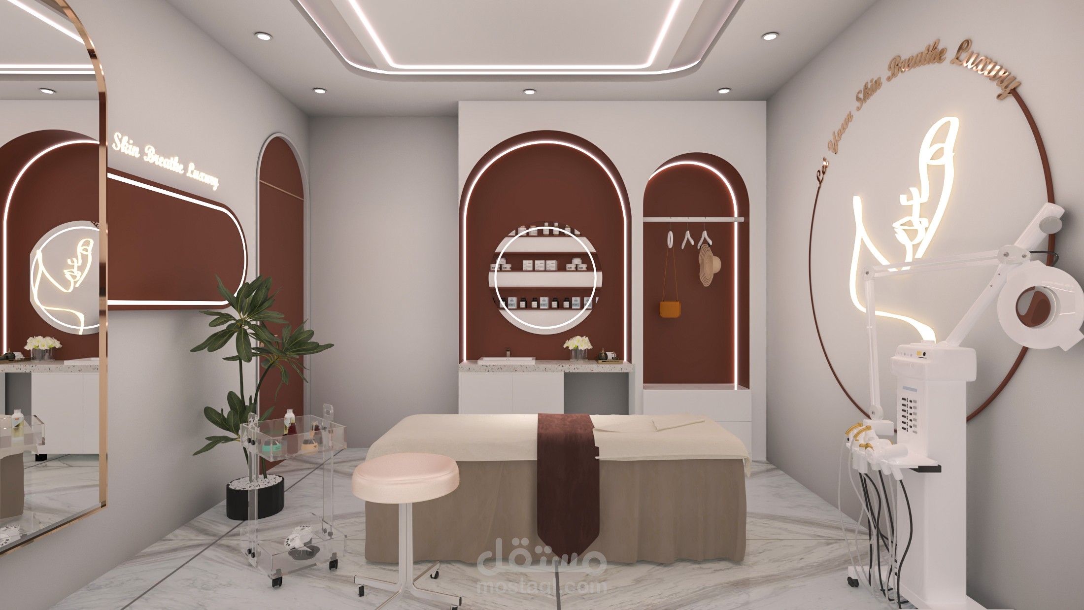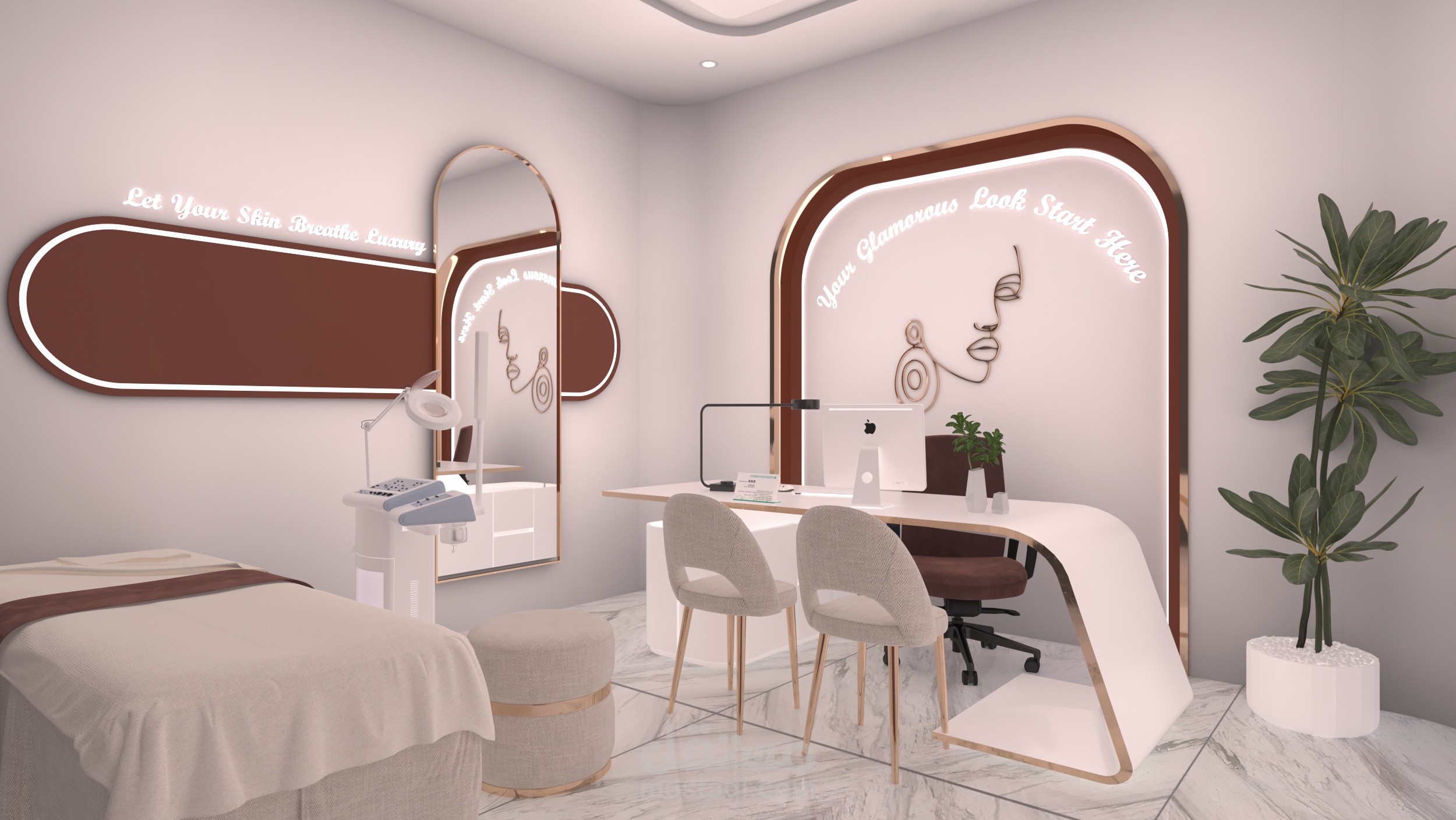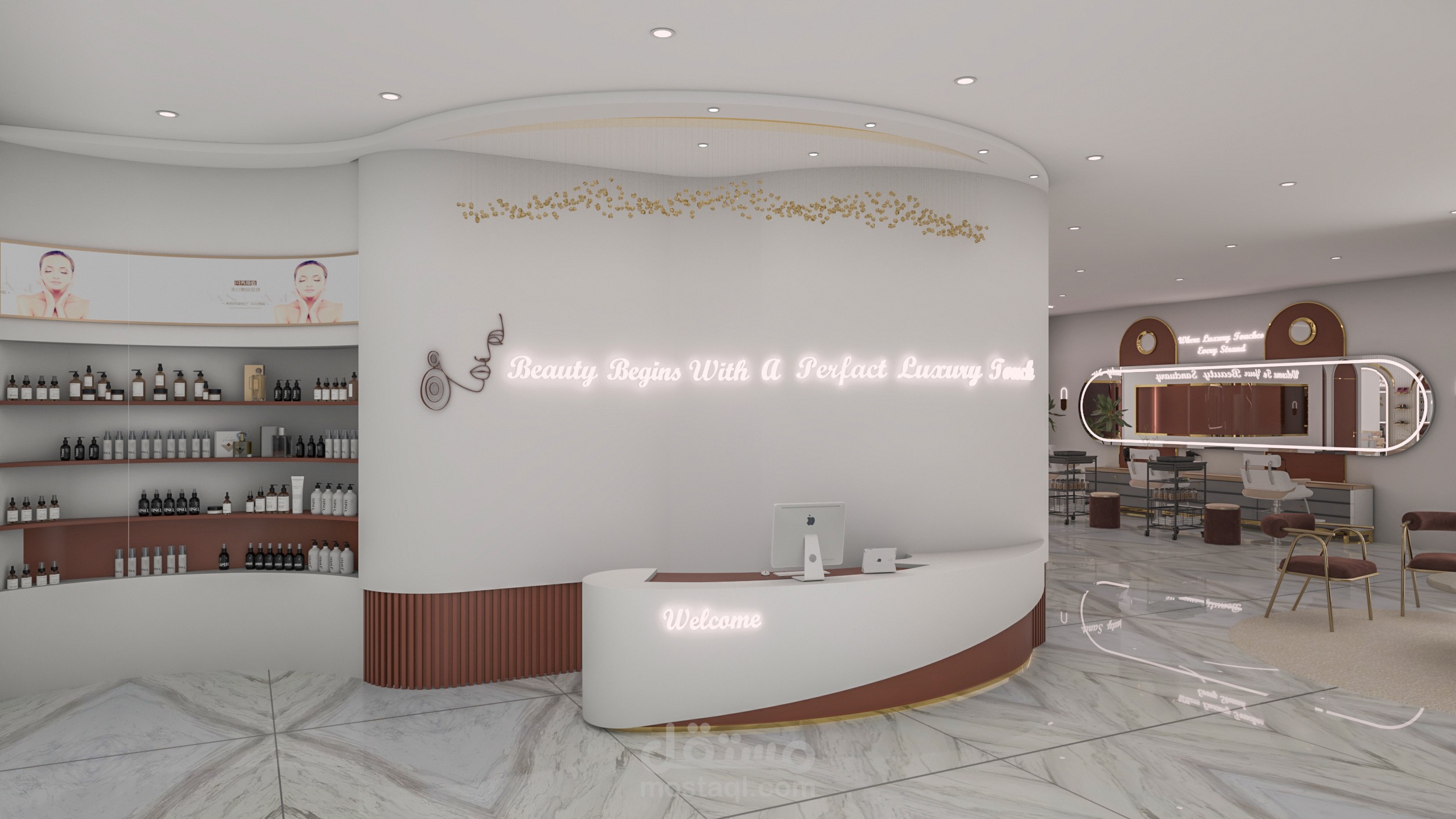 تصميم داخلي وإظهار معماري ثلاثي الأبعاد لصالون تجميل (Beauty Salon) بأسلوب عصري وأنيق، يهدف لخلق تجربة فريدة ومريحة للعملاء.