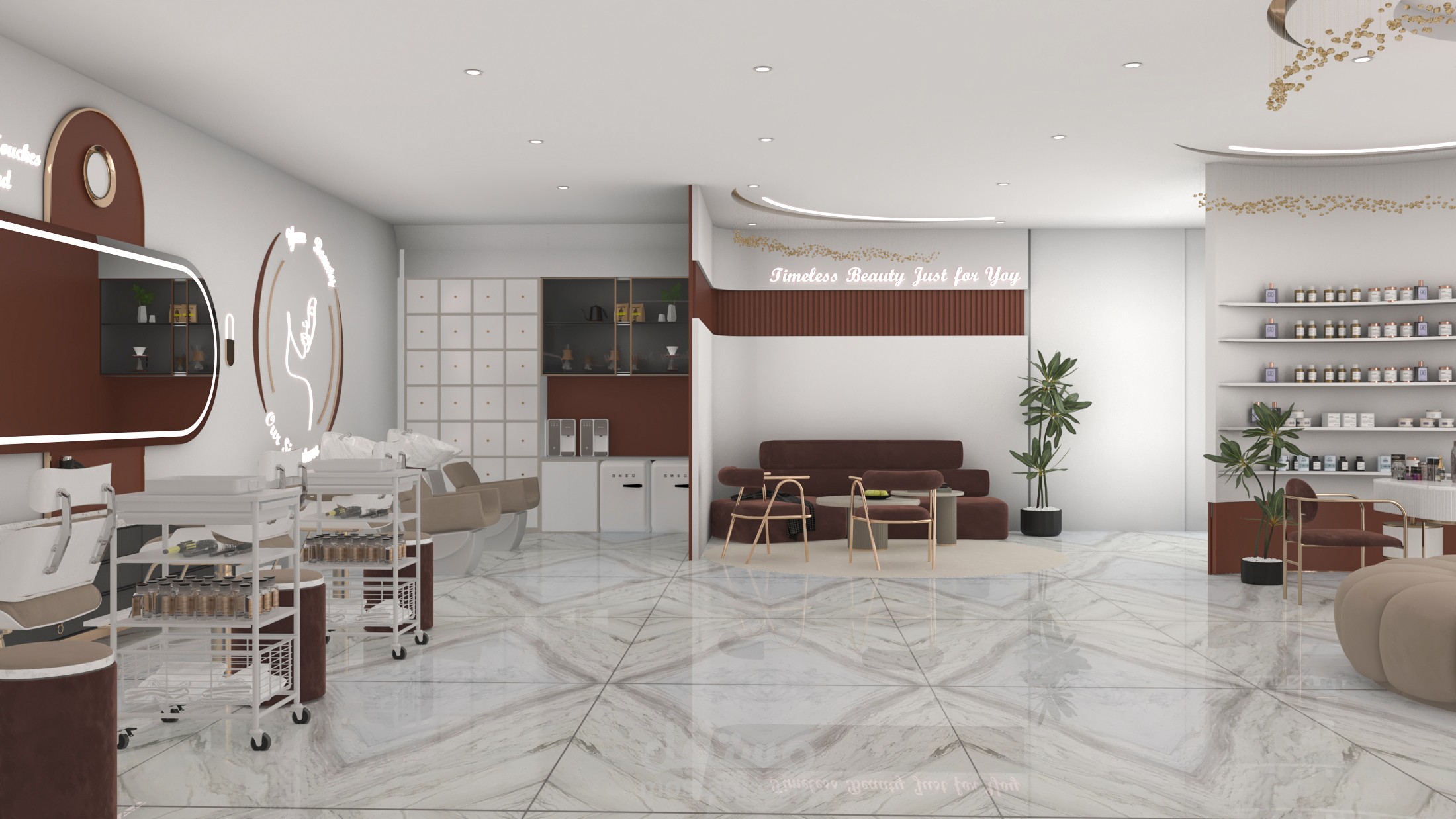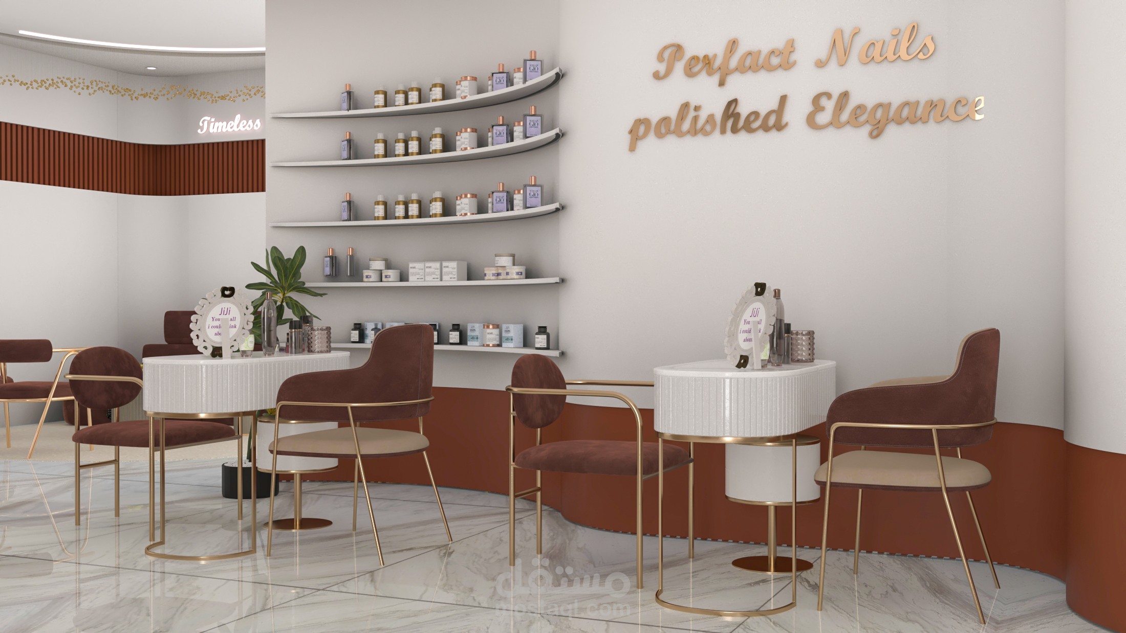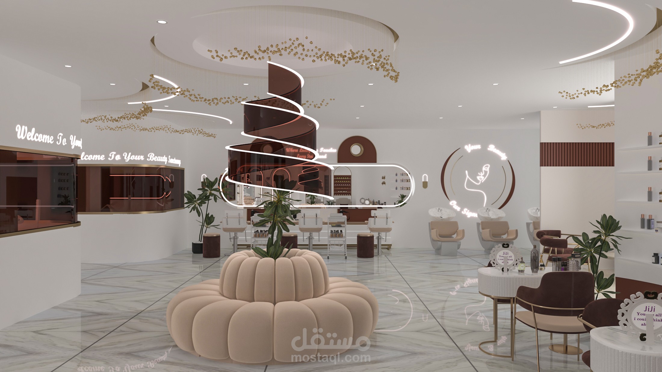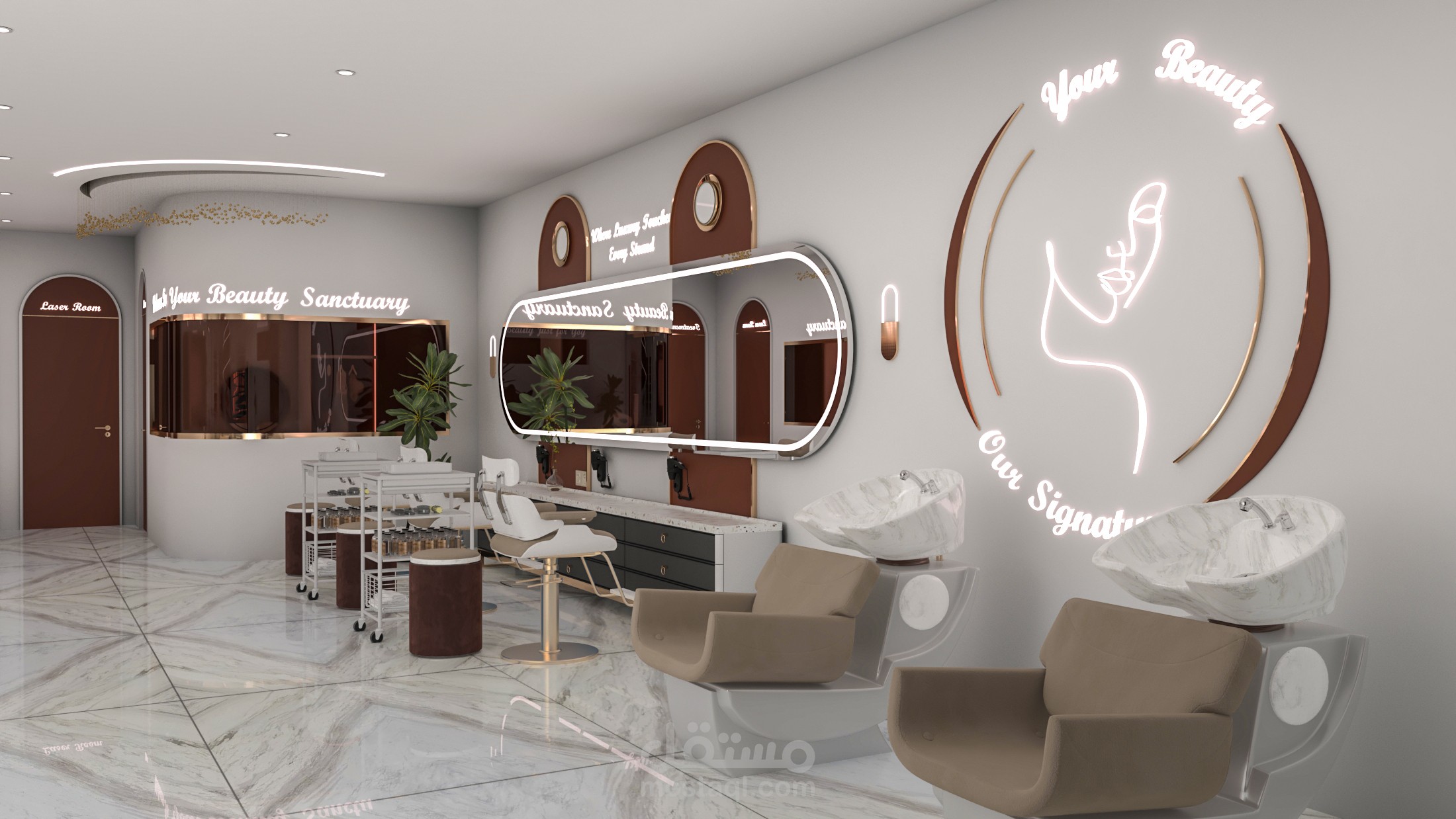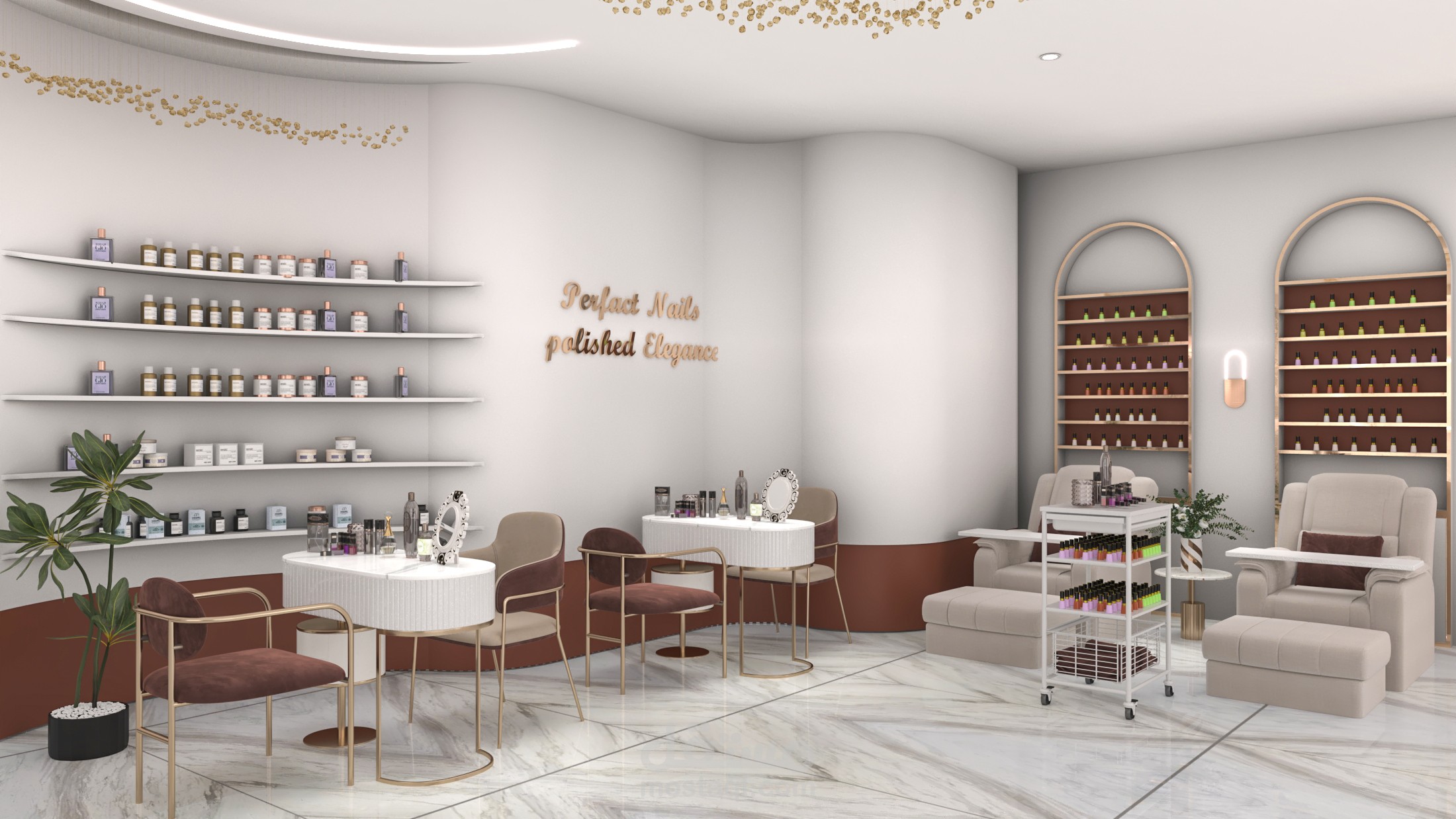 • توزيع وظيفي: تصميم مناطق متخصصة ومفتوحة تشمل منطقة استقبال، قسم العناية بالأظافر، ومحطات لغسيل الشعر، مع مقاعد انتظار مريحة ومبتكرة.