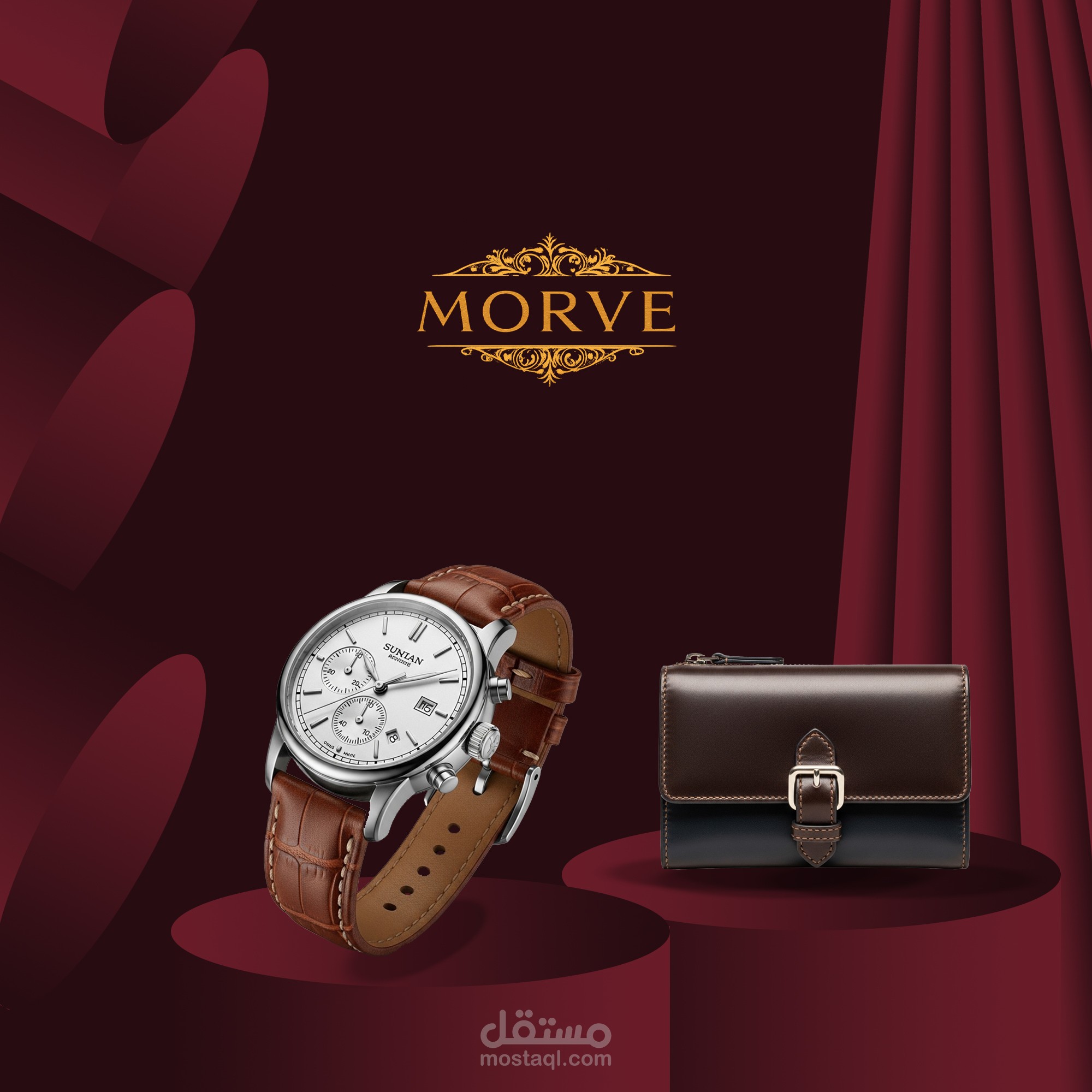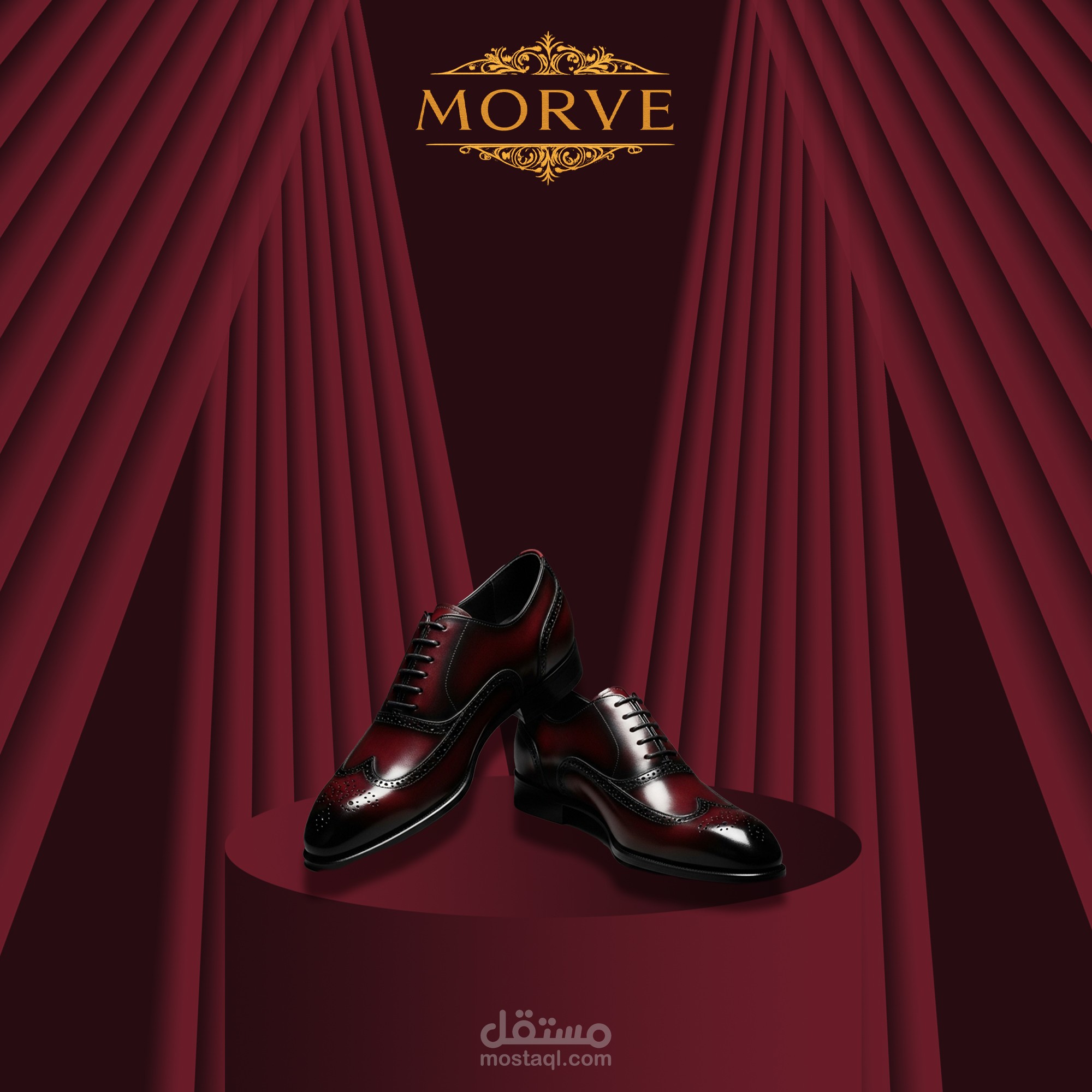 The concept is based on a luxury stage presentation, using deep red tones, golden accents, and theatrical curtains to highlight the premium value of leather products.