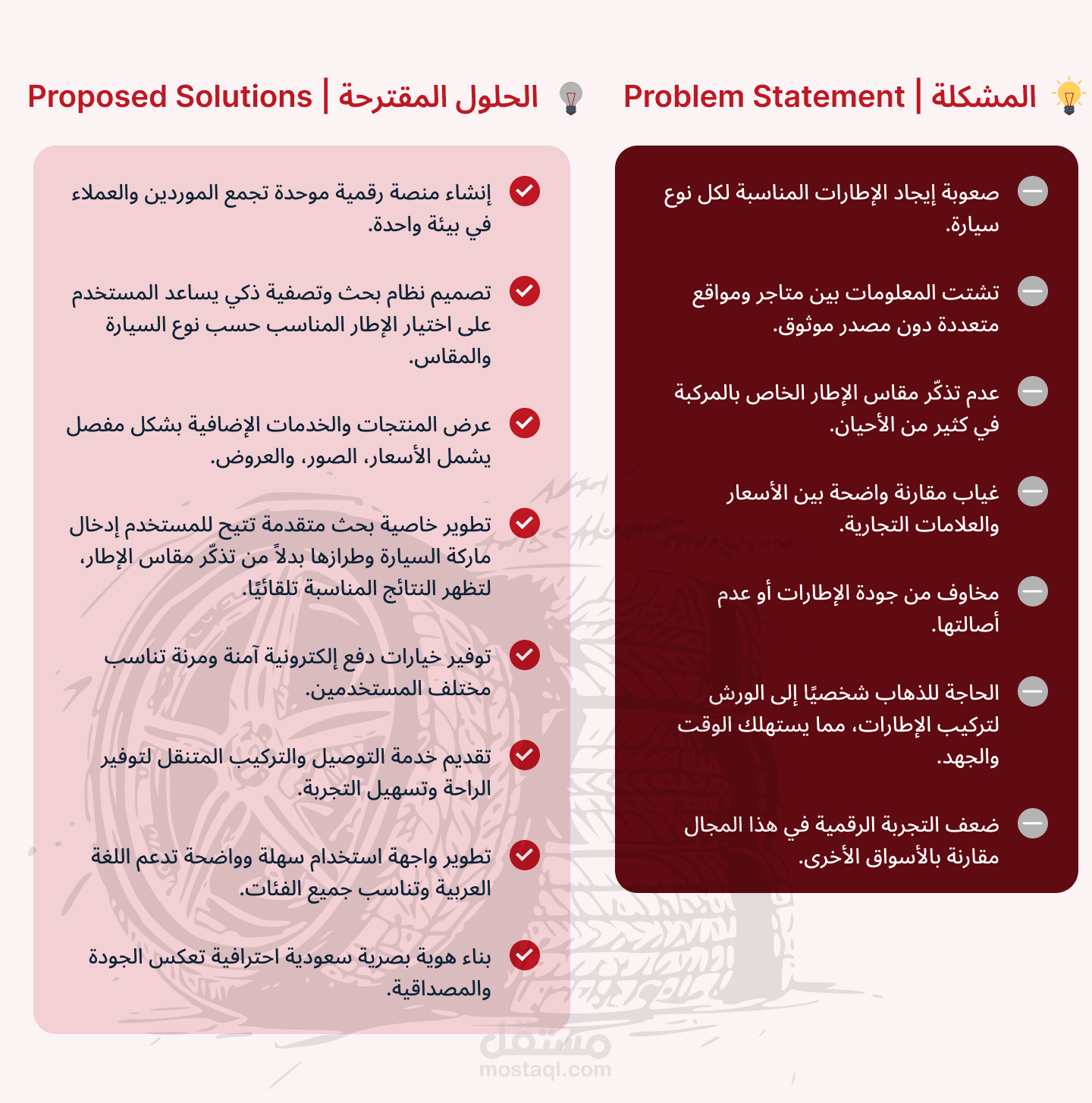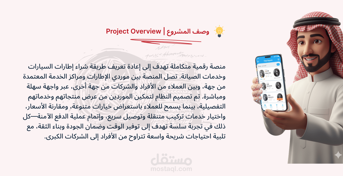 منصة رقمية متكاملة تهدف إلى إعادة تعريف طريقة شراء إطارات السيارات وخدمات الصيانة. تصل المنصة بين موردي الإطارات ومراكز الخدمة المعتمدة من جهة، وبين العملاء من الأفراد والشركات من جهة أخرى، عبر واجهة سهلة ومباشرة. تم تصميم النظام لتمكين الموردين من عرض منتجاتهم وخدماتهم التفصيلية، بينما يسمح للعملاء باستعراض خيارات متنوعة، ومقارنة الأسعار، واختيار خدمات تركيب متنقلة وتوصيل سريع، وإتمام عملية الدفع الآمنة—كل ذلك في تجربة سلسة تهدف إلى توفير الوقت وضمان الجودة وبناء الثقة، مع تلبية احتياجات شريحة واسعة تتراوح من الأفراد إلى الشركات الكبرى.
