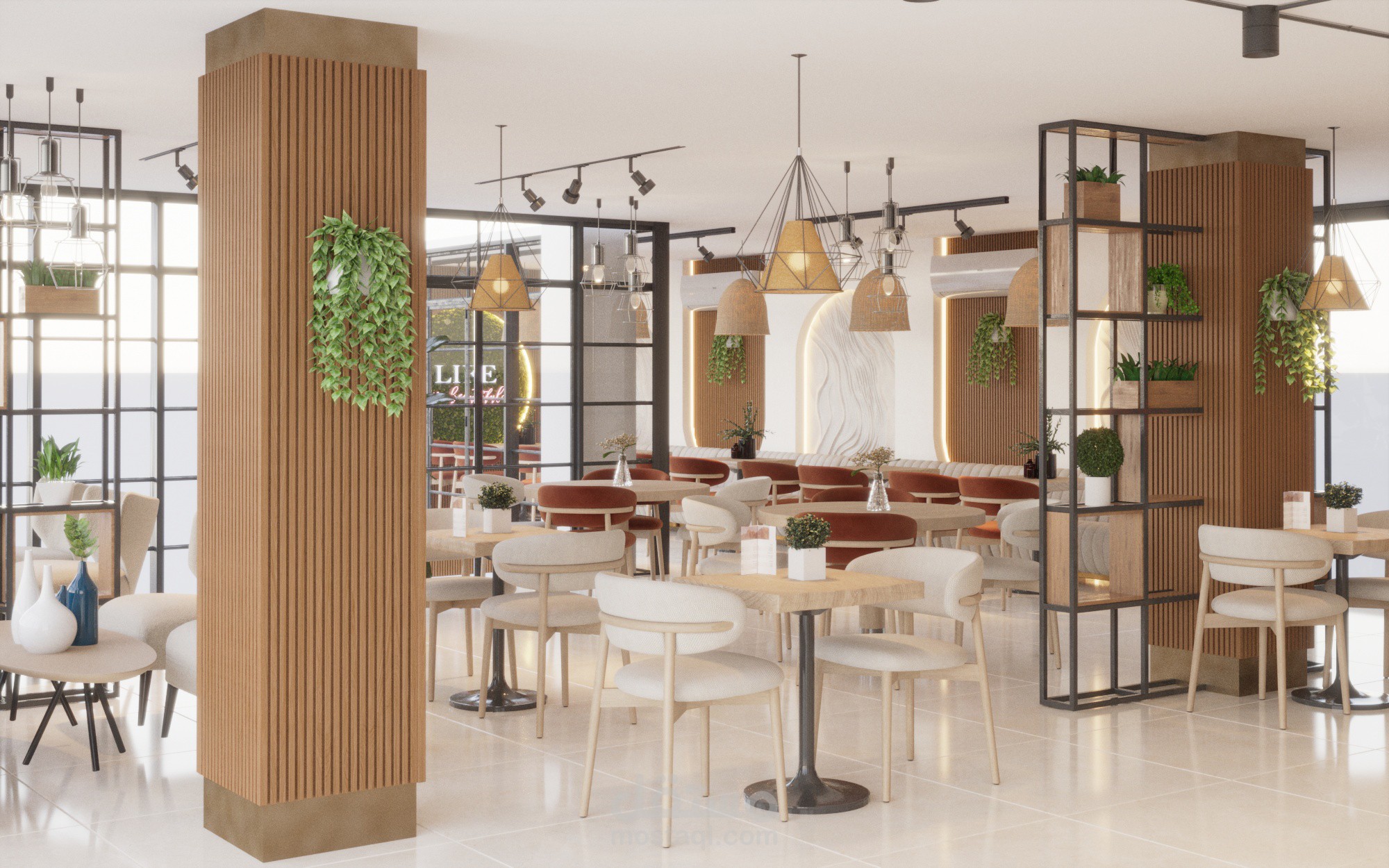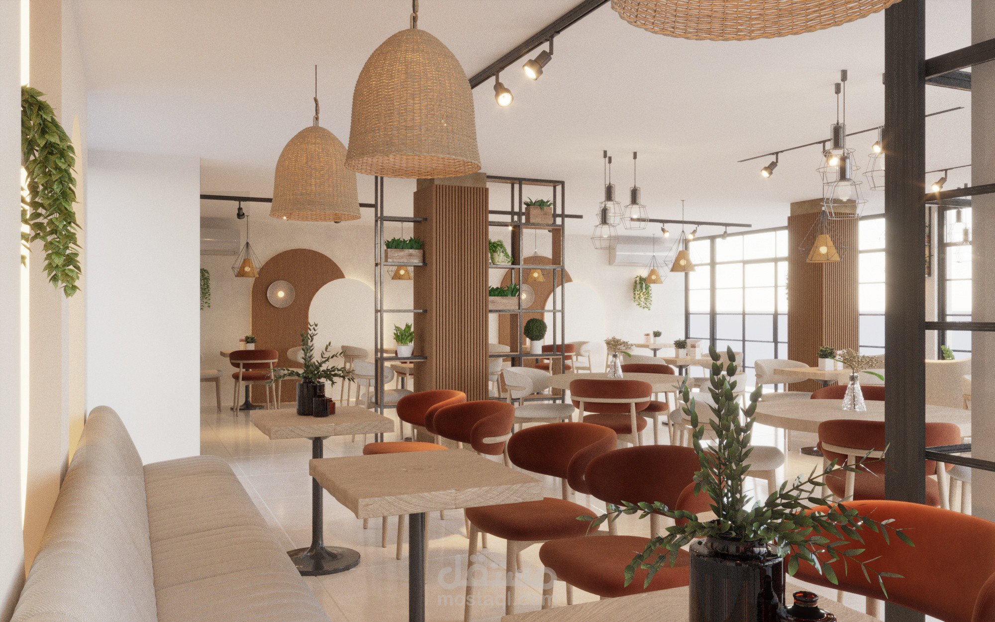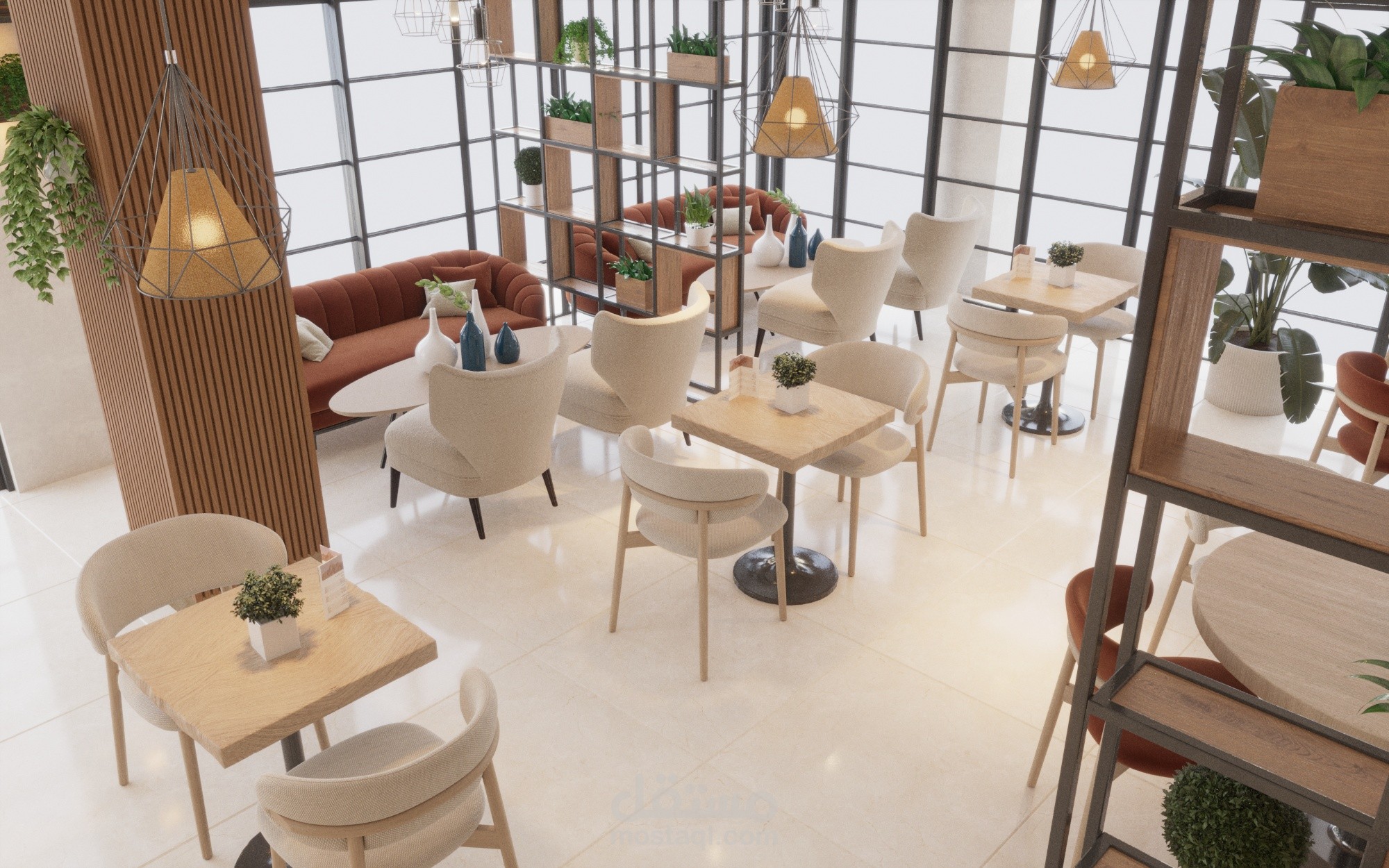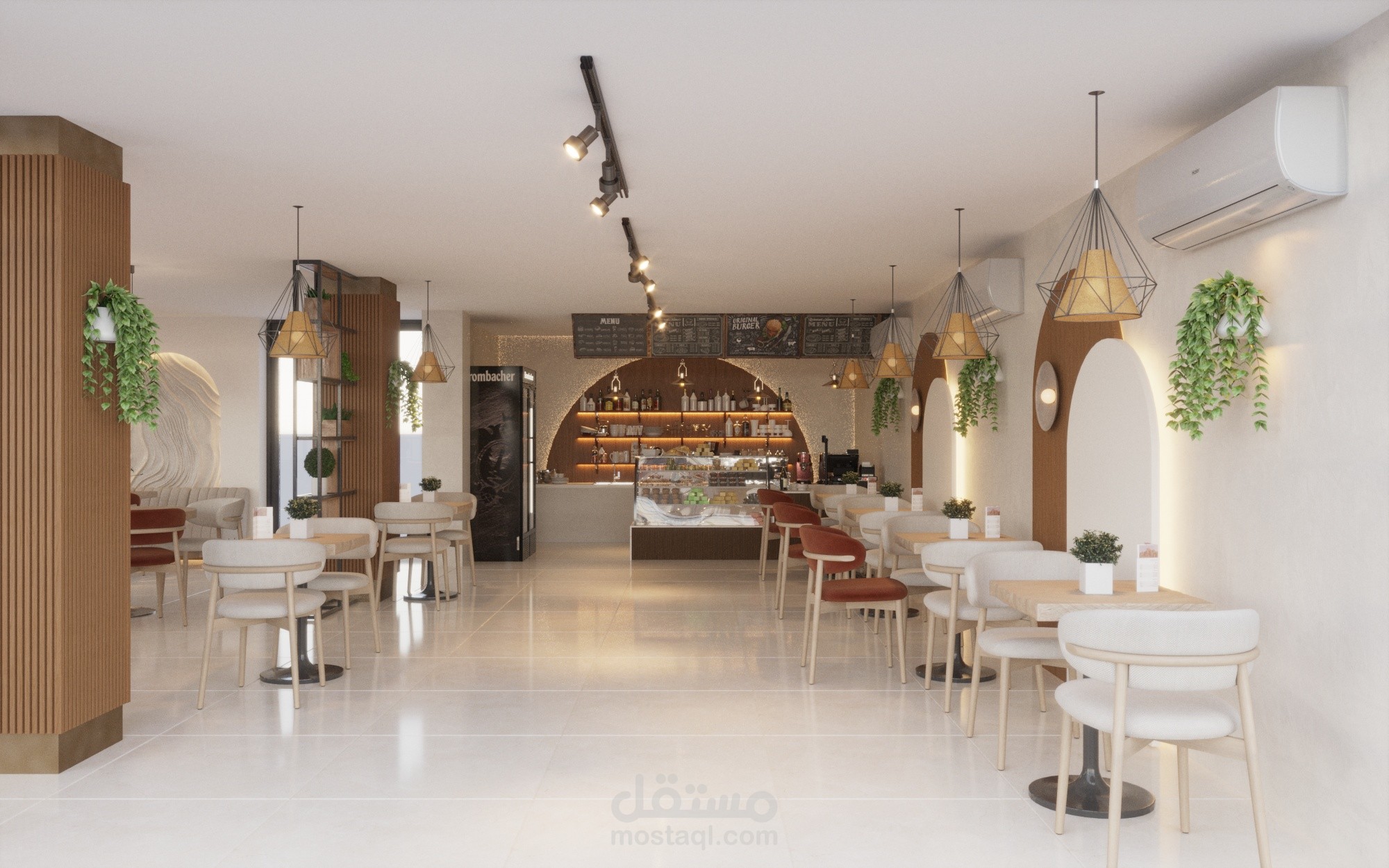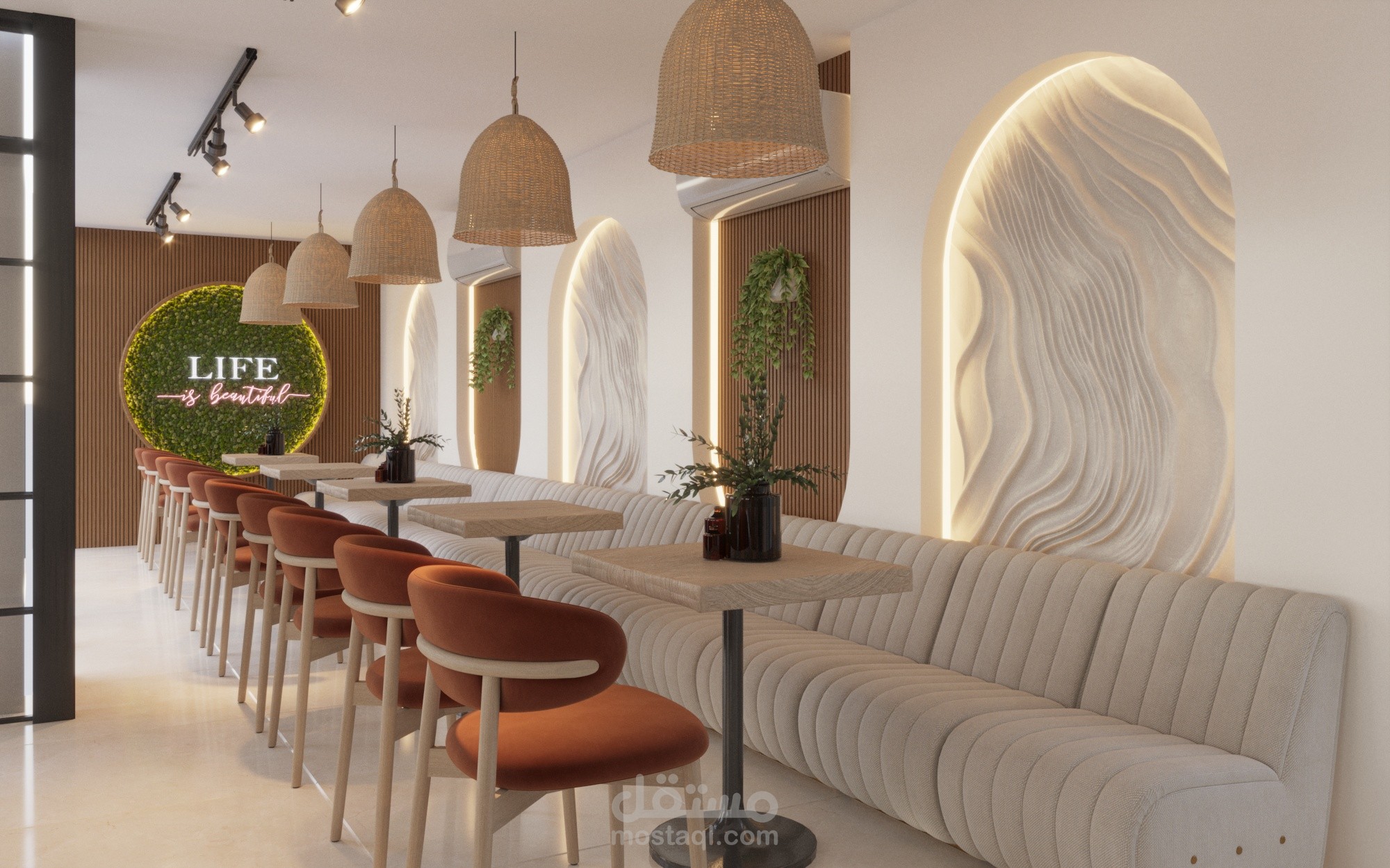 تم تصميم المساحة بشكل يحقق أقصى استفادة من الفراغ مع توفير تنوع في أماكن الجلوس بين الكنبات الجانبية، والطاولات الفردية، وجلسات أكثر خصوصية، بما يناسب مختلف استخدامات الكافيه.