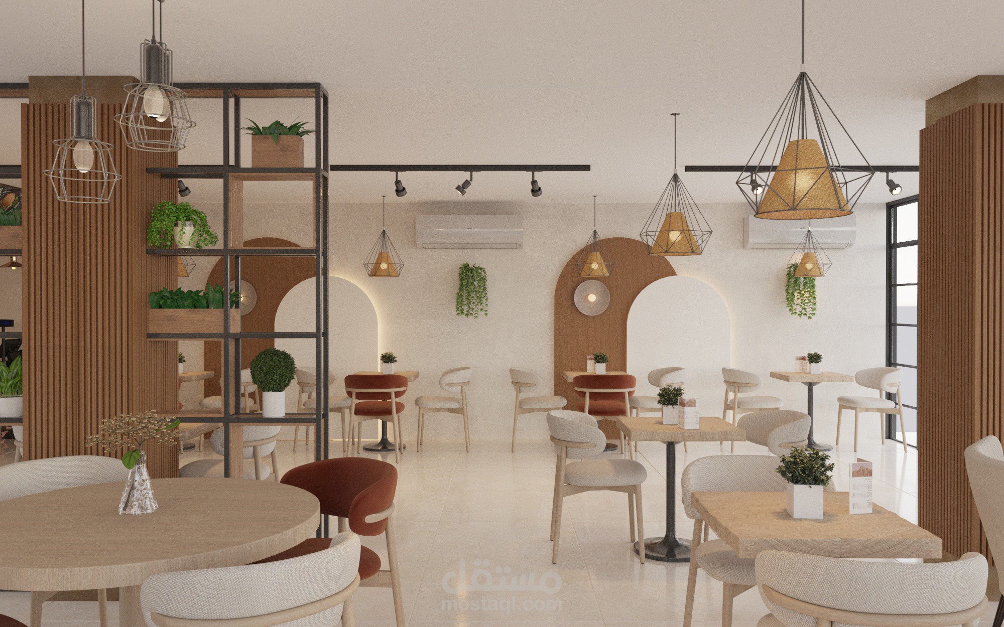 يعتمد هذا التصميم على خلق أجواء دافئة ومريحة داخل الكافيه، باستخدام خامات طبيعية وألوان هادئة تشجع الزوار على الجلوس والاستمتاع بالمكان.