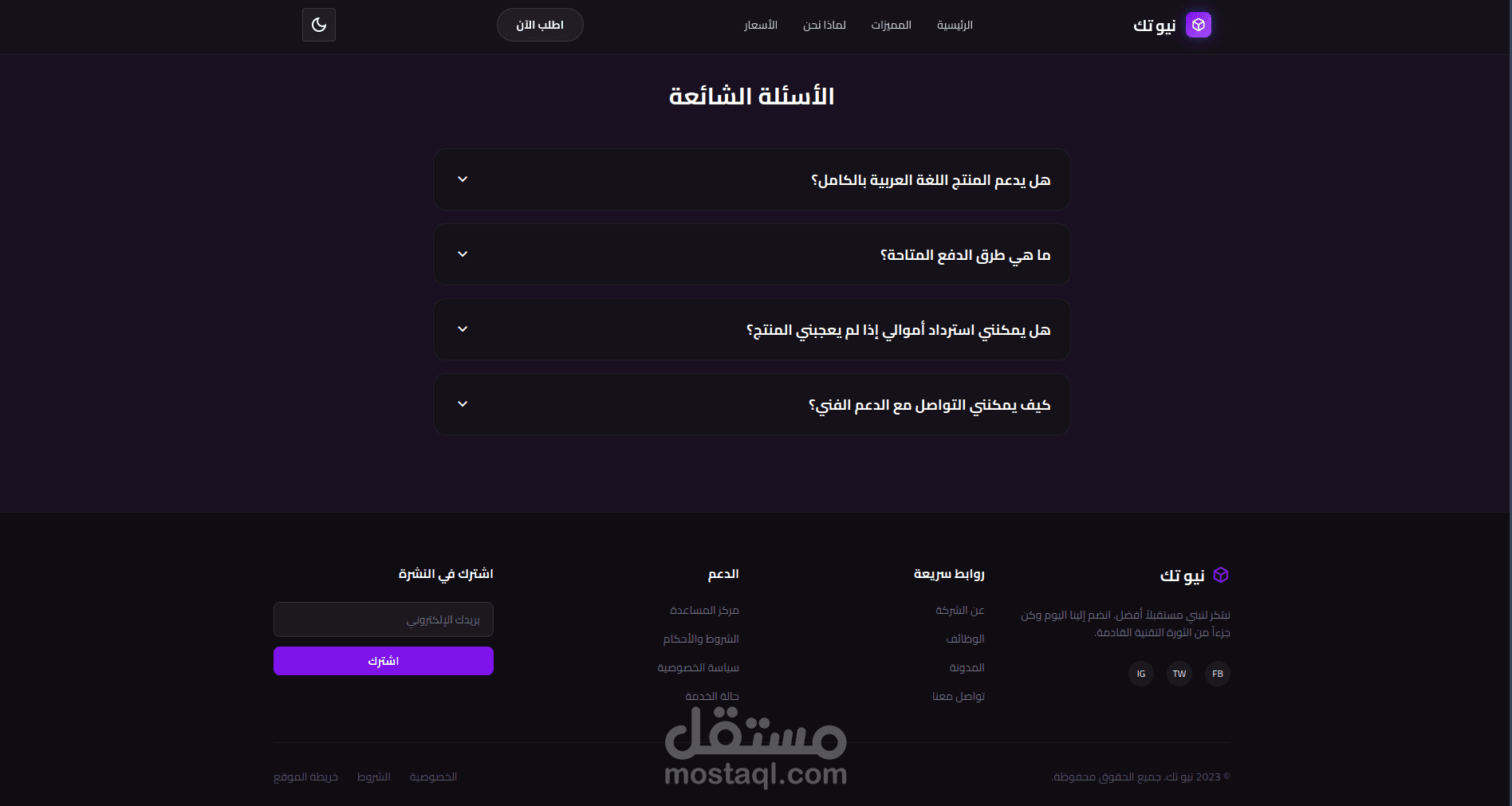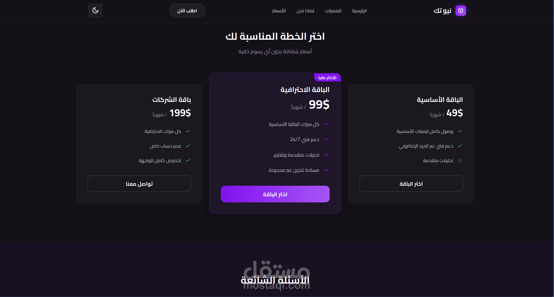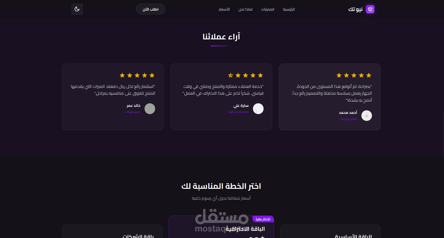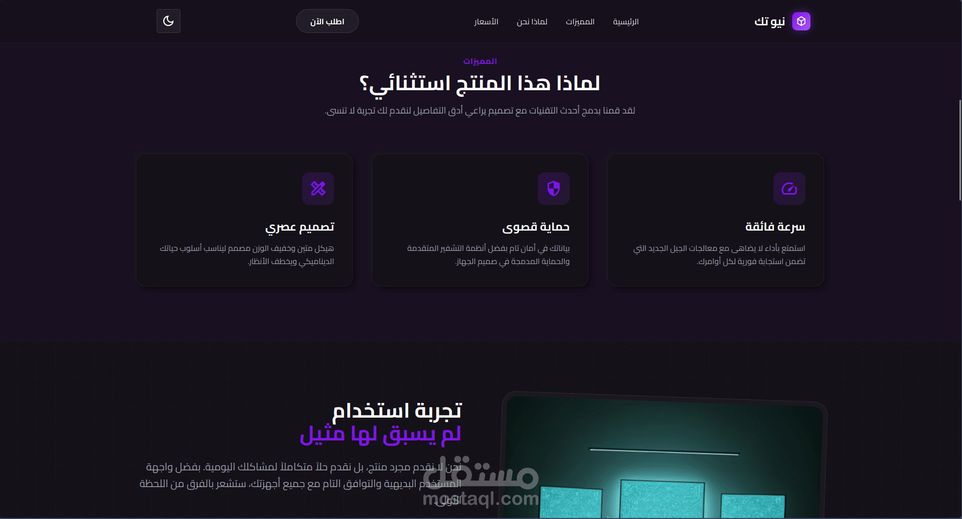 قمت بتصميم وتطوير صفحة هبوط لمنتج تكنولوجي باللغة العربية (RTL) باستخدام Tailwind CSS وHTML/JS خفيفة الوزن. تضمنت ميزات تفاعلية: قائمة موبايل قابلة للطي، تبديل السمة مع تخزين الحالة، تمرير سلس للروابط، حفظ حالة الأسئلة المتكررة، تحقق من نموذج الاشتراك مع تنبيهات، عداد عملاء متحرك، وتحميل كسول للصور لتحسين الأداء والـSEO.