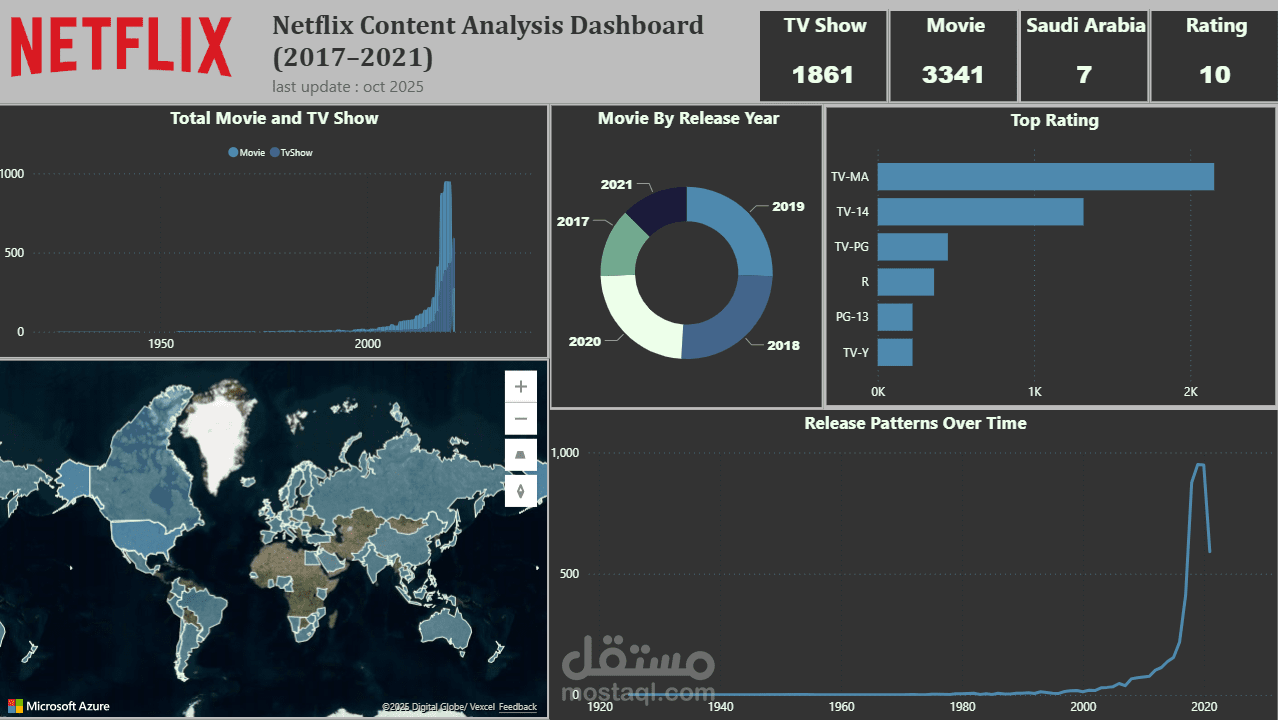 his dashboard provides an overview of Netflix content. It highlights the distribution between Movies (3,341) and TV Shows (1,861), with a focus on release patterns over time. Most movies were released between 2017 and 2021, with significant growth in recent years. The top ratings include TV-MA and TV-14, showing that mature content dominates the platform. The map visualizes Netflix availability across countries, including 7 titles from Saudi Arabia. Overall, the dashboard presents key insights into Netflix’s content library and global