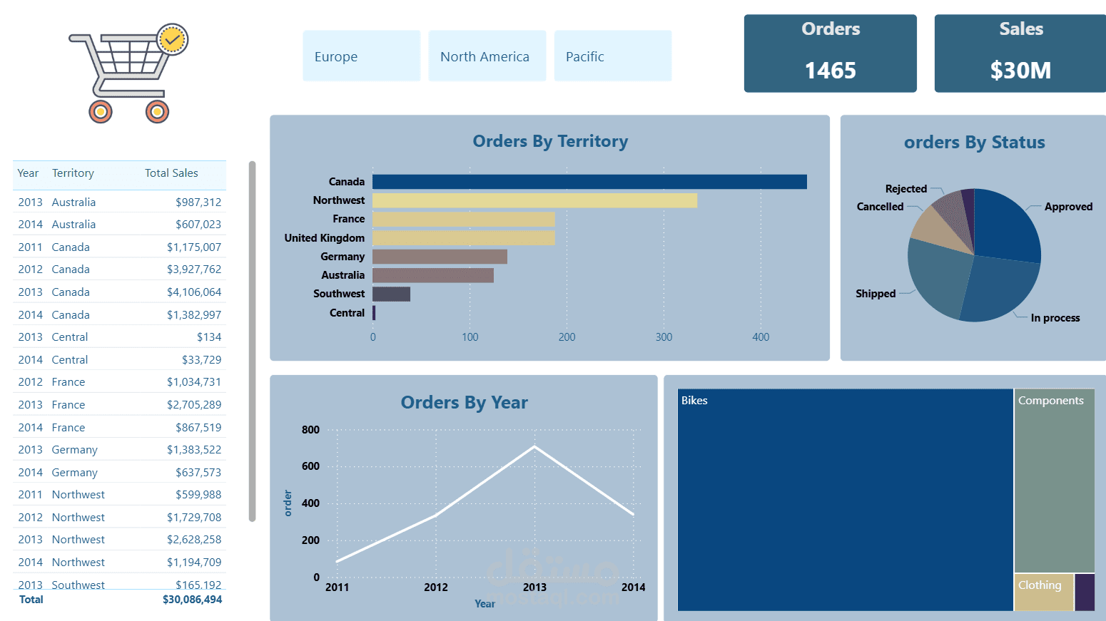This dashboard shows orders by region (Europe, North America, and Pacific) along with total price and order status.