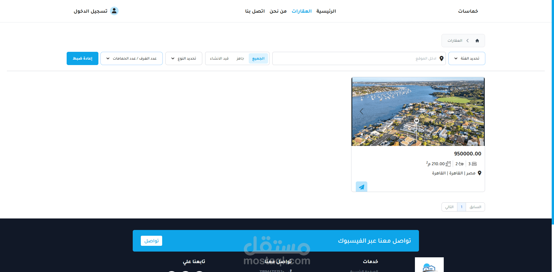 site allows users to search for properties and communicate with agents via WhatsApp and other messaging