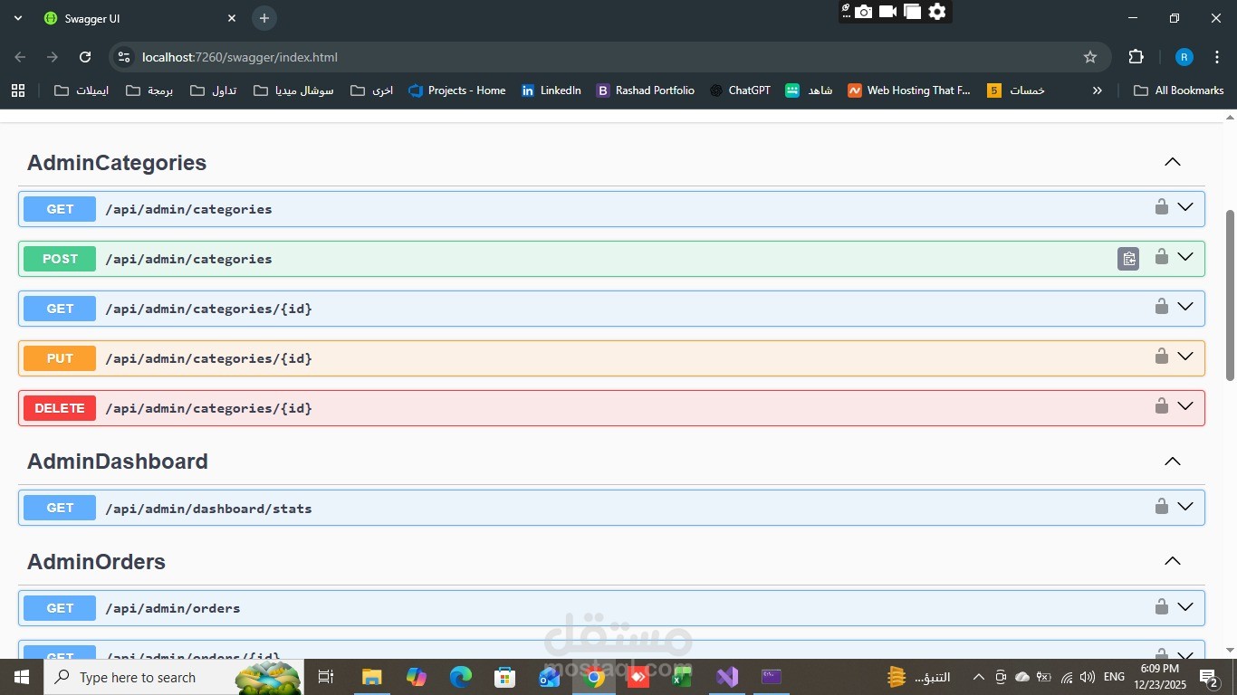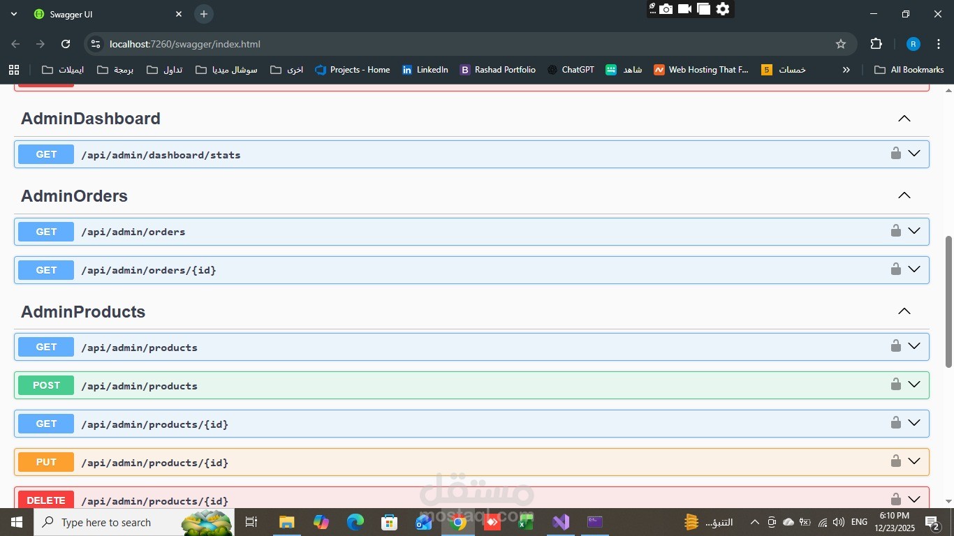 توفر الـ API نظامًا متكاملًا لإدارة المنتجات، الطلبات، ولوحة تحكم الأدمن مع حماية عالية باستخدام JWT Authentication وتوثيق كامل عبر Swagger.