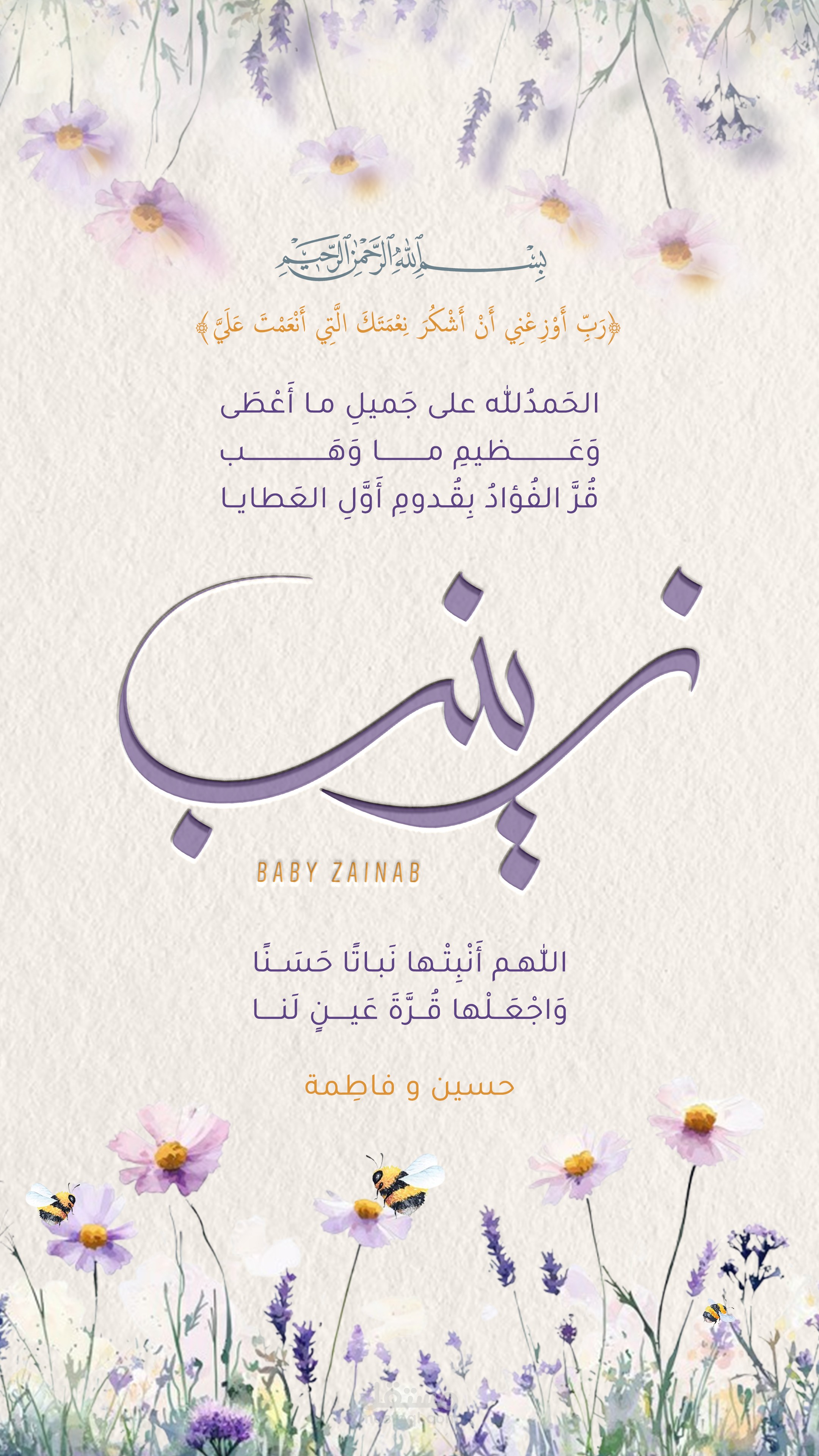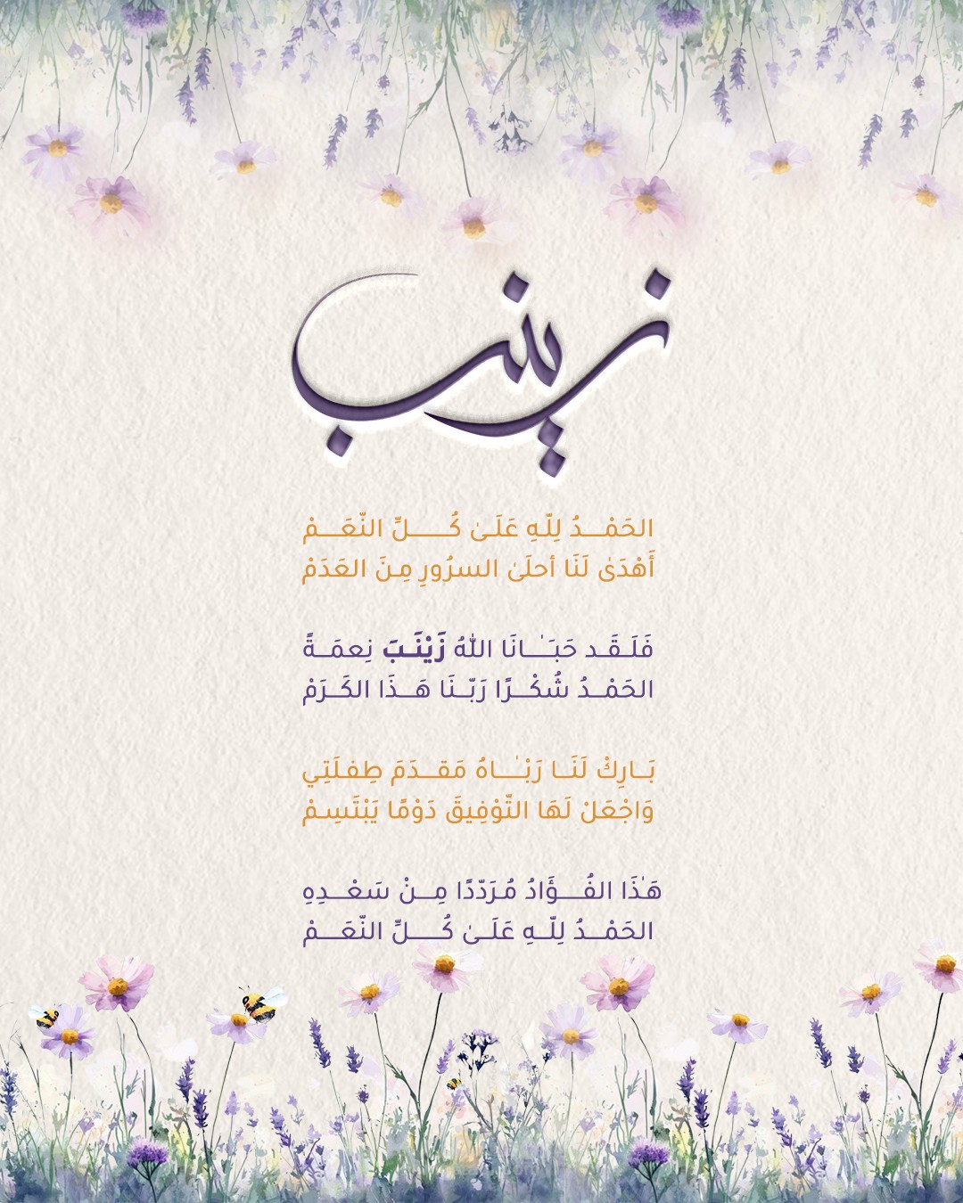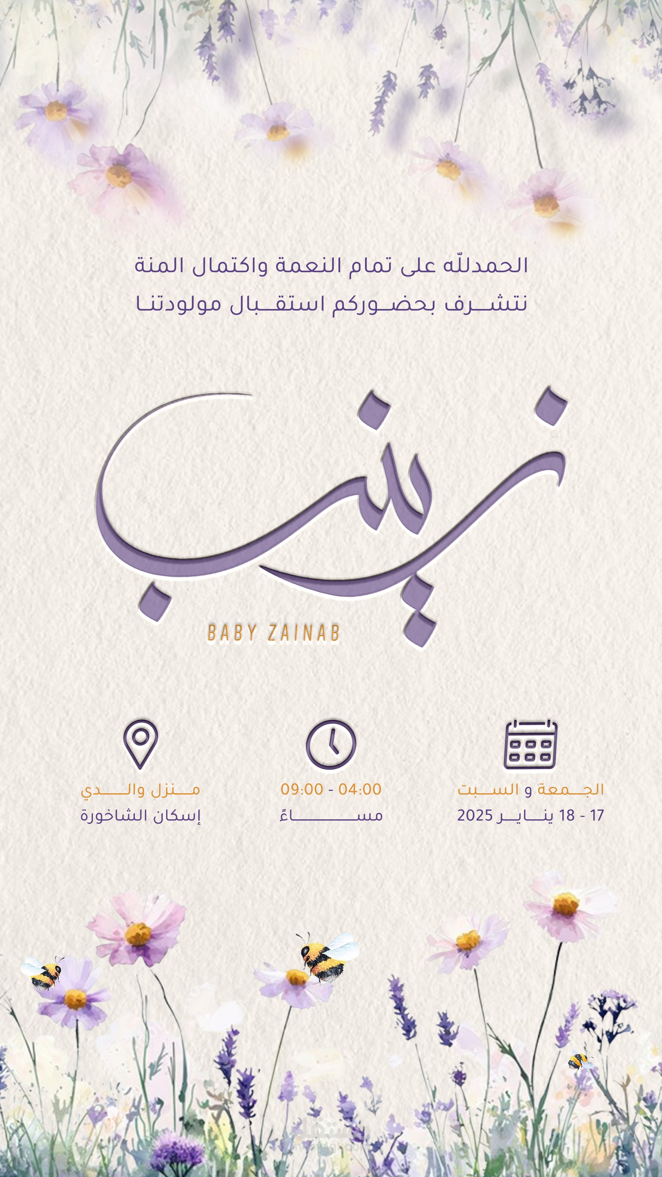 هذا العمل هو تصميم بشارة مولود احترافي يعكس أجواء الفرح والنعومة المرتبطة بقدوم المولودة الجديدة. يعتمد التصميم على أسلوب هادئ ورقيق بألوان طفولية دافئة مستوحاة من الزهور والبهجة، مع دمج عناصر فنية ناعمة لتمنح العمل طابعًا راقيًا ومعبّرًا. تم استخدام برنامج Photoshop لتنسيق الألوان، ومعالجة التفاصيل، وإضافة لمسات ضوئية خفيفة تمنح التصميم عمقًا وجمالًا. كما جرى اختيار خطوط واضحة وأنيقة تناسب هوية المناسبة، ما نتج عنه بشارة مميزة تُعبّر عن مشاعر الترحيب والحب، وتصلح للمشاركة على وسائل التواصل الاجتماعي والتهنئة بين الأهل والأصدقاء.