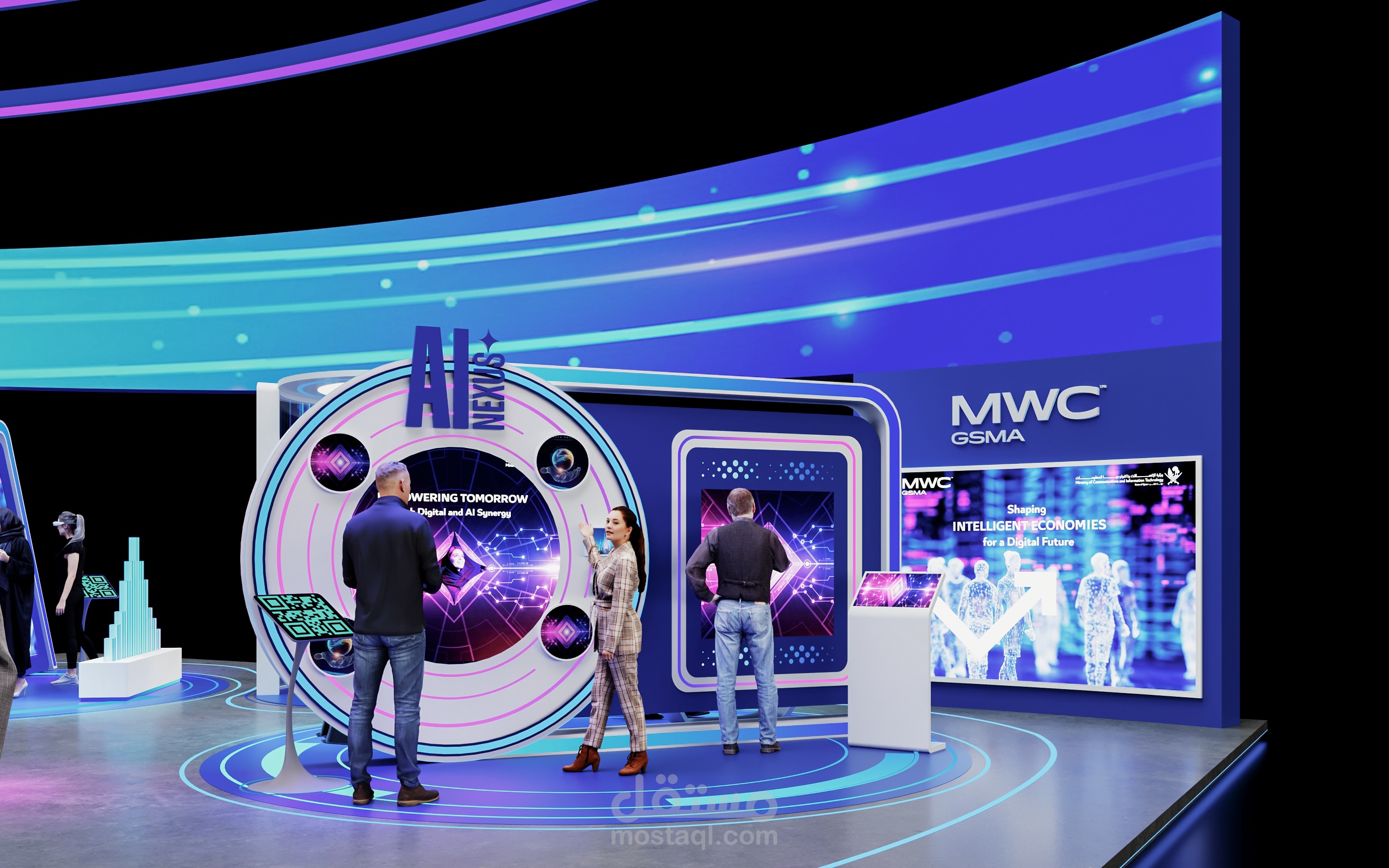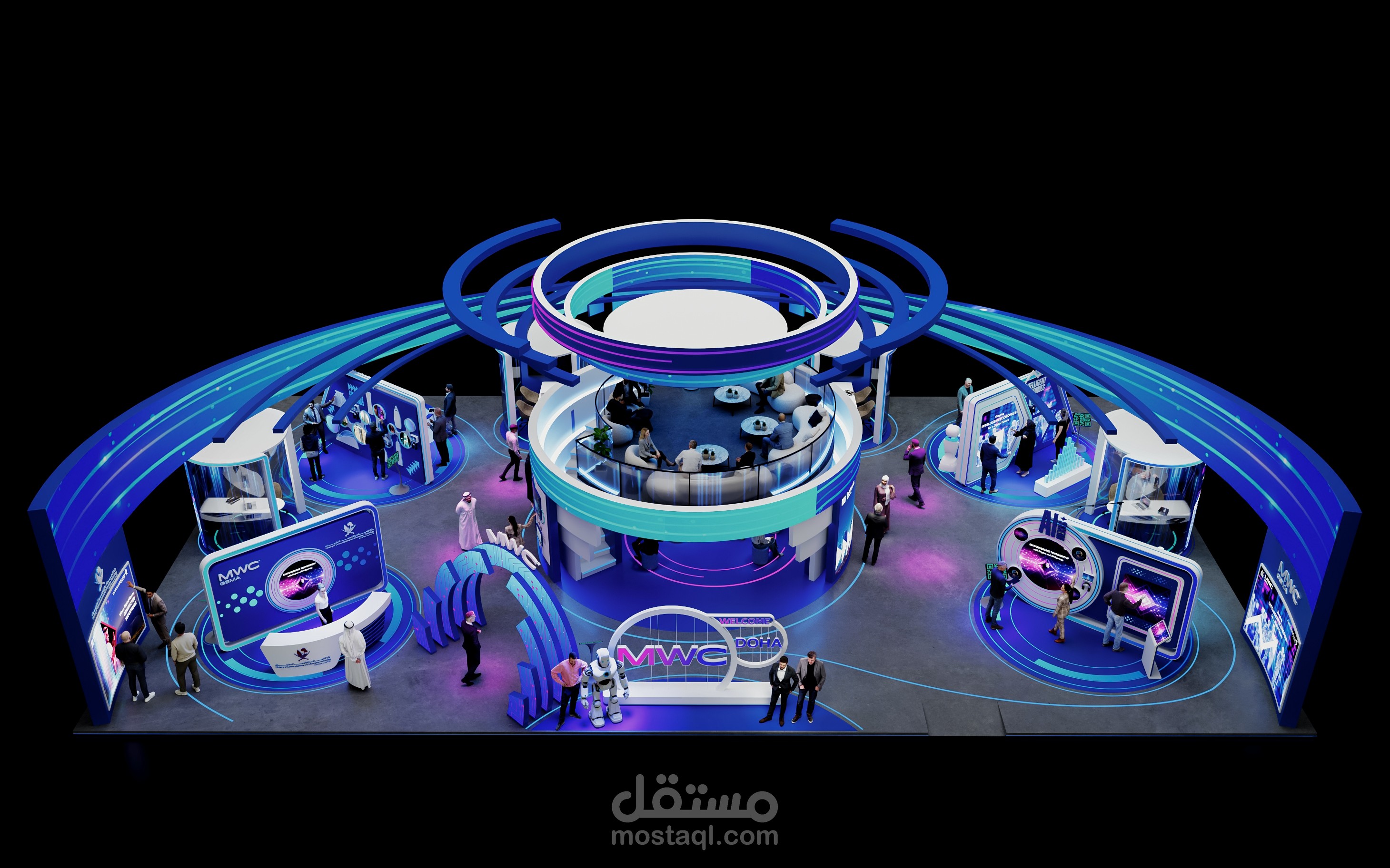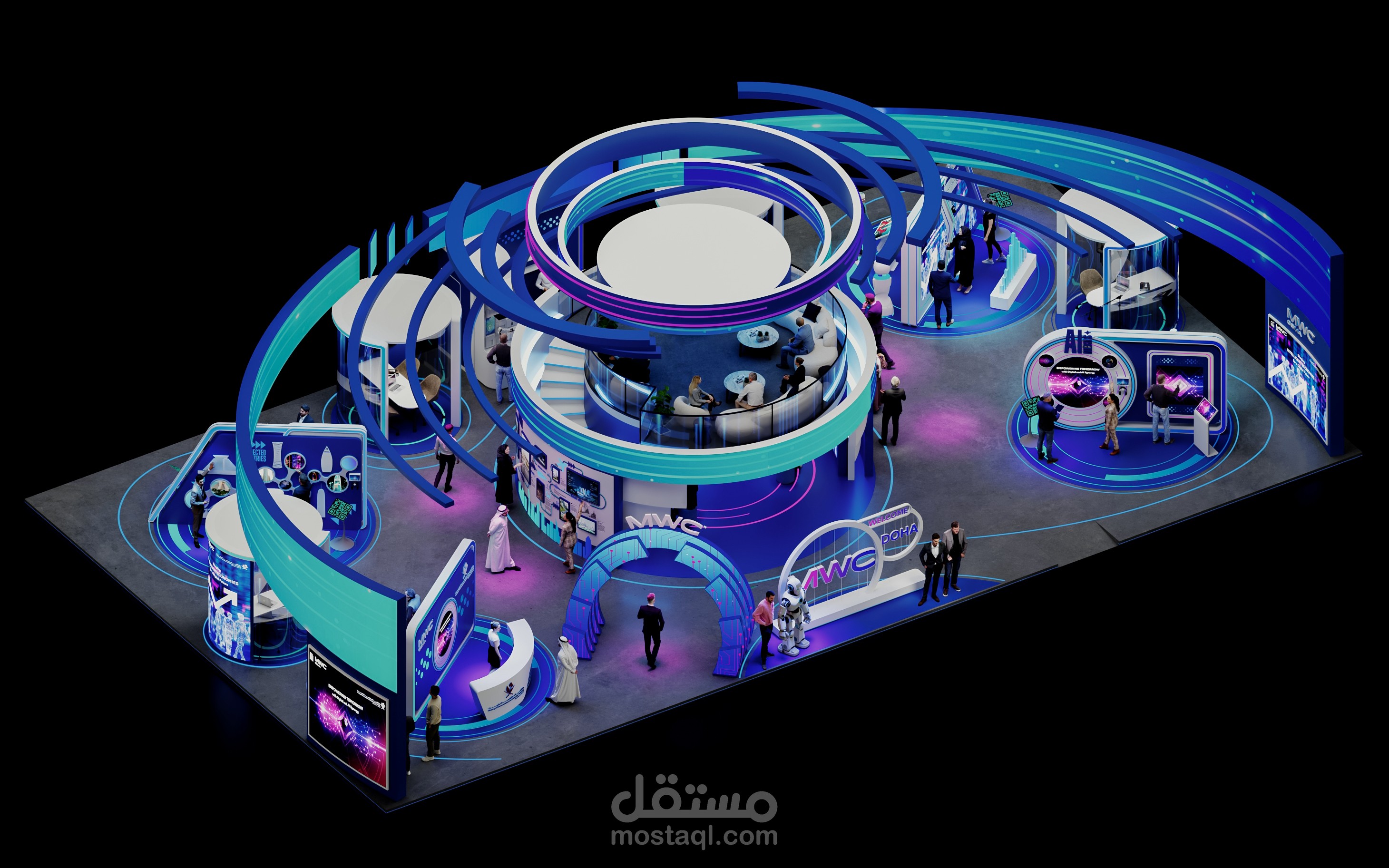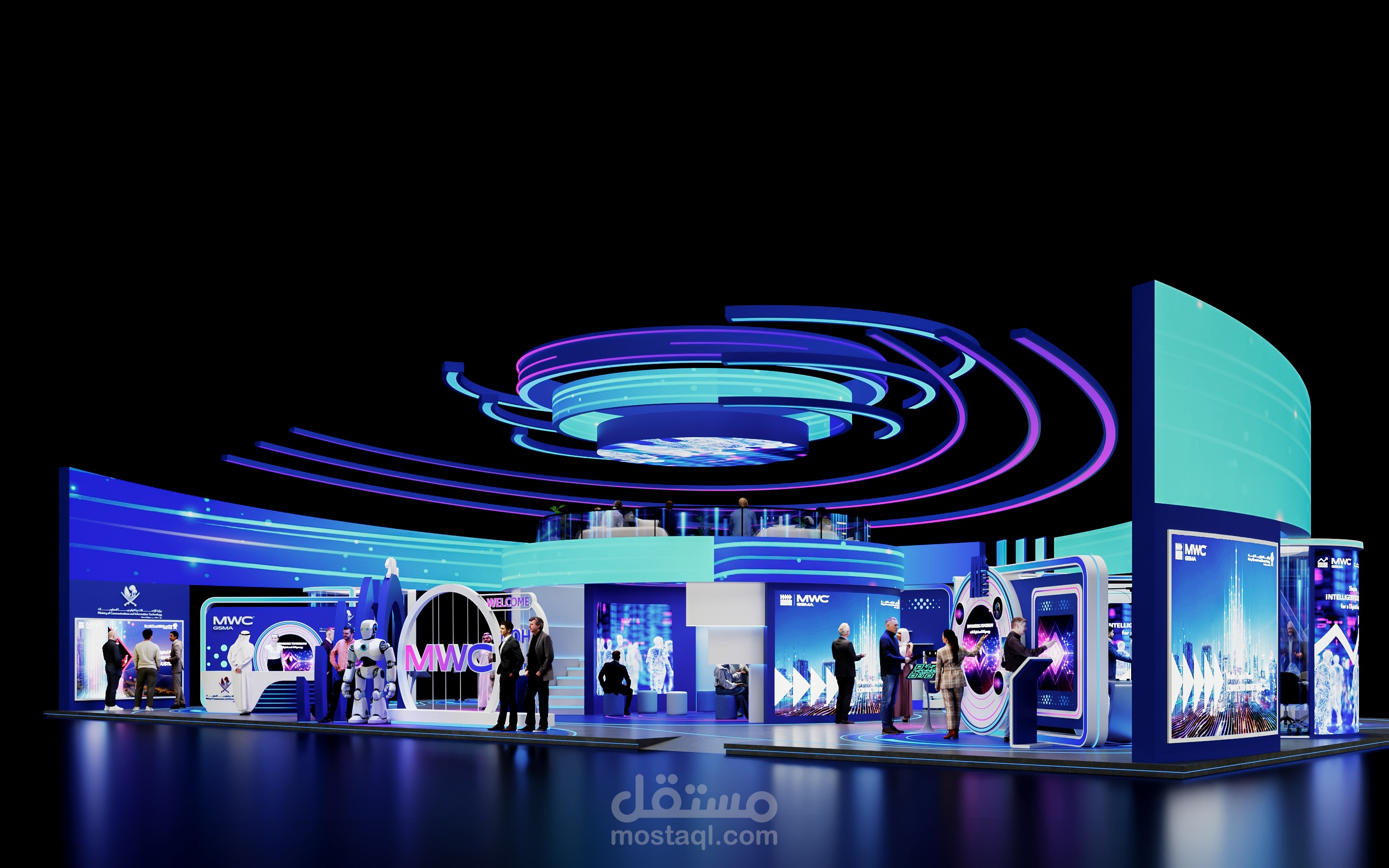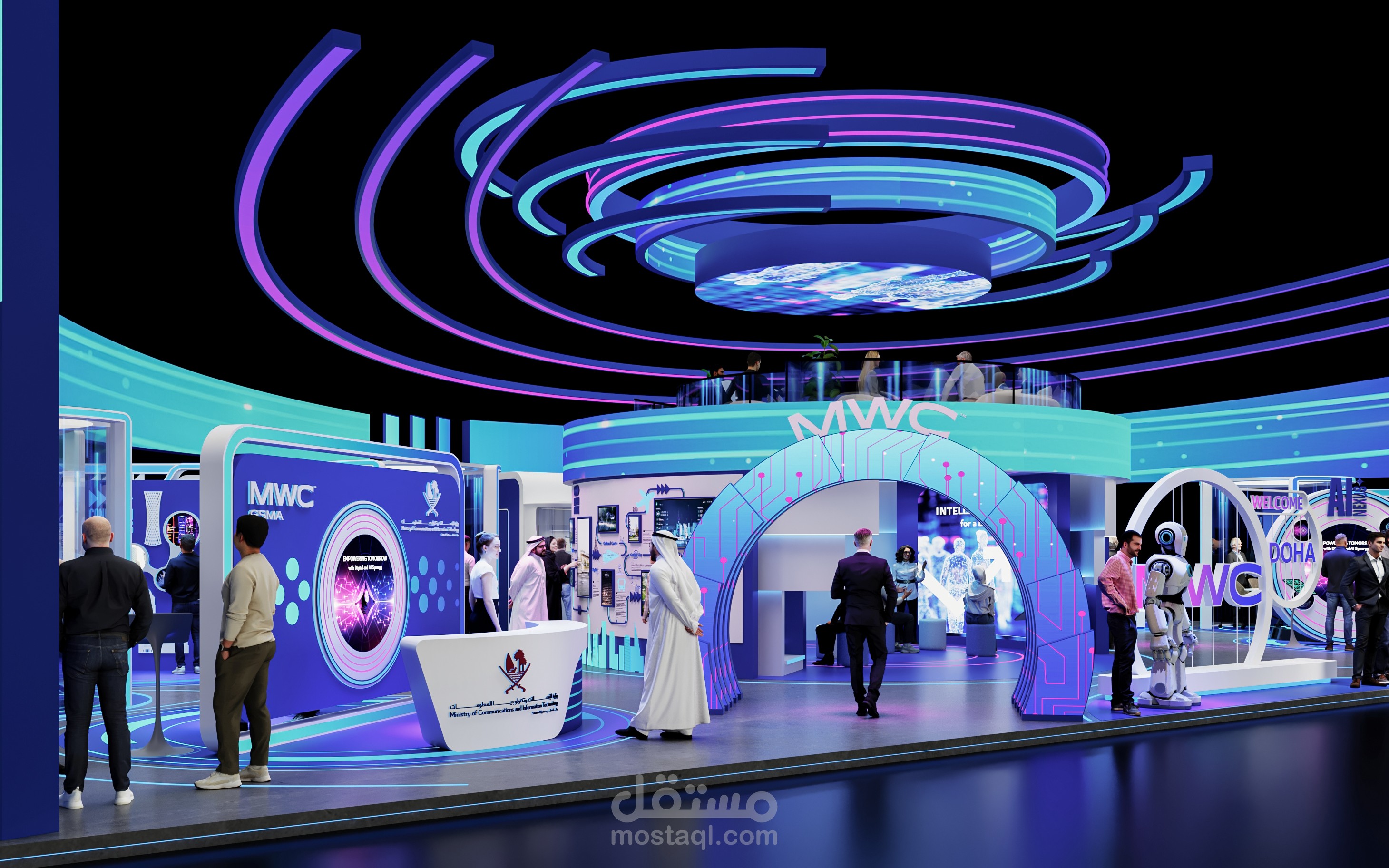 تتكامل الإضاءة عالية التقنية والهوية البصرية الحديثة لتقديم تجربة مستقبلية تعكس رؤية MWC25 Doha وMCIT.