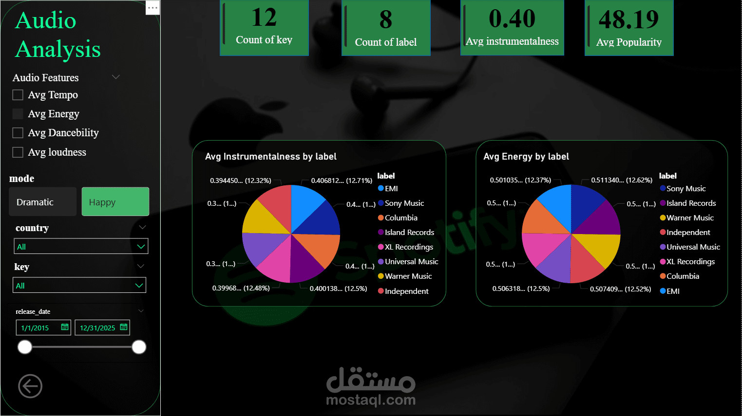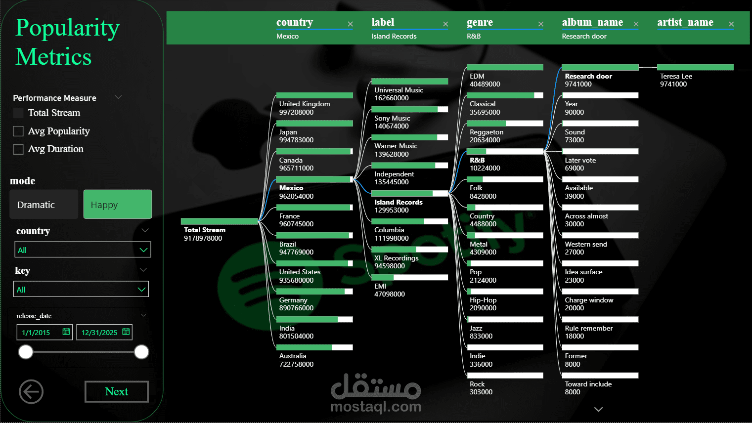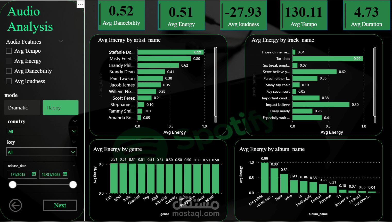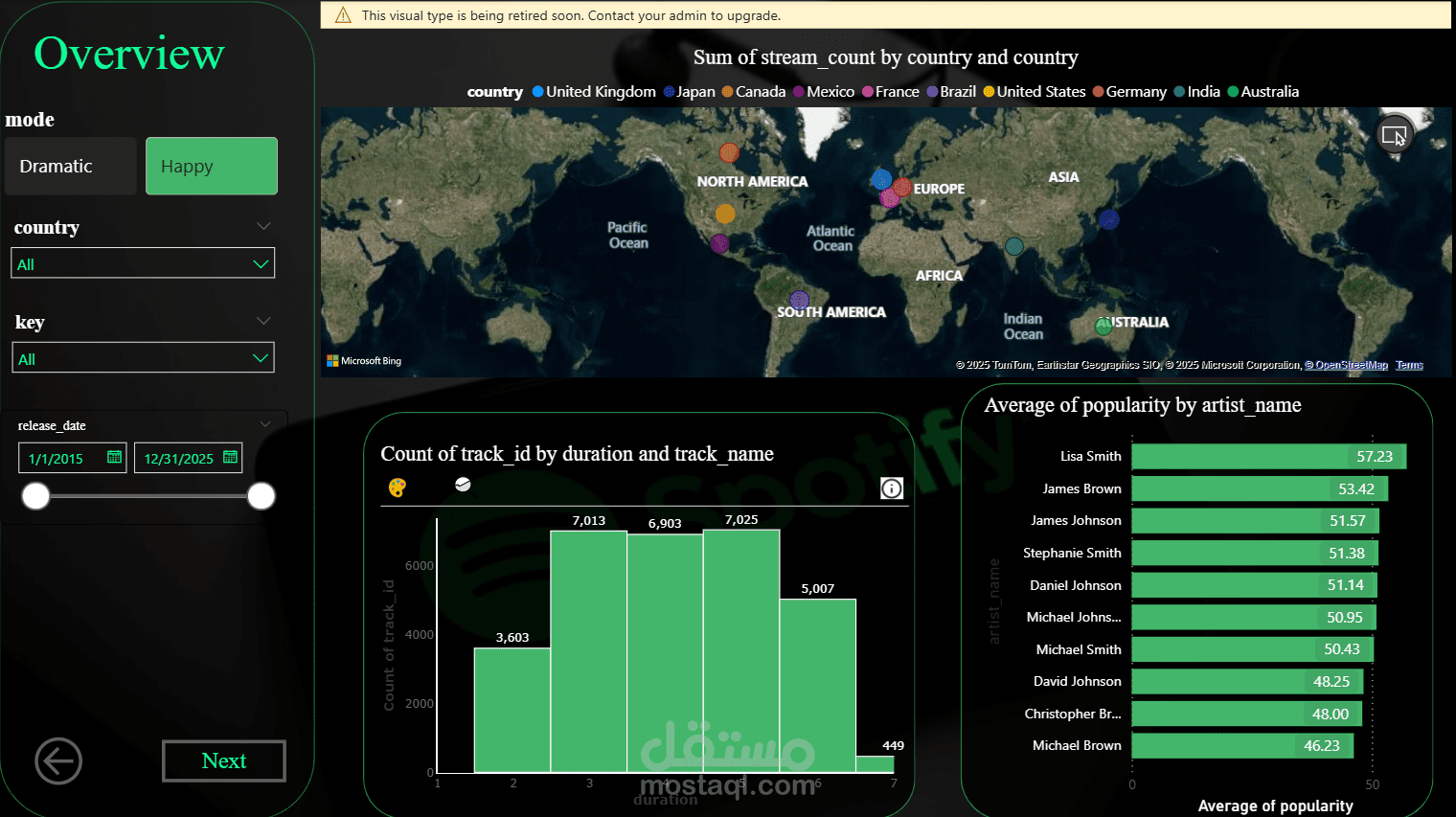 شمل هذا المشروع تحليل بيانات موسيقى Spotify عبر مراحل متعددة، منها معالجة البيانات الأولية، التصور البياني، وإنشاء لوحة تحكم باستخدام Python وTableau وPower BI وExcel. كان دوري الرئيسي تطوير لوحة تحكم Power BI التي قدمت رؤى حول أداء الأغاني، خصائص الصوت، وبنية الأغاني، مما ساعد في استخلاص رؤى مهمة للأعمال وسلوك المستخدمين.