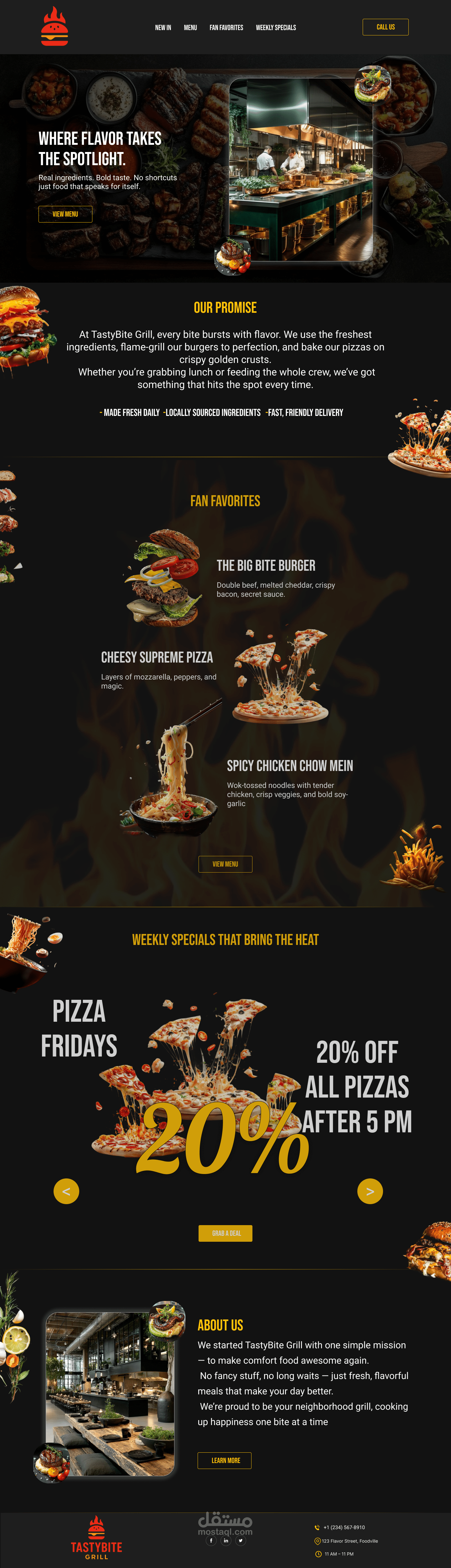 تم تصميم الواجهة بأسلوب عصري وجذّاب، مع تنظيم المحتوى بشكل واضح وسهل التصفح، واستخدام ألوان قوية وصور جذابة تعكس أجواء المطعم وتزيد من تفاعل المستخدم.