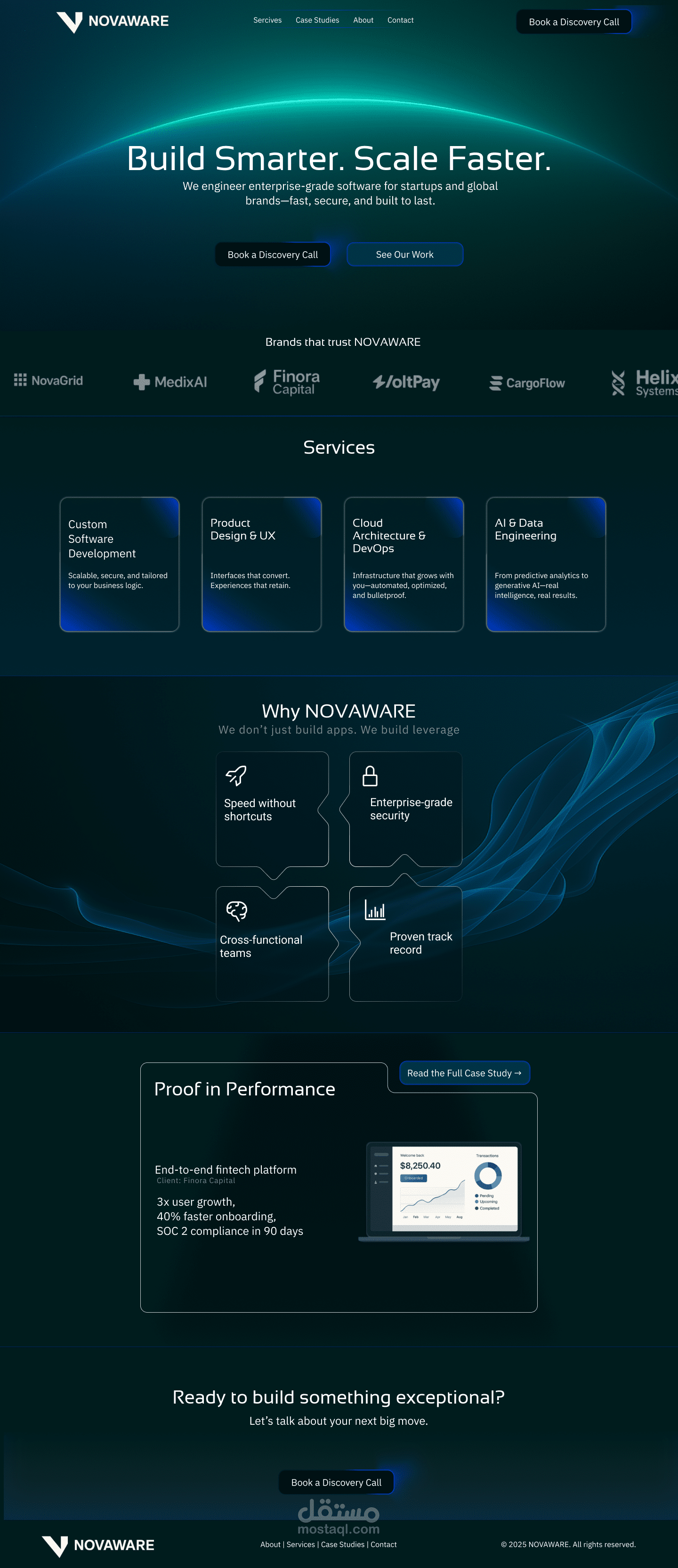 يركّز التصميم على تحسين تجربة المستخدم، إبراز نقاط القوة، وتوجيه الزائر إلى الإجراءات الأساسية مثل حجز مكالمة أو استعراض الأعمال السابقة.