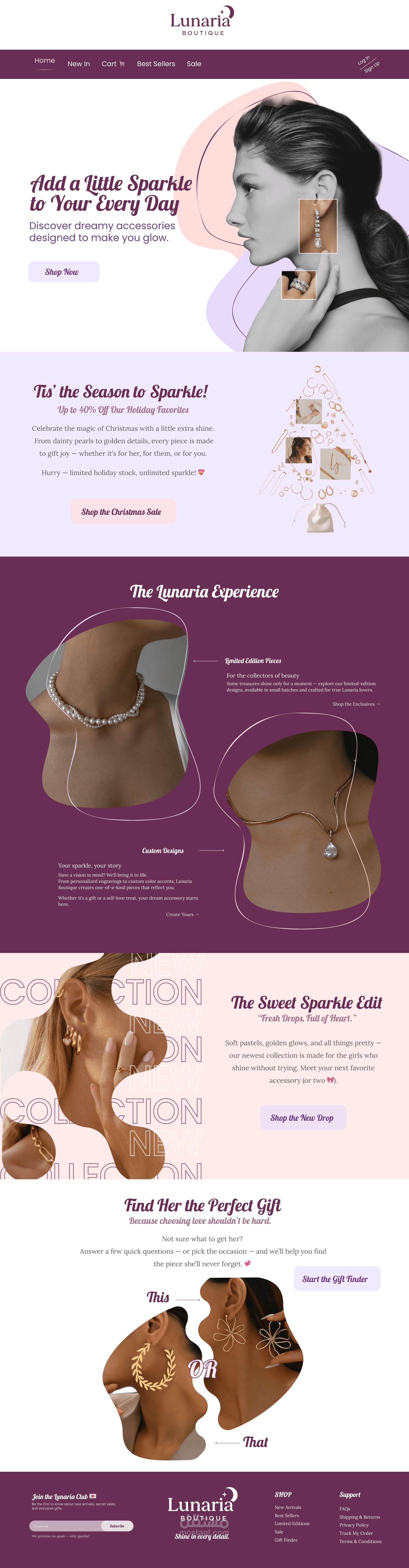 قمت بتصميم واجهة وتجربة مستخدم (UI/UX) لصفحة هبوط خاصة بمتجر إلكتروني للمجوهرات، مع التركيز على إبراز الطابع الأنثوي، الأناقة، وسهولة التصفح.