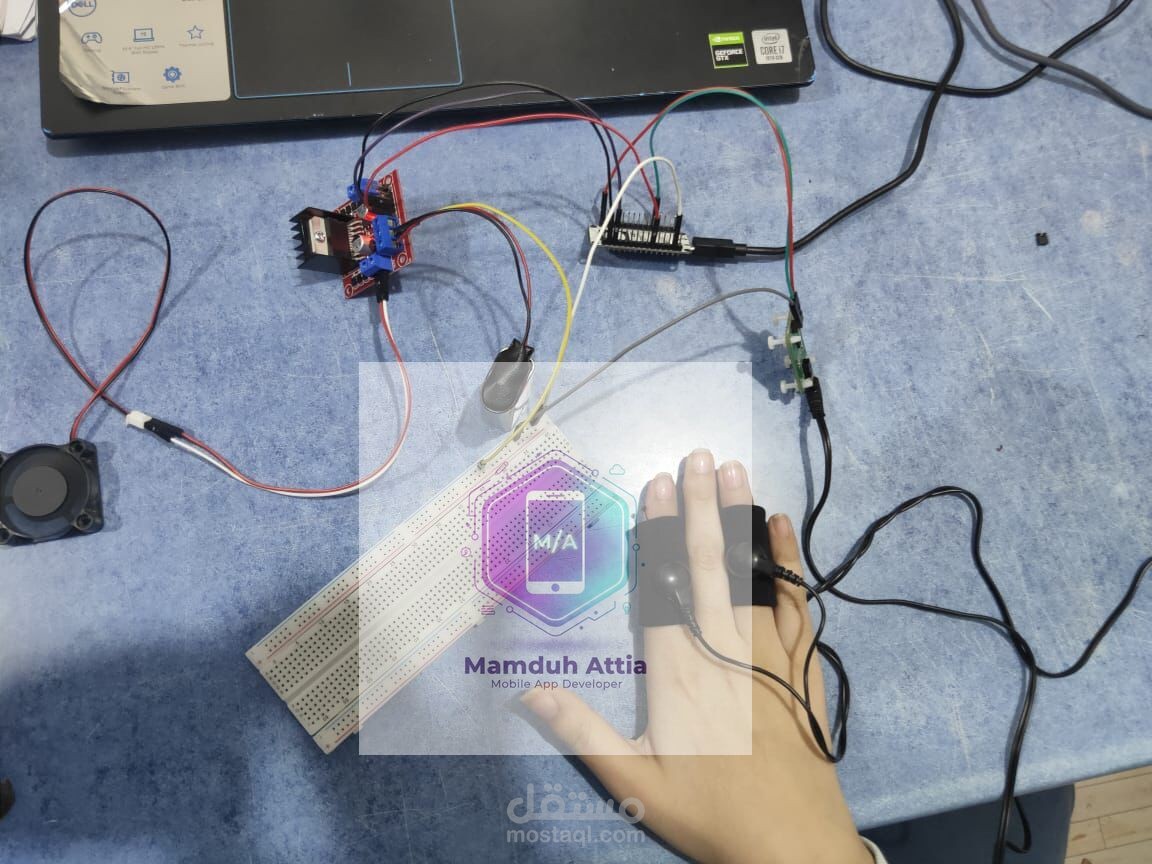 تصميم جزء Hardware يعتمد على مروحة تهوية لراحة يد المريض، خصوصًا في حالات القيادة لتقليل مخاطر الحوادث الناتجة عن التعرّق الشديد.
