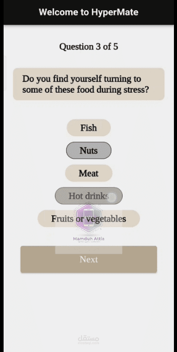 يعتمد HyperMate على مراقبة مؤشرات التوتر لدى المستخدم باستخدام GSR Sensor متصل بوحدة ESP8266 يتم ربطها بالتطبيق عبر Wi-Fi، حيث يتم عرض القراءات لحظيًا داخل التطبيق وتحليلها لتقديم توصيات مخصصة.