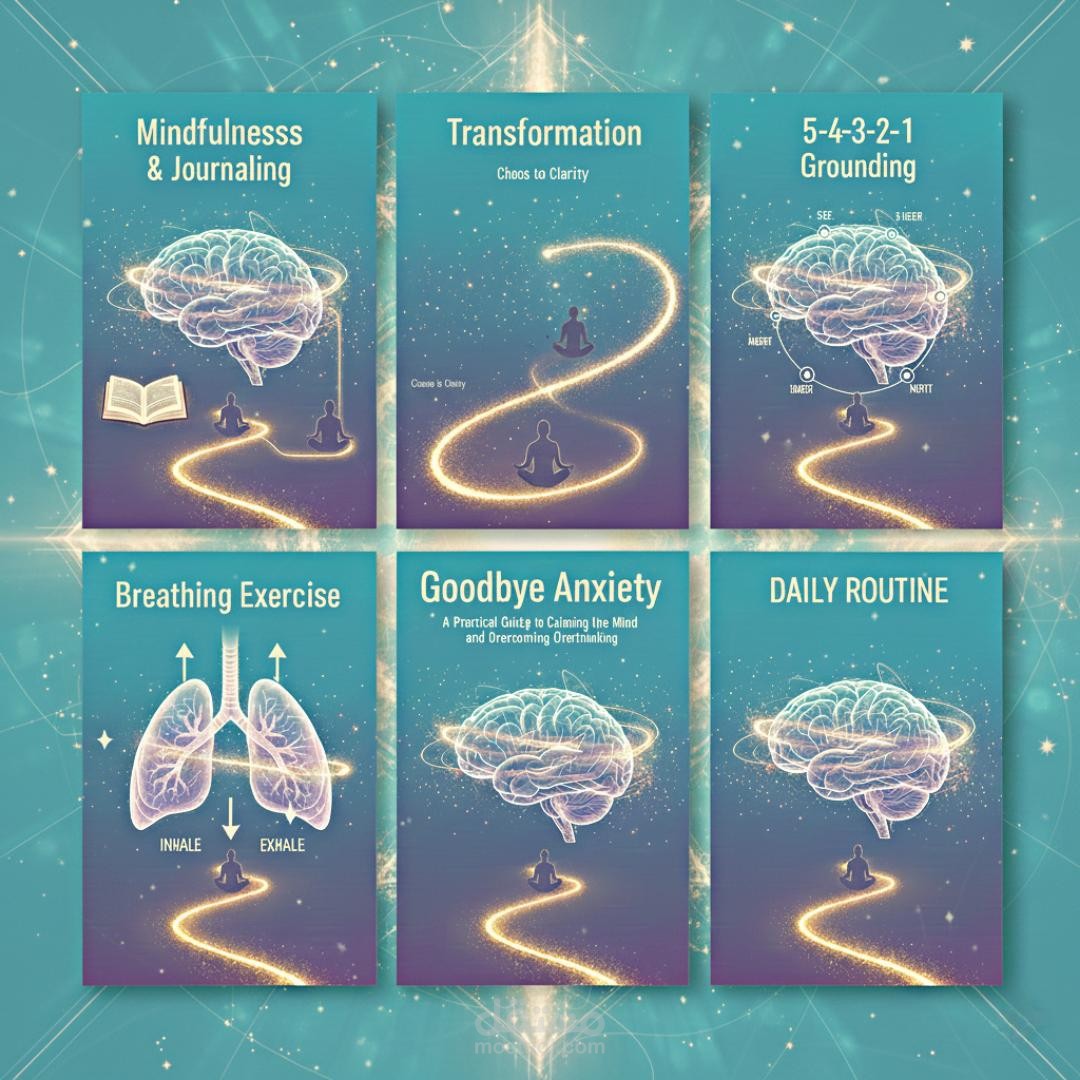 A serene and conceptual visual design symbolizing mental clarity, inner peace, and relief from anxiety. The glowing brain, flowing light path, and meditative figure create a harmonious composition that conveys calmness, balance, and mindfulness. Suitable for wellness-themed visuals, inspirational graphics, mental health awareness content, and creative projects focused on tranquility and emotional well-being.