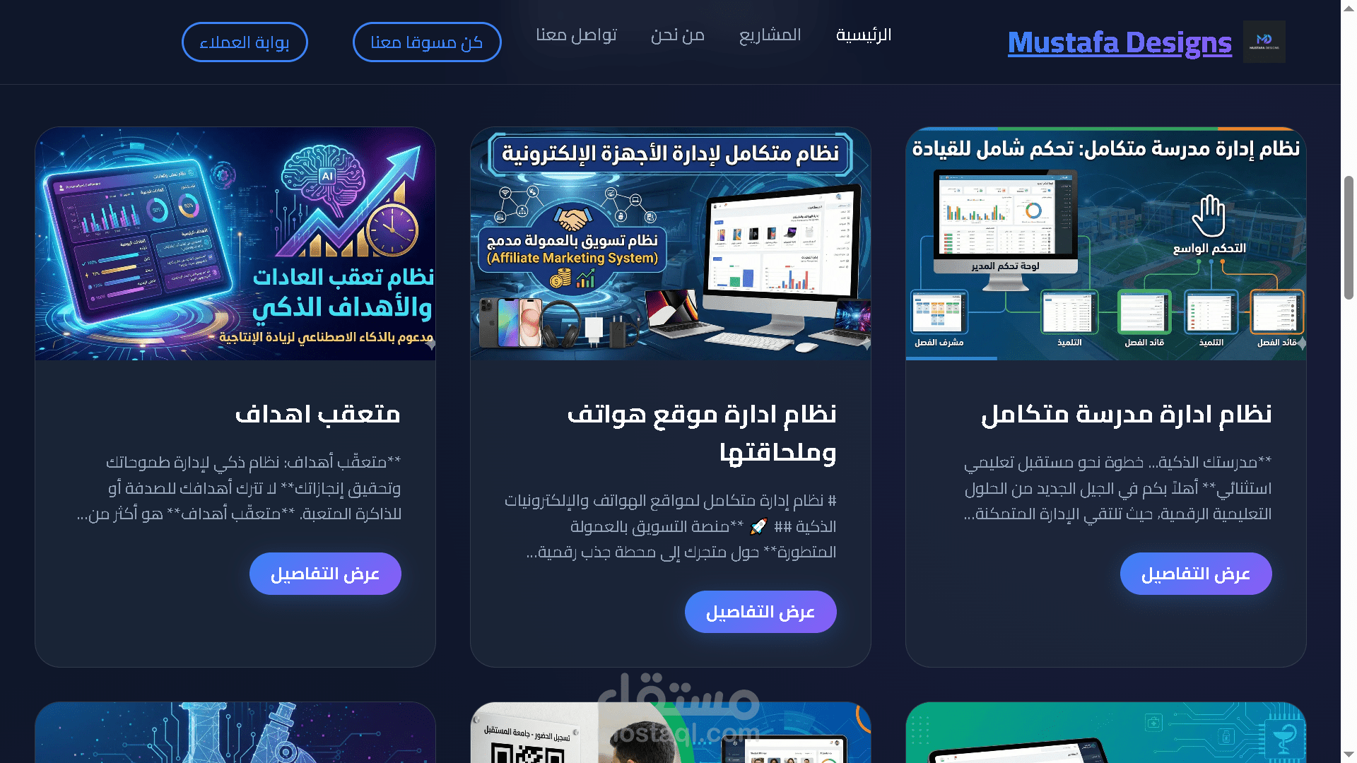 معرض أعمال ديناميكي: عرض المشاريع السابقة مع إمكانية إضافة تفاصيل لكل مشروع (صور، وصف، لغات المستخدمة).