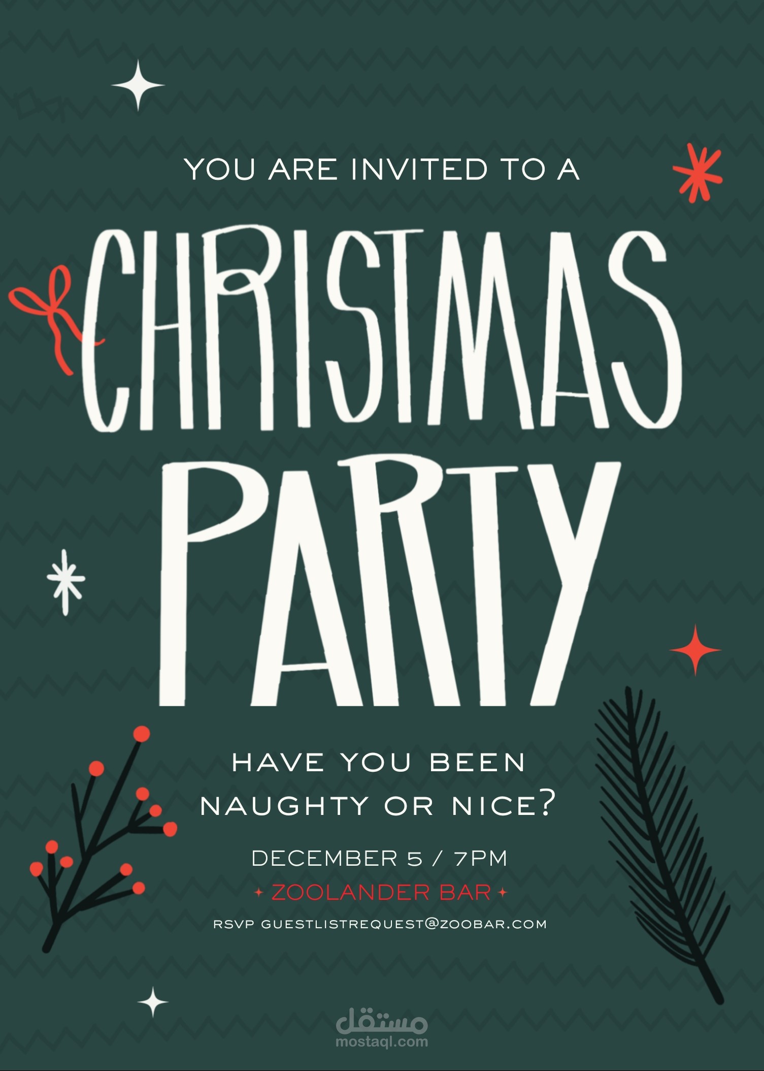الخطوط الحيوية: استخدام خط يدوي عريض ومرتفع لكلمة "CHRISTMAS PARTY" يعطي طابعاً مرحاً وغير رسمي، مما يشجع الضيوف على الشعور بالحماس للاحتفال.