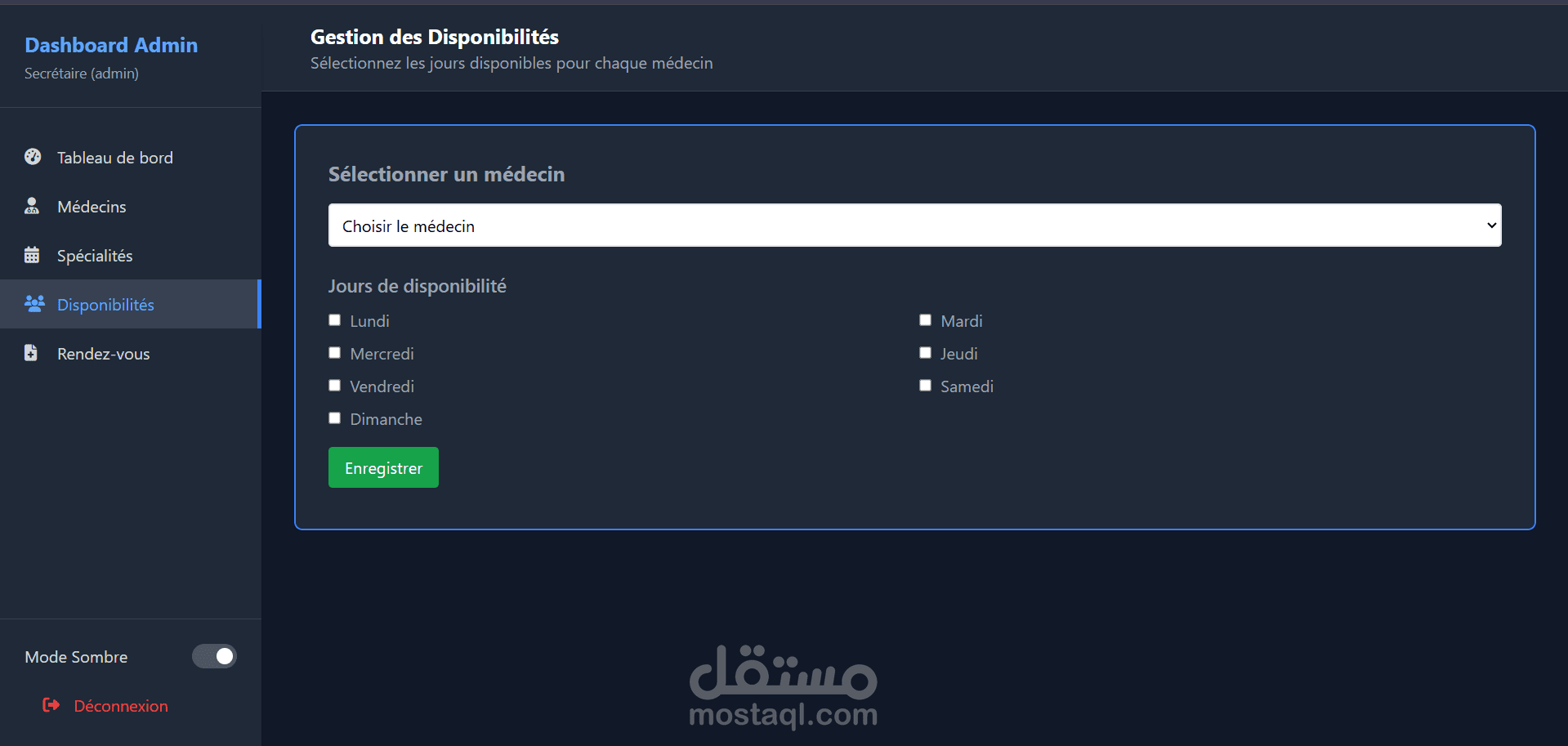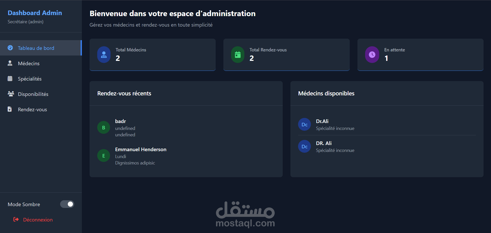 Dashboard احترافي لتسيير عيادة طبية موجه للسكرتيرة أو الأدمن