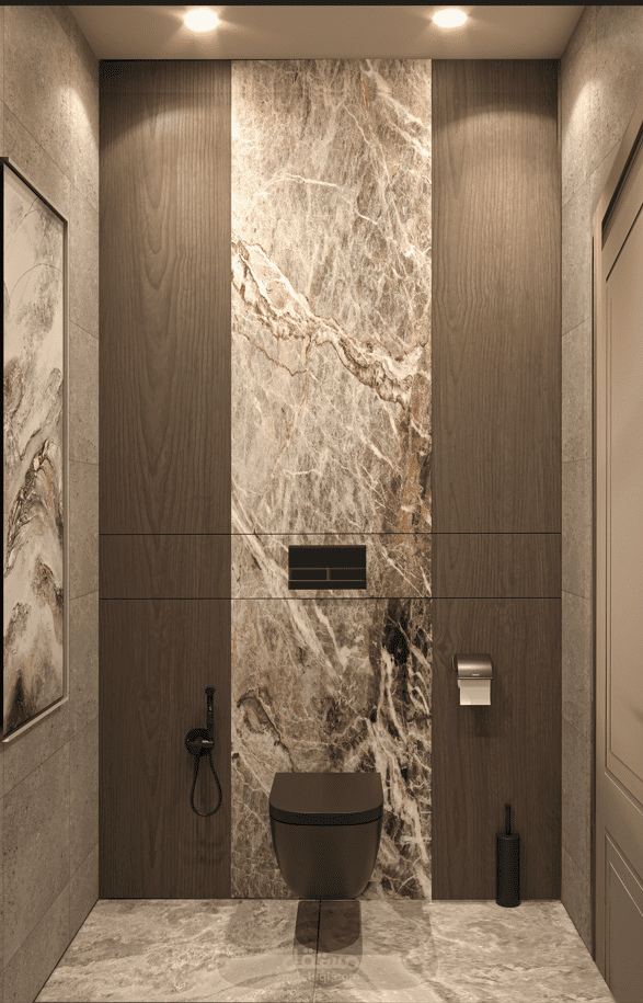 Minimalist bathroom design visualization showcasing natural stone textures, warm lighting, and modern elegance.
