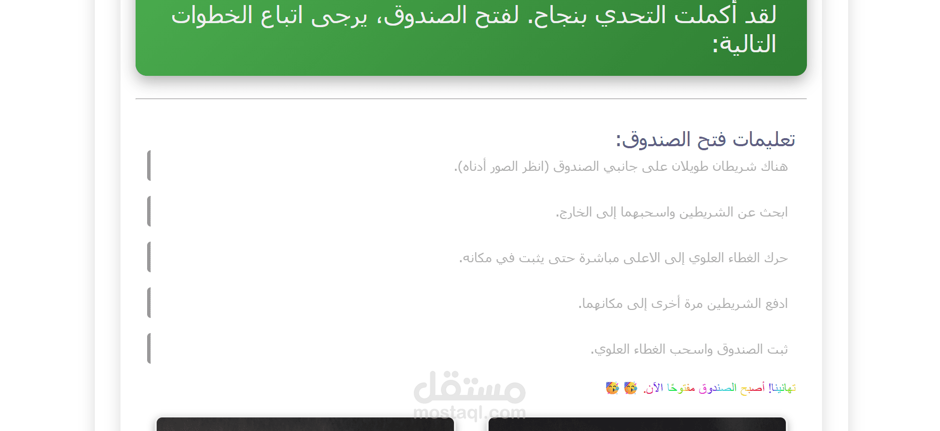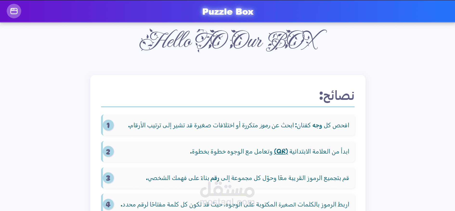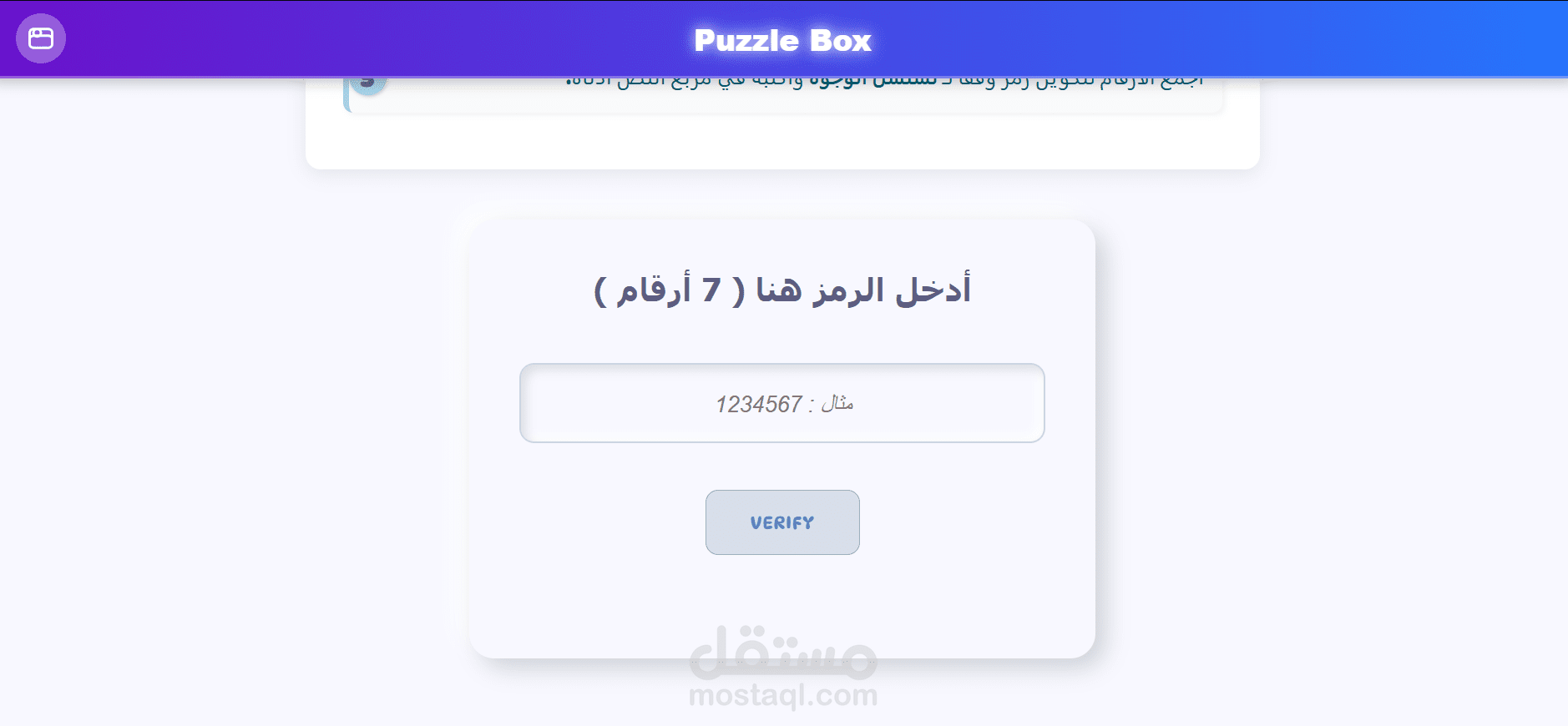 قمت بتصميم وتطوير موقع ويب تفاعلي يعمل كمساعد لمشروع Puzzle Box، باستخدام تقنيات HTML وCSS وJavaScript. يعتمد الموقع على آلية تحقق بسيطة وفعّالة، حيث يُشترط على المستخدم إدخال رقم صحيح ومحدد من أجل إتمام عملية الدخول بنجاح، ما يبرز مفهوم التفاعل المنطقي (Logic-based Interaction) باستخدام JavaScript.