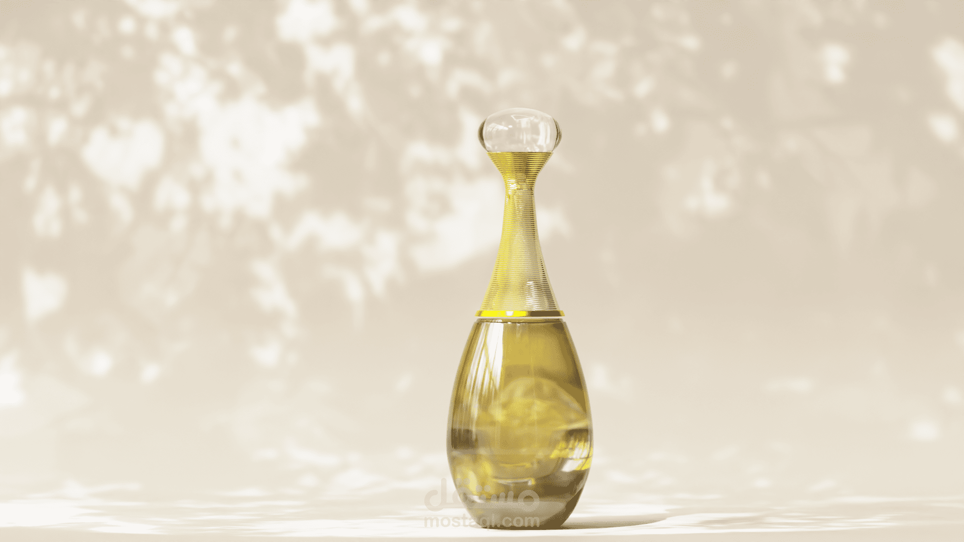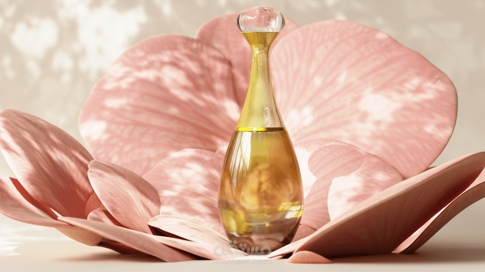 تم التركيز على تحقيق واقعية عالية في خامات الزجاج والسائل الداخلي، مع إضاءة ناعمة ونظيفة تناسب الإعلانات الخاصة بمنتجات العناية والجمال.