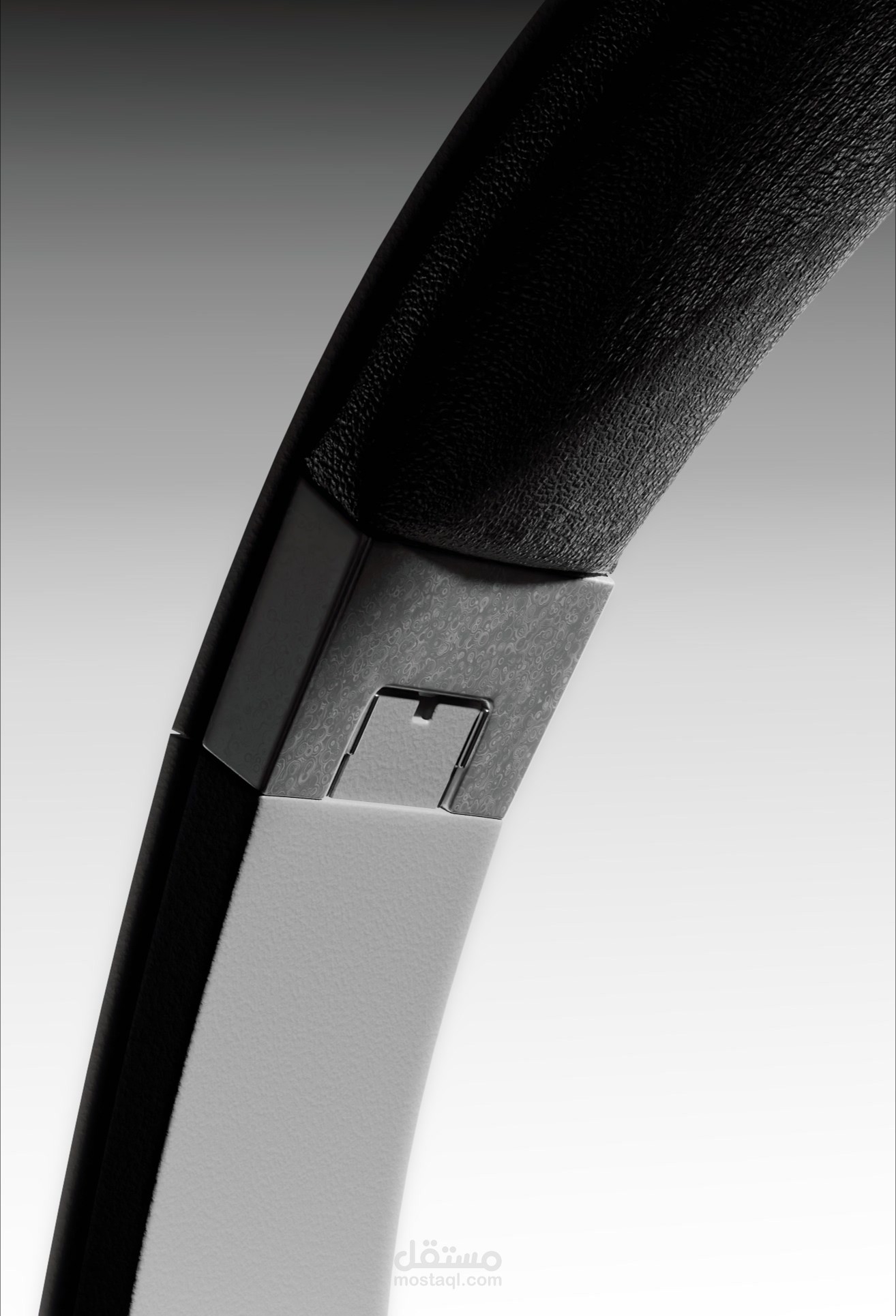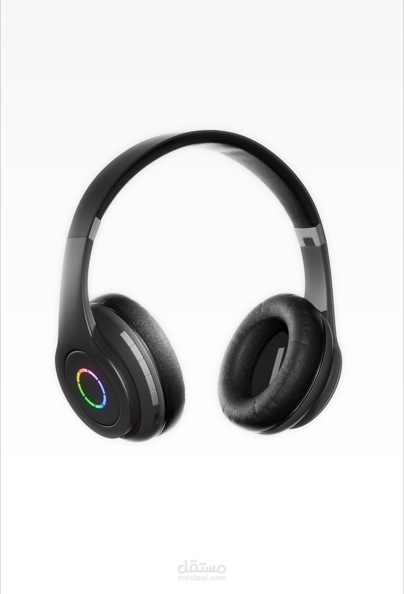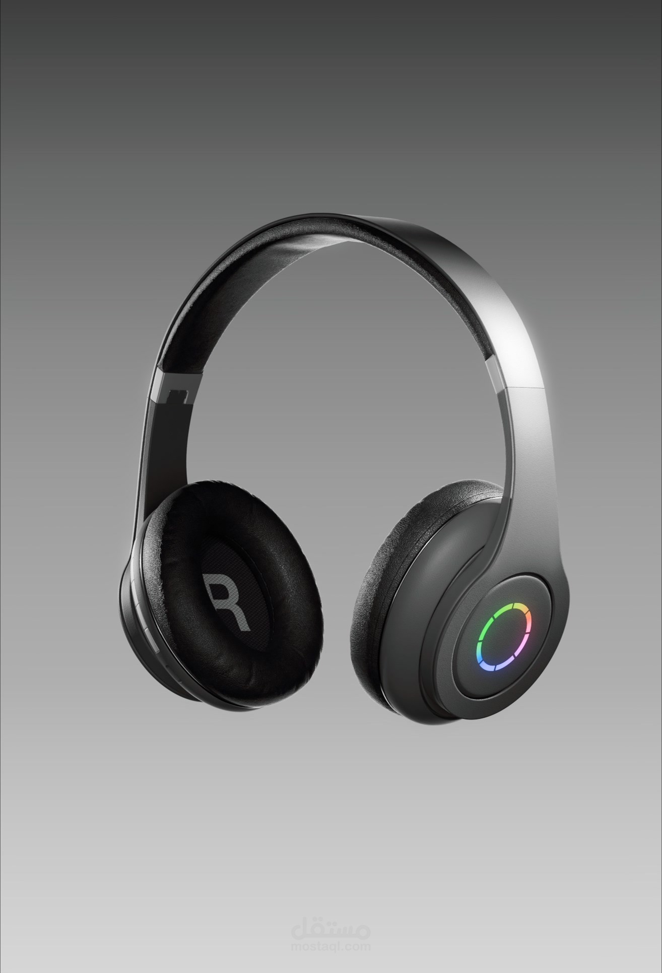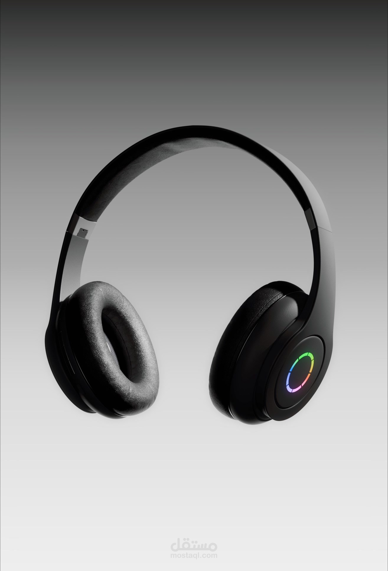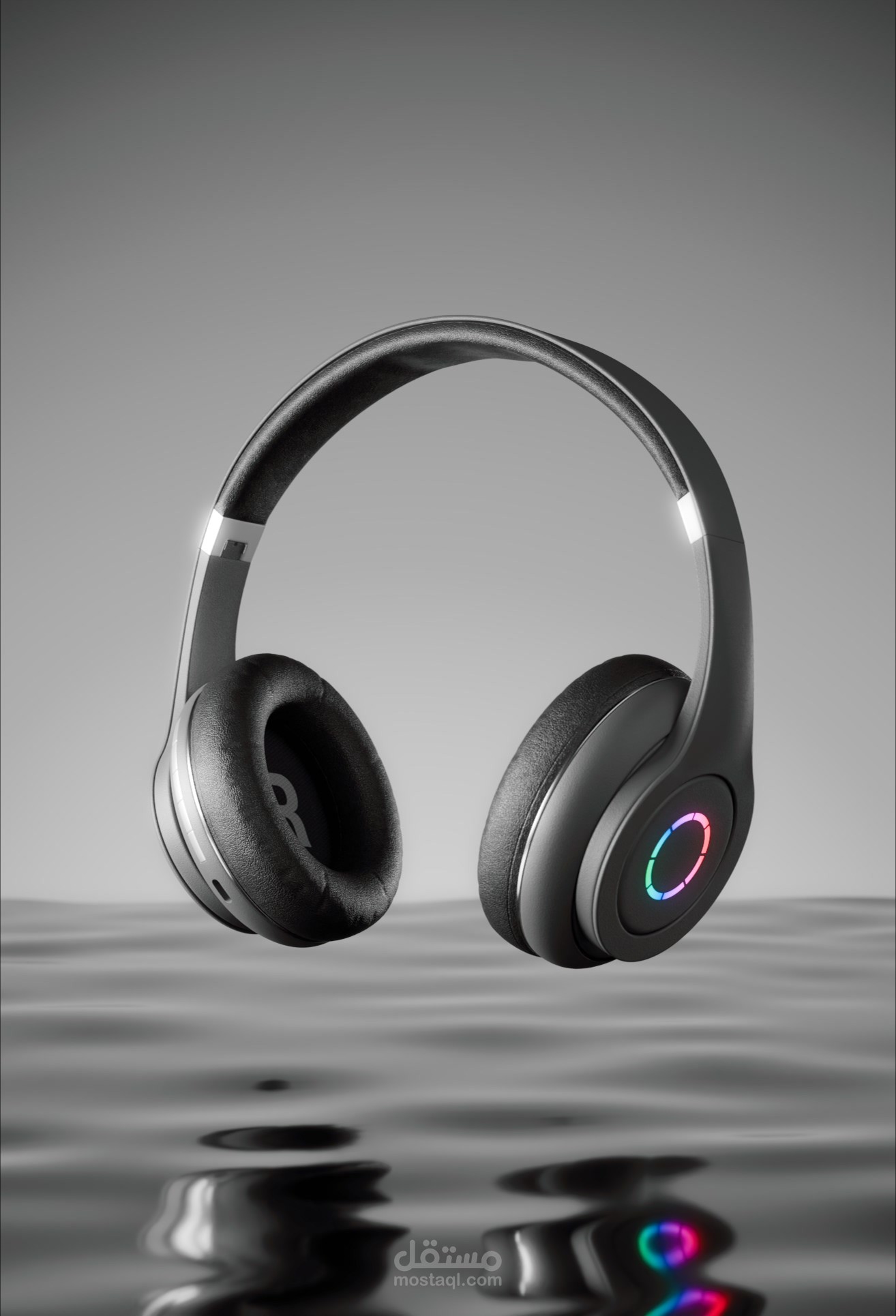 دراسة الخامات (Material Study): ركزتُ في اللقطات القريبة (Close-ups) على إظهار ملمس الجلد الناعم لوسادات الأذن في مقابل اللمعان المعدني المصقول لجسم السماعة، مما يعزز الشعور بالراحة والفخامة في آن واحد.