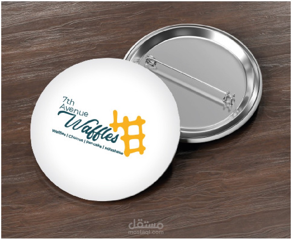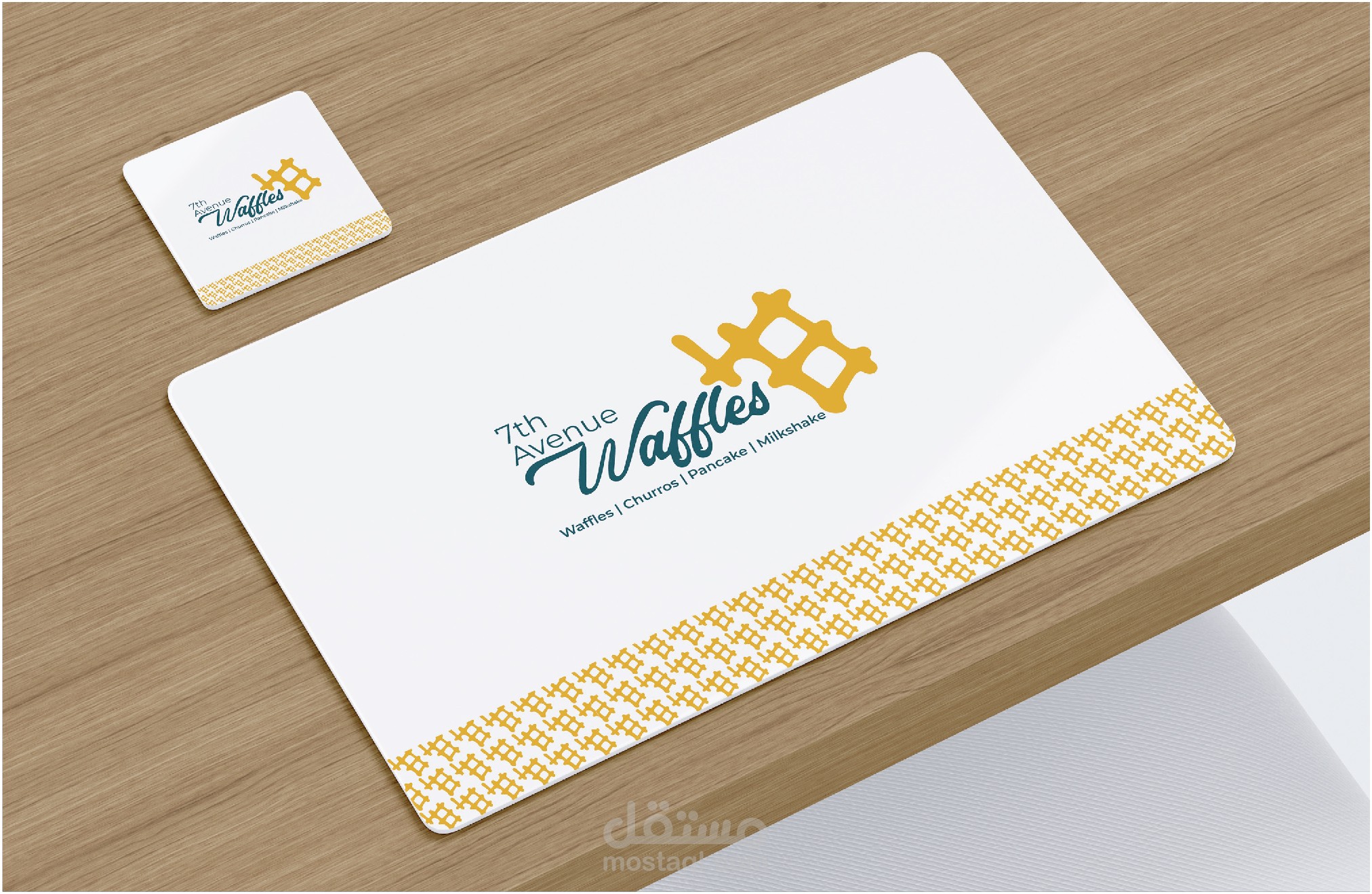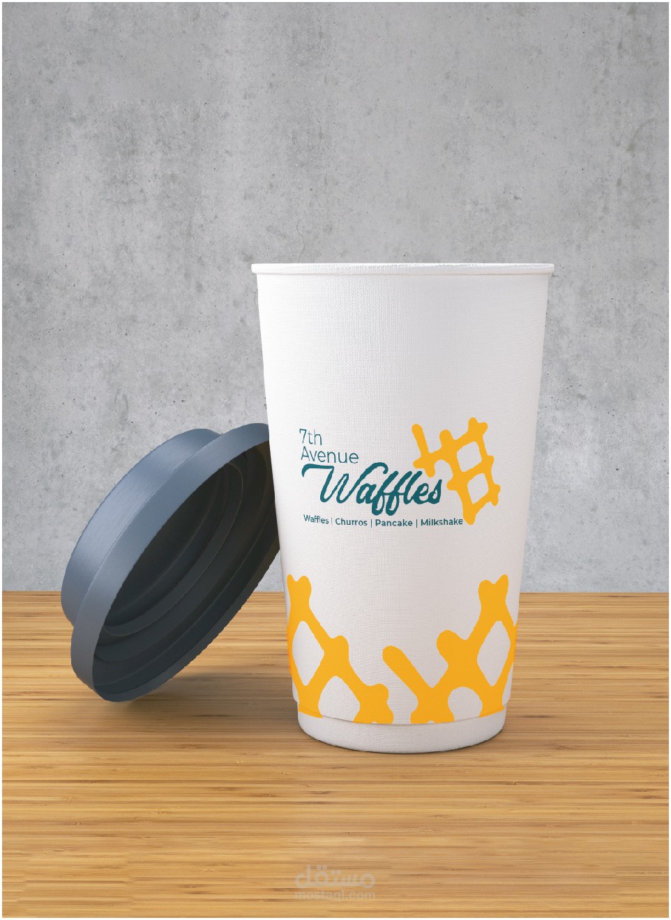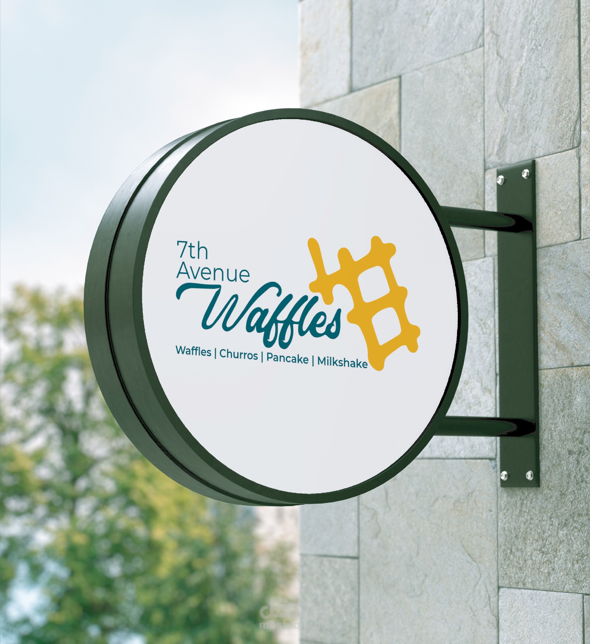 كلمة “Waffles” مكتوبة بخط انسيابي وناعم ليعكس الطابع الودي والمصنوع بحب، بينما كُتبت “7th Avenue” بخط بسيط وواضح ليعبر عن المكان والهوية بشكل أنيق.