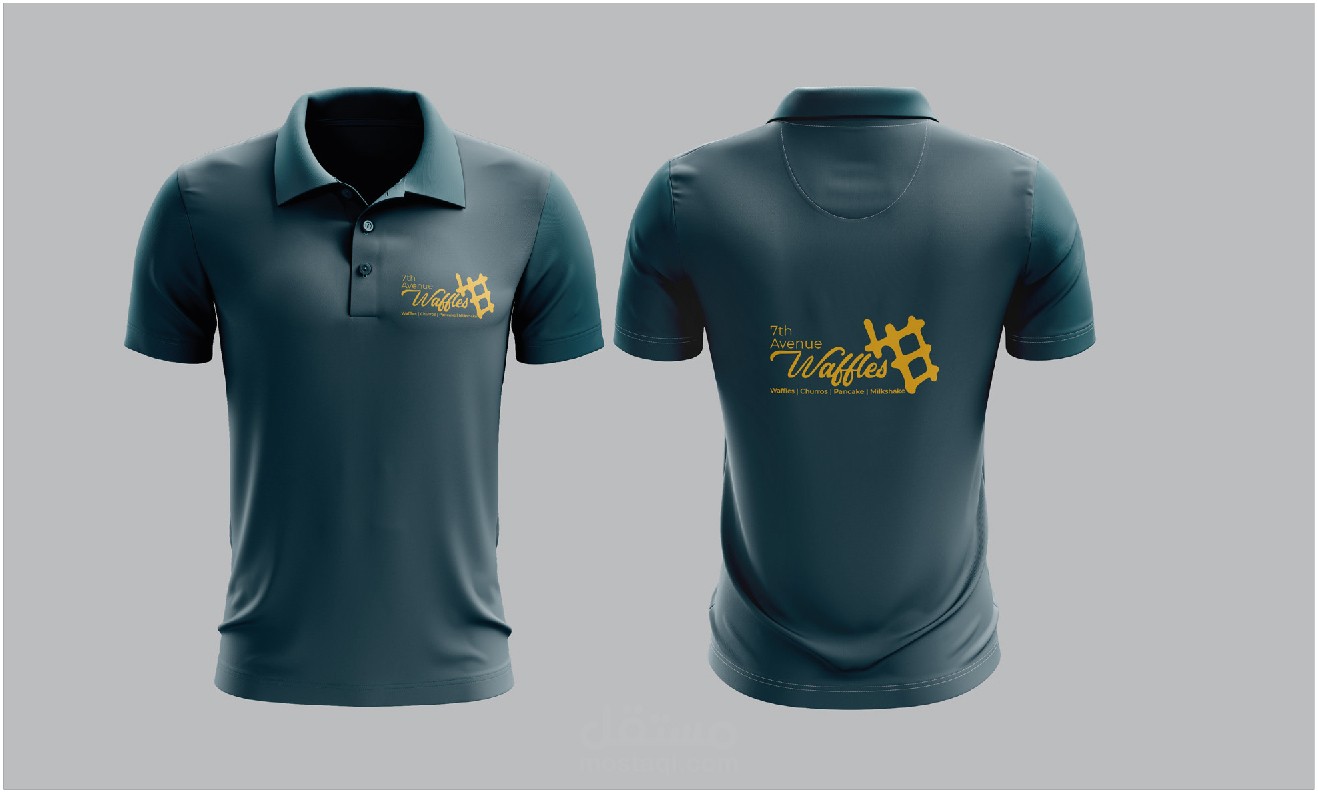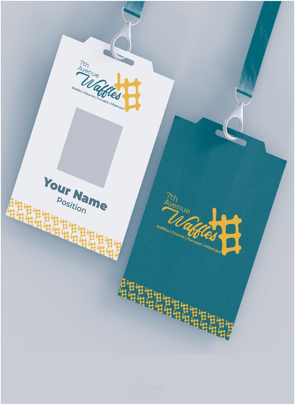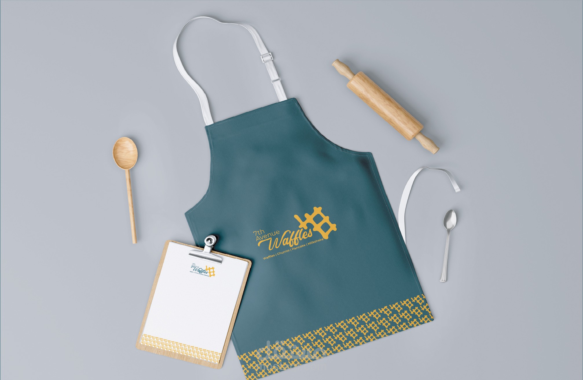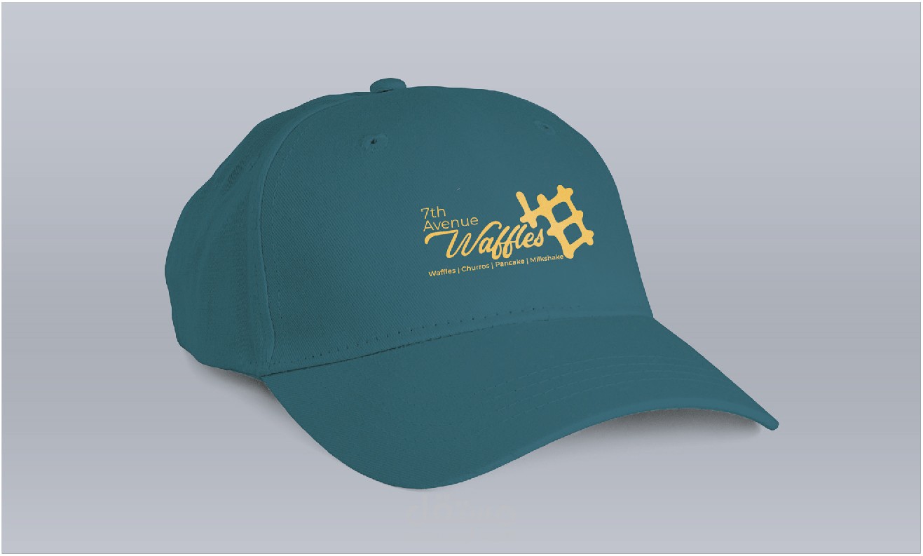 كلمة “Waffles” مكتوبة بخط انسيابي وناعم ليعكس الطابع الودي والمصنوع بحب، بينما كُتبت “7th Avenue” بخط بسيط وواضح ليعبر عن المكان والهوية بشكل أنيق.