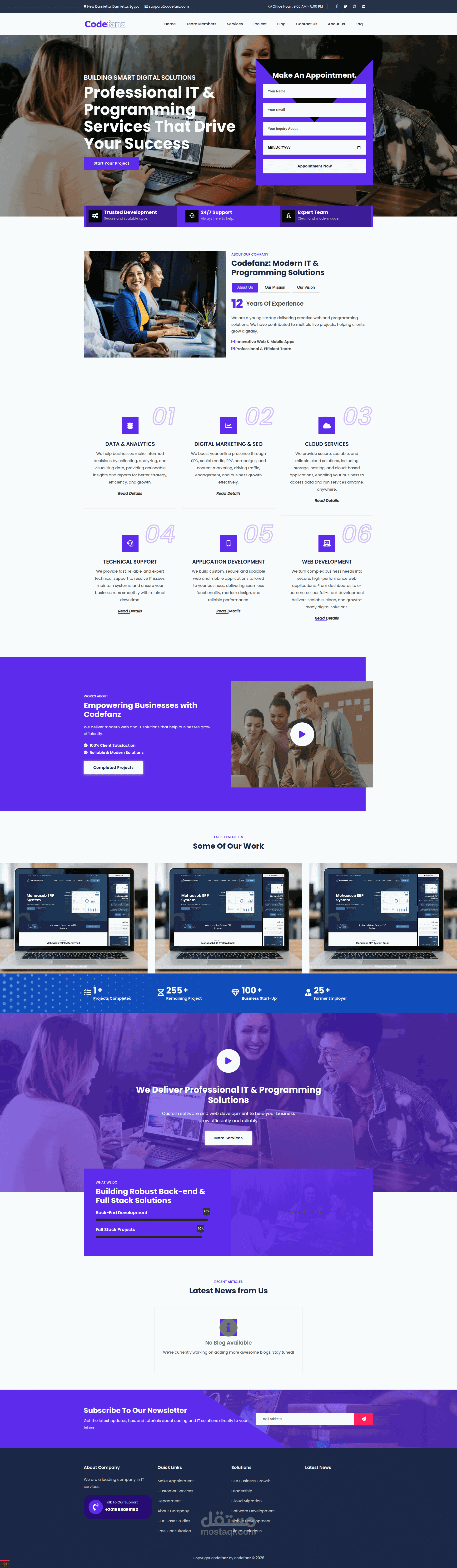 من ناحية البنية التحتية والدعم الفني، توفر Codefanz حلول استضافة موثوقة، إدارة خوادم، ودعم فني مستمر لضمان استمرارية الأعمال وتقليل الأعطال والمشاكل التقنية. تشمل خدمات الدعم الفني استكشاف الأخطاء وإصلاحها، إدارة الشبكات، وأمن المعلومات لضمان حماية البيانات وحفظها بشكل آمن.