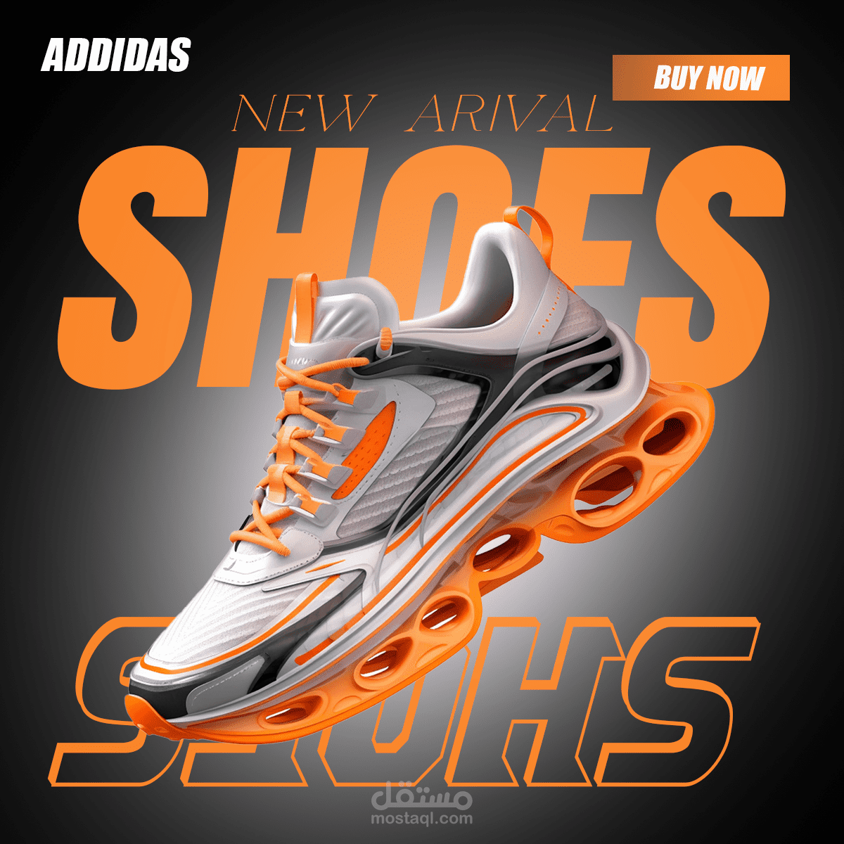 Massive Title: The word "SHOES" is repeated twice using a "Typography Overlap" style. The first is in a bold, solid orange font behind the shoe, and the second is at the bottom as an outlined frame to add visual depth to the design.
