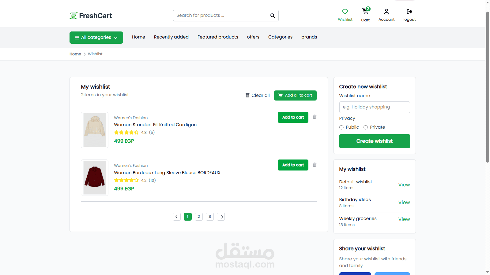 ربط كامل مع API جاهزة (Route) للتعامل مع البيانات والعمليات الأساسية (Products / Auth / Cart / Wishlist… حسب الـ Endpoints).
