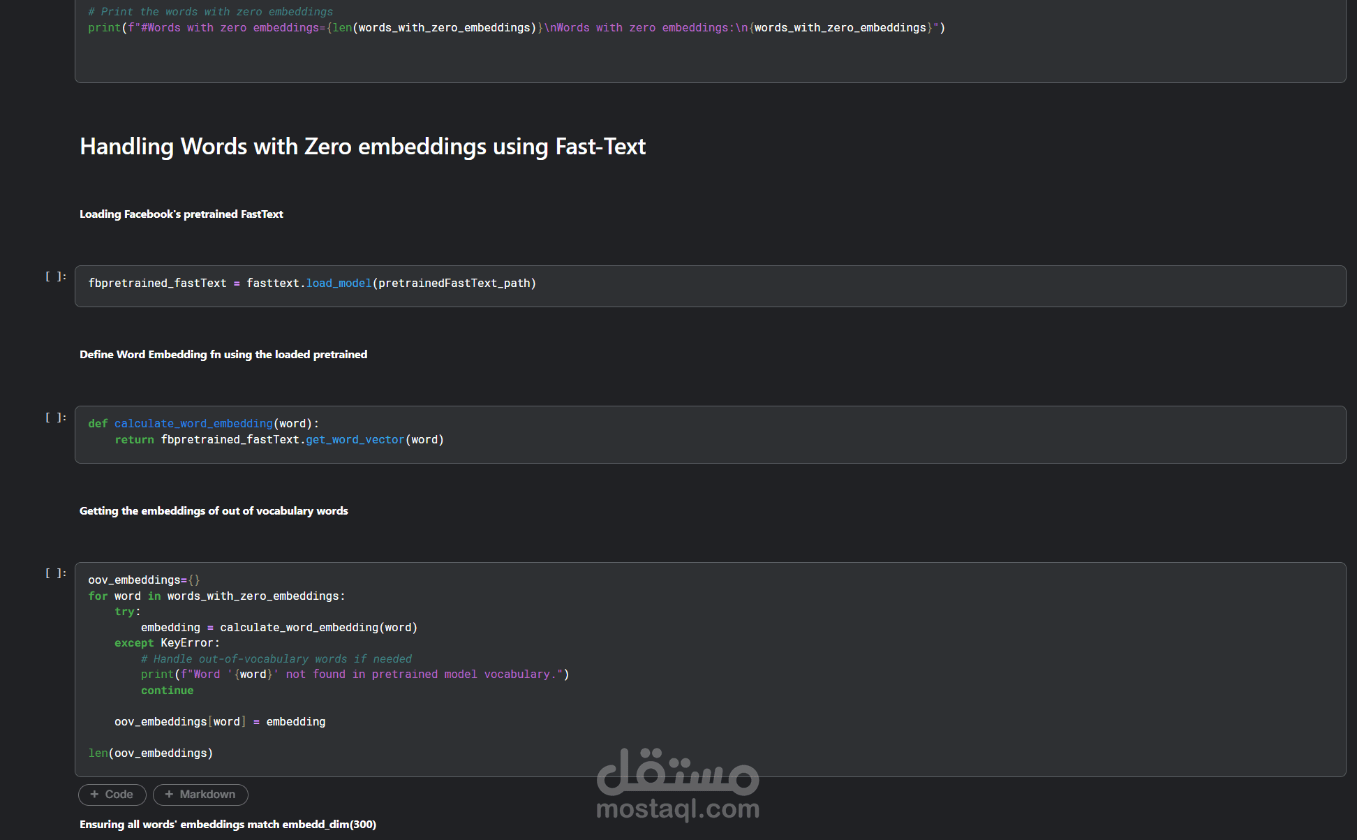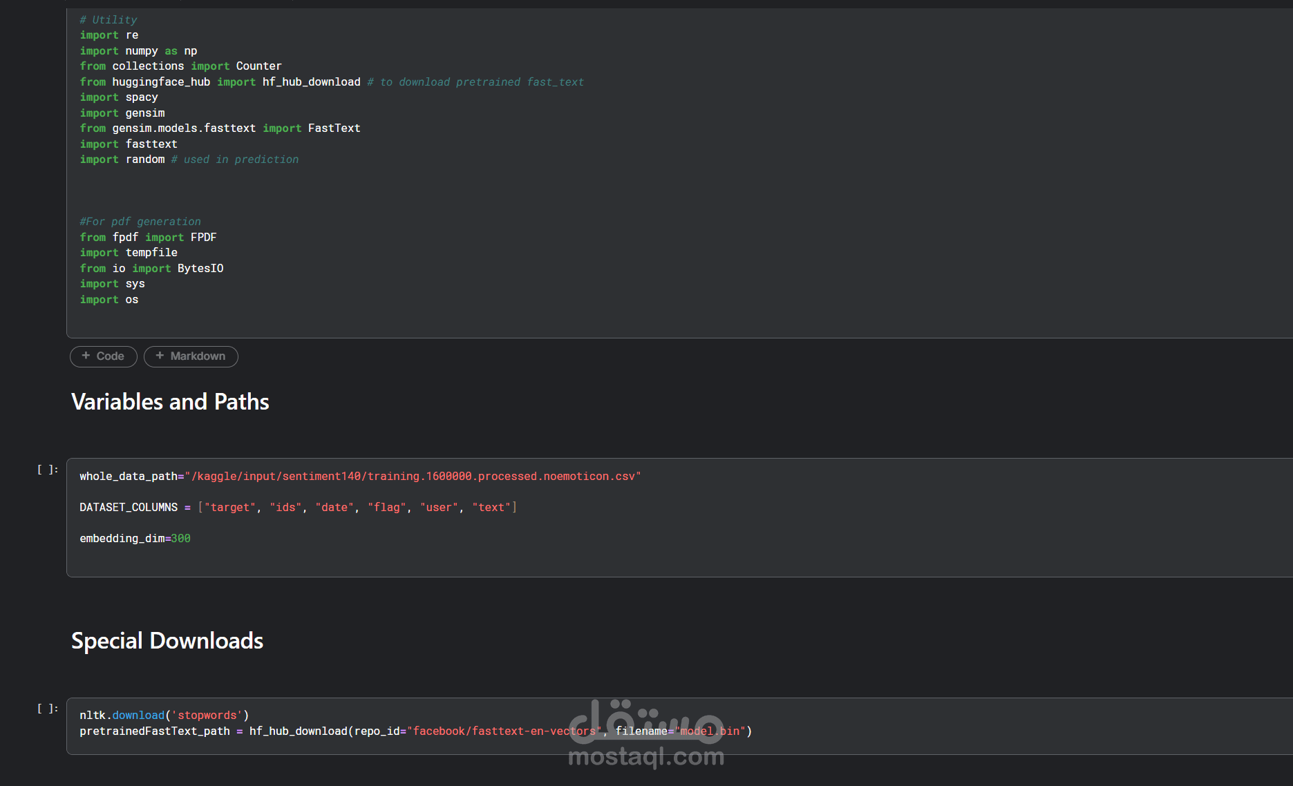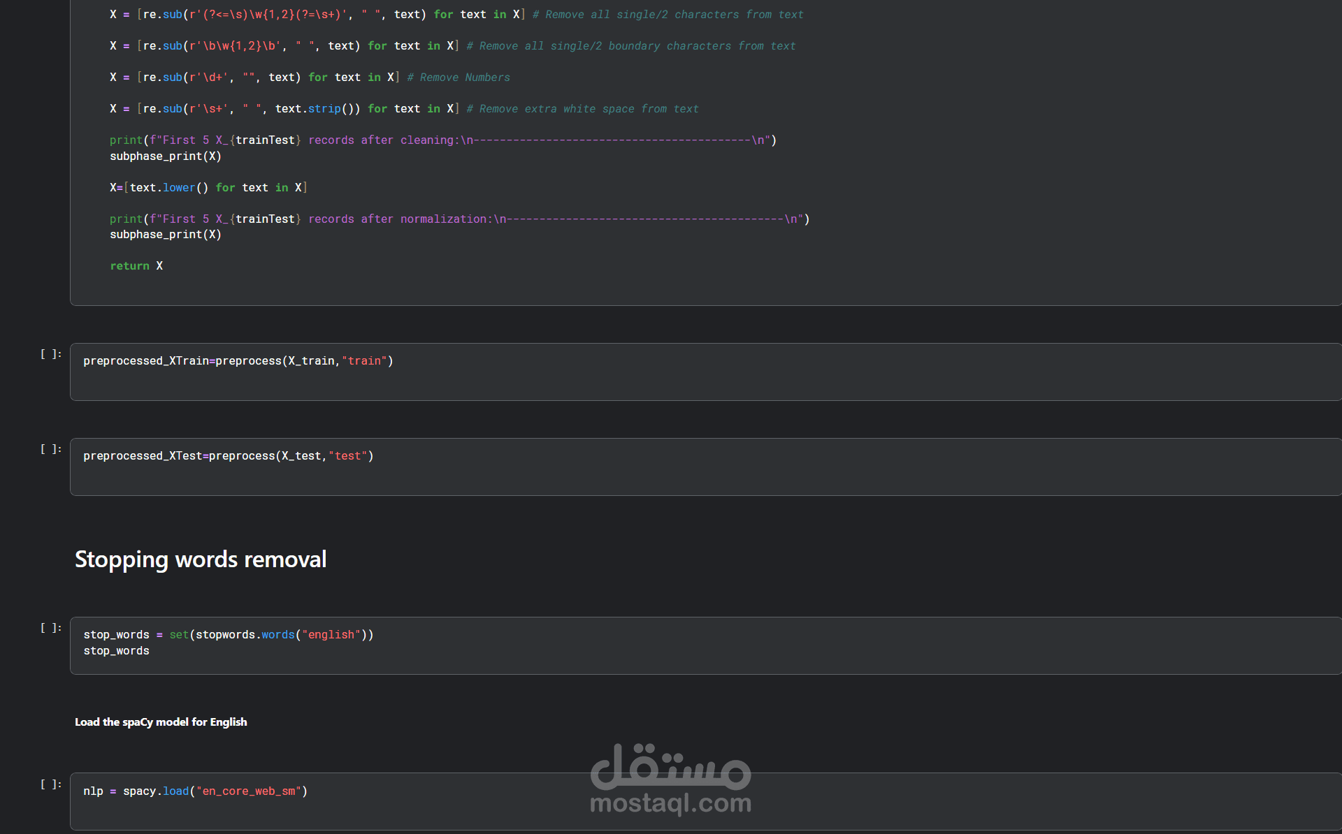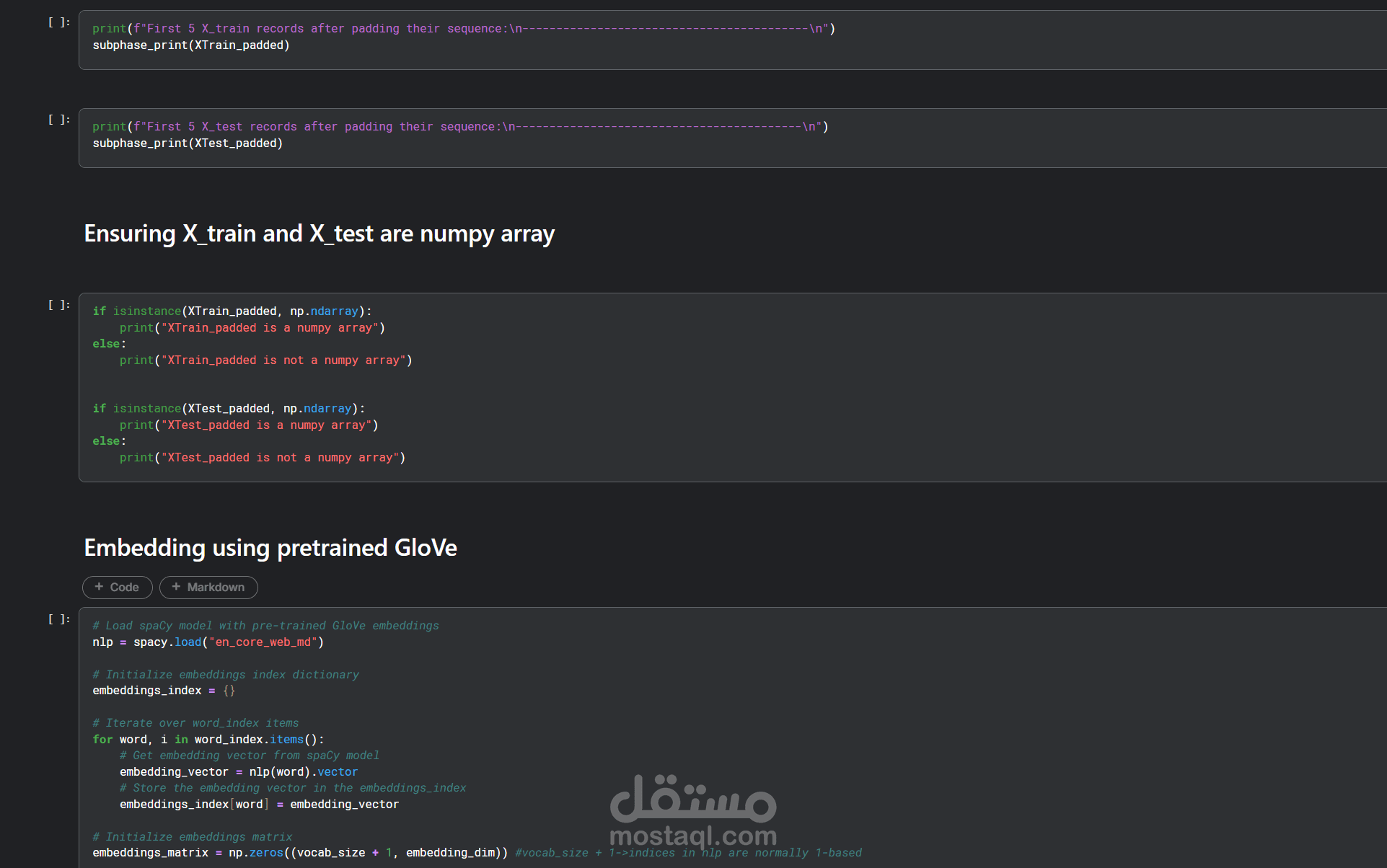 شمل العمل تنفيذ مرحلة معالجة بيانات متكاملة، تضمنت تنظيف النصوص، إزالة الكلمات غير المؤثرة، وتحويل الكلمات إلى تمثيلات رقمية باستخدام نماذج جاهزة مثل FastText و GloVe لتعزيز فهم النموذج للمعاني اللغوية.