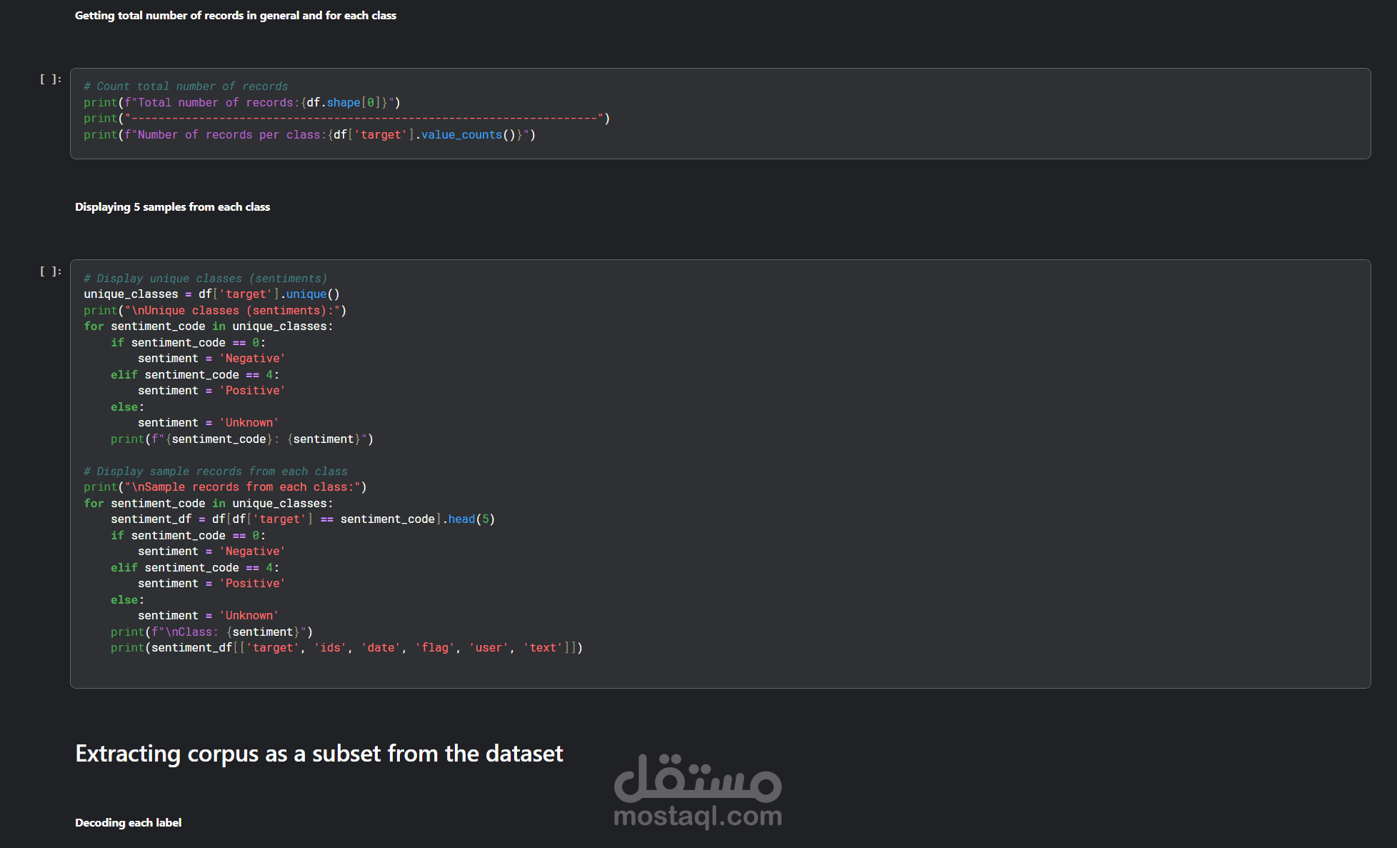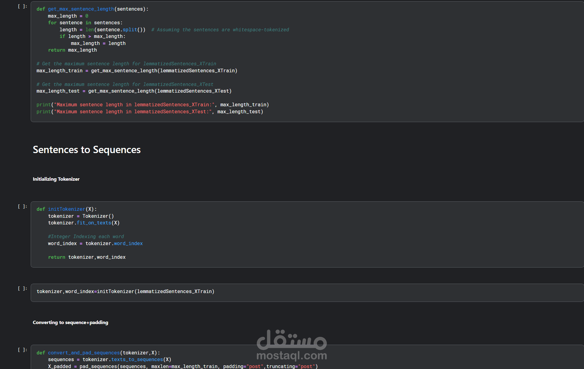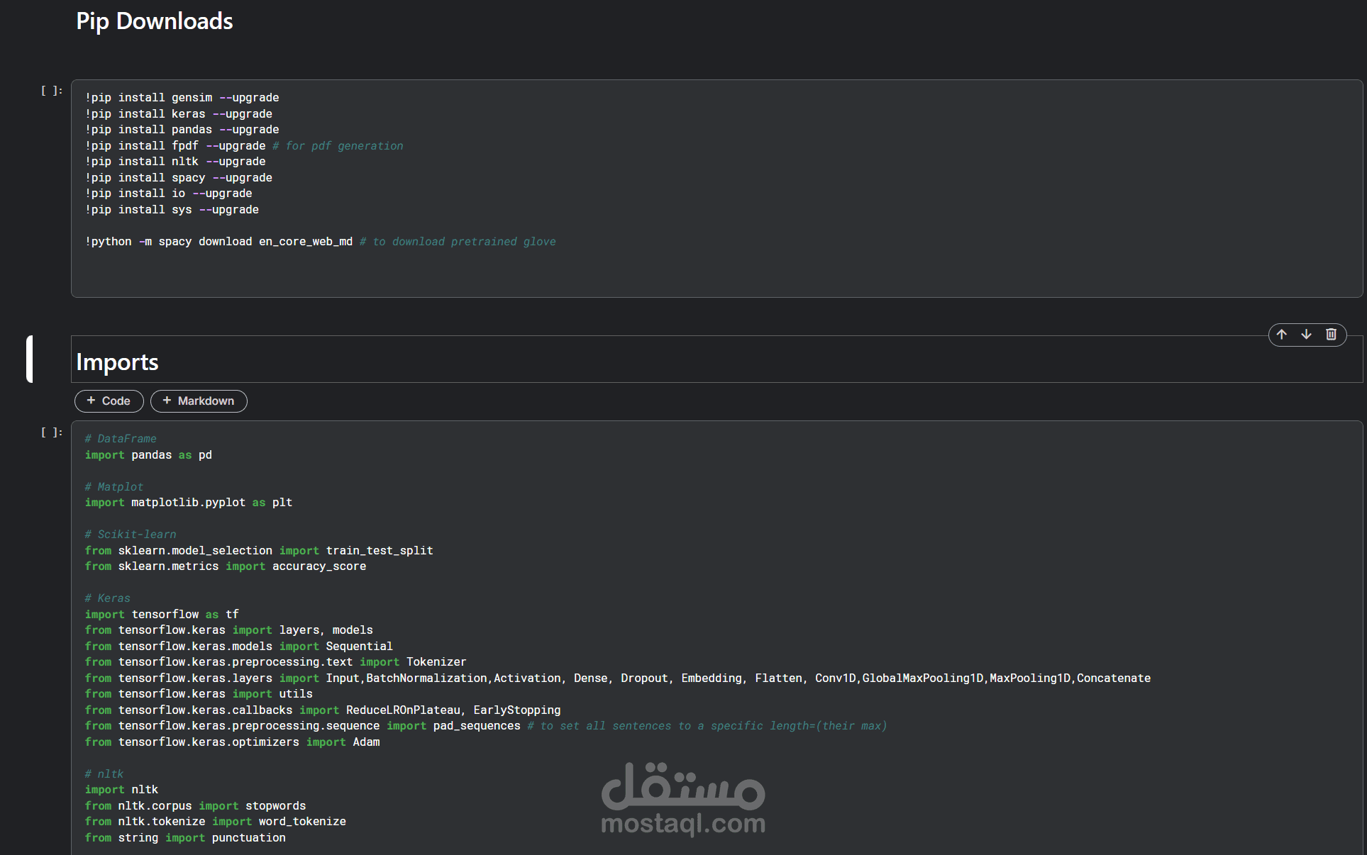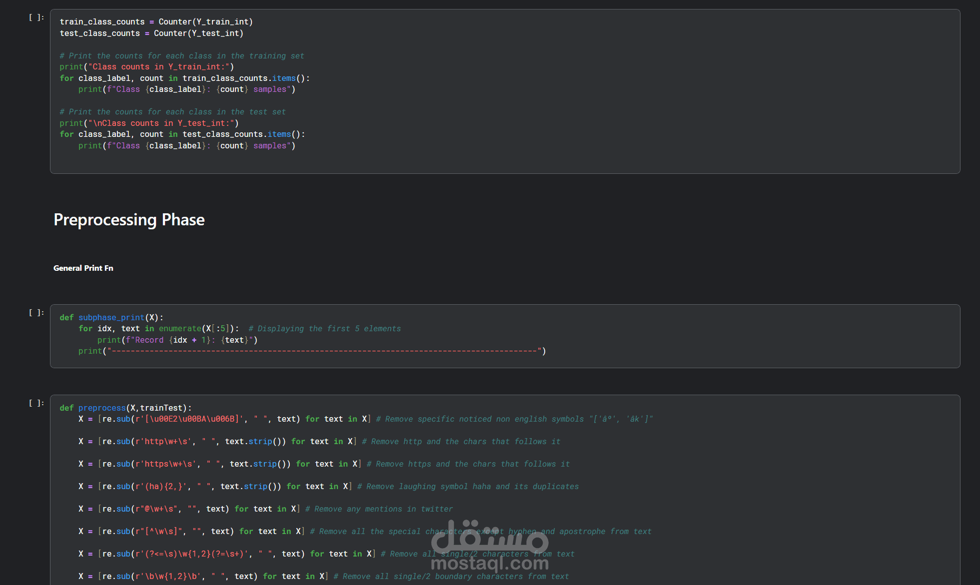 شمل العمل تنفيذ مرحلة معالجة بيانات متكاملة، تضمنت تنظيف النصوص، إزالة الكلمات غير المؤثرة، وتحويل الكلمات إلى تمثيلات رقمية باستخدام نماذج جاهزة مثل FastText و GloVe لتعزيز فهم النموذج للمعاني اللغوية.