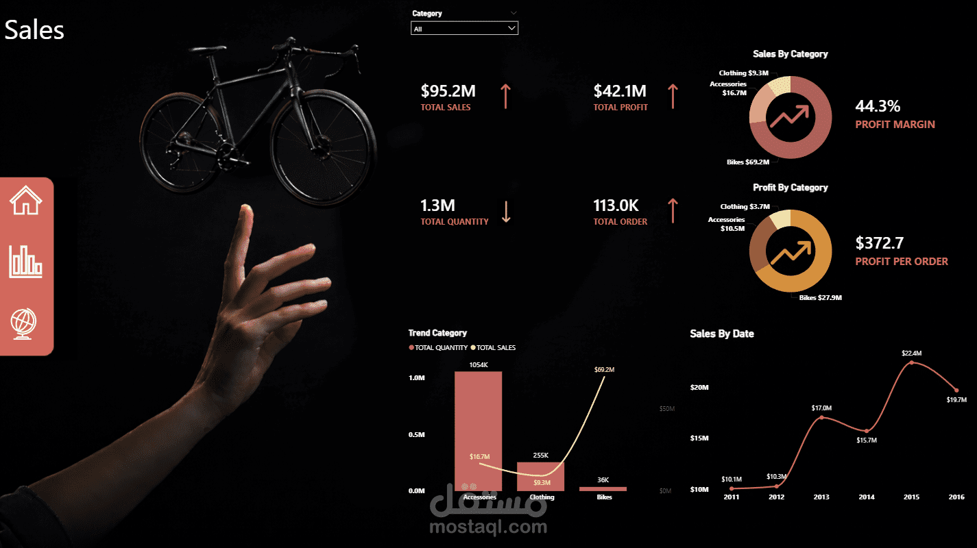 لوحة معلومات تحليلية تم تنفيذها باستخدام Power BI لتحليل مبيعات الدراجات خلال فترة زمنية تمتد من 2011 إلى 2016، بهدف دعم الإدارة في اتخاذ قرارات دقيقة مبنية على البيانات.
