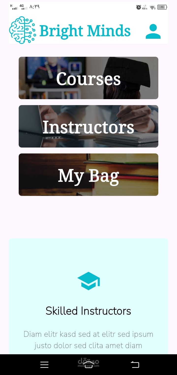 يقدّم تطبيق Bright Mind منصة تعليمية تفاعلية تُمكّن المستخدم من تصفّح المحتوى التعليمي وعرض الدروس بطريقة منظمة وسلسة. تم تصميم التطبيق ليدعم مختلف أحجام الشاشات ويوفّر تجربة استخدام متناسقة على الهواتف والأجهزة اللوحية.