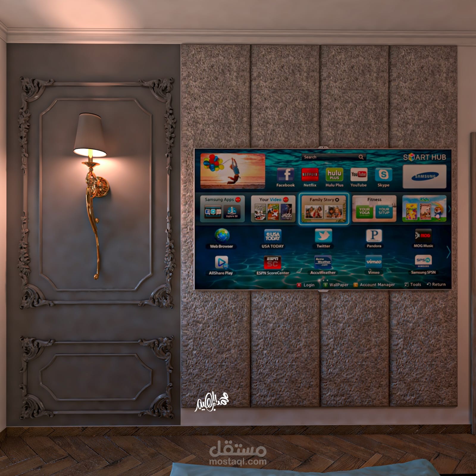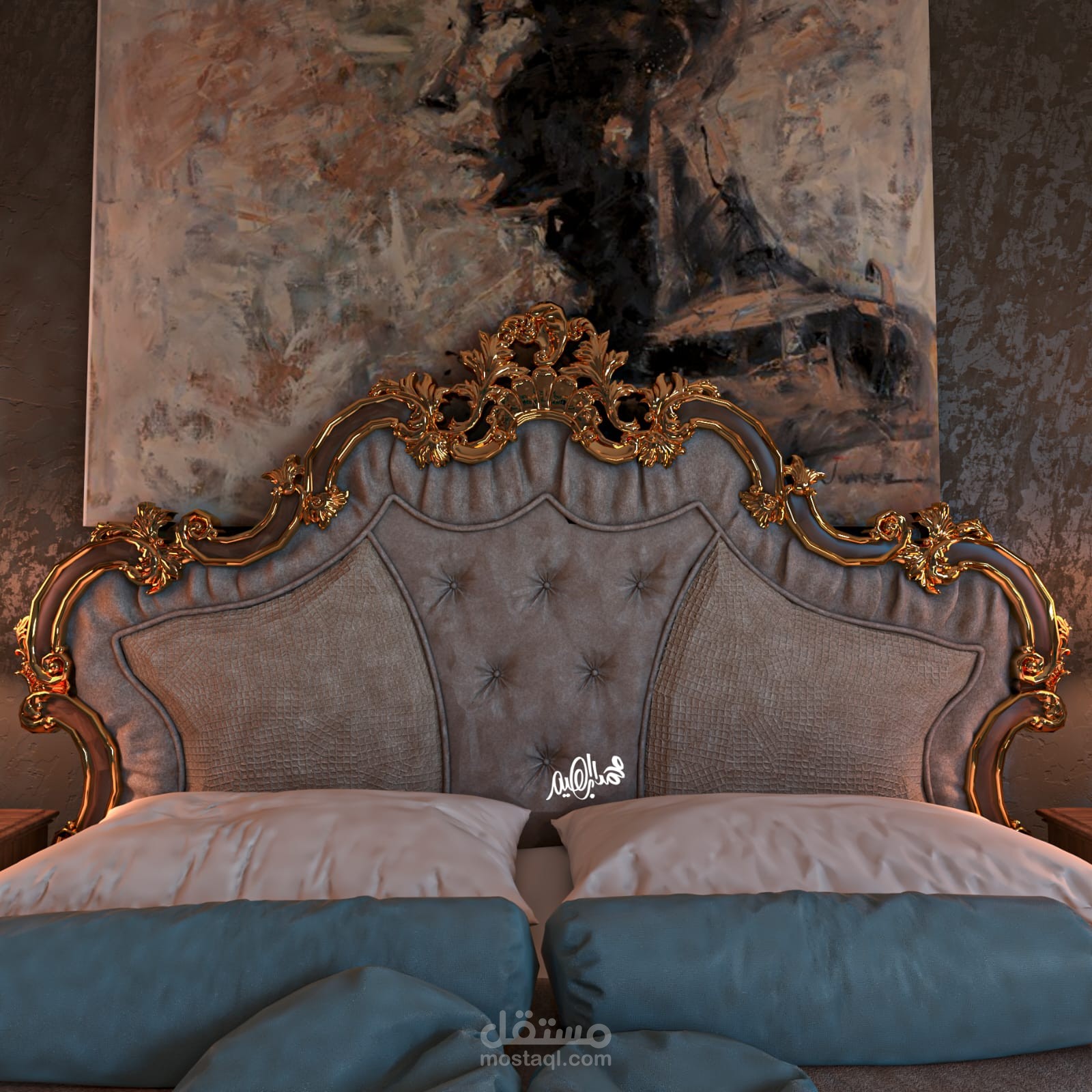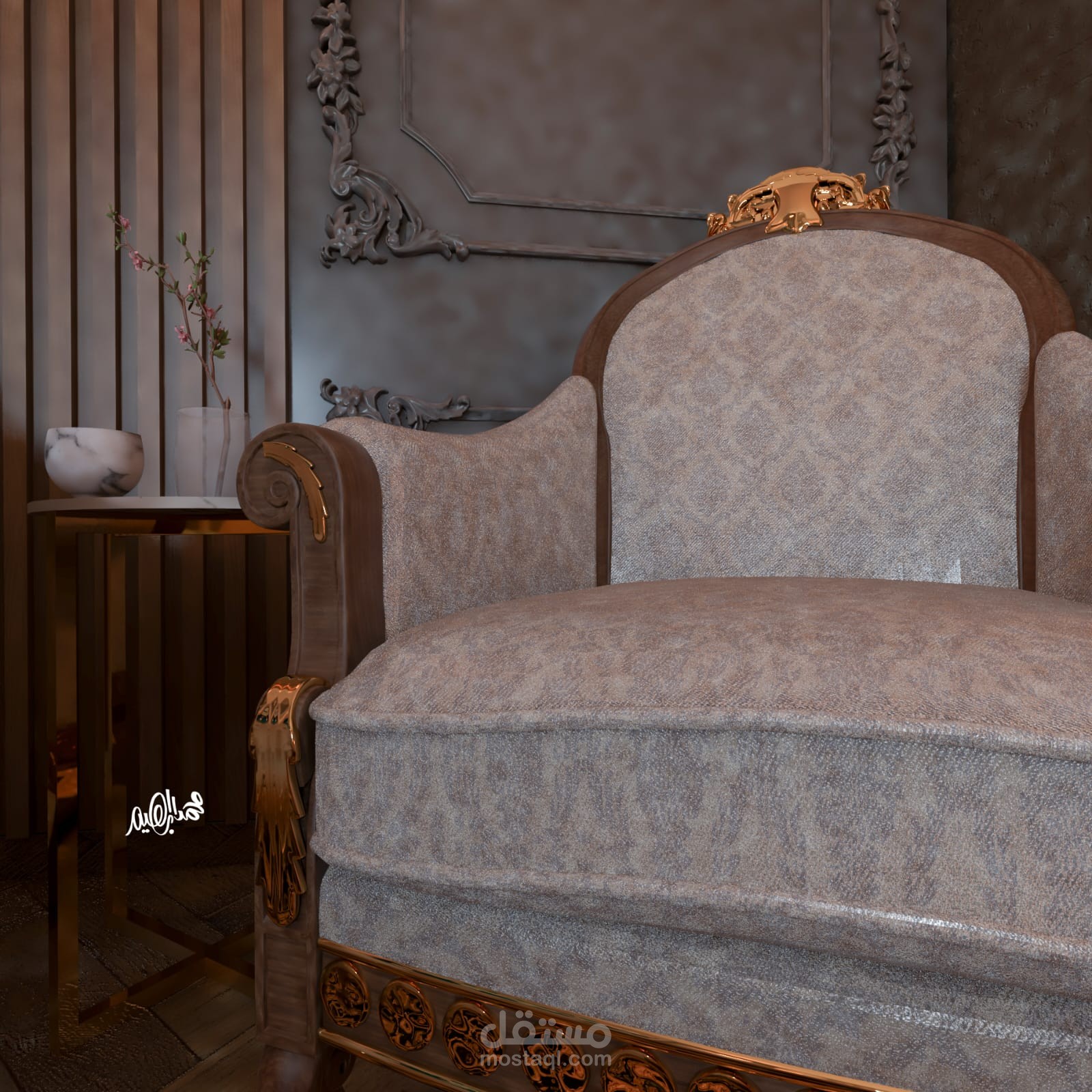الإظهار المعماري: تقديم لقطات رندر واقعية (Photorealistic) توضح ملمس الأقمشة، لمعان الذهب، وتفاصيل الباركيه.