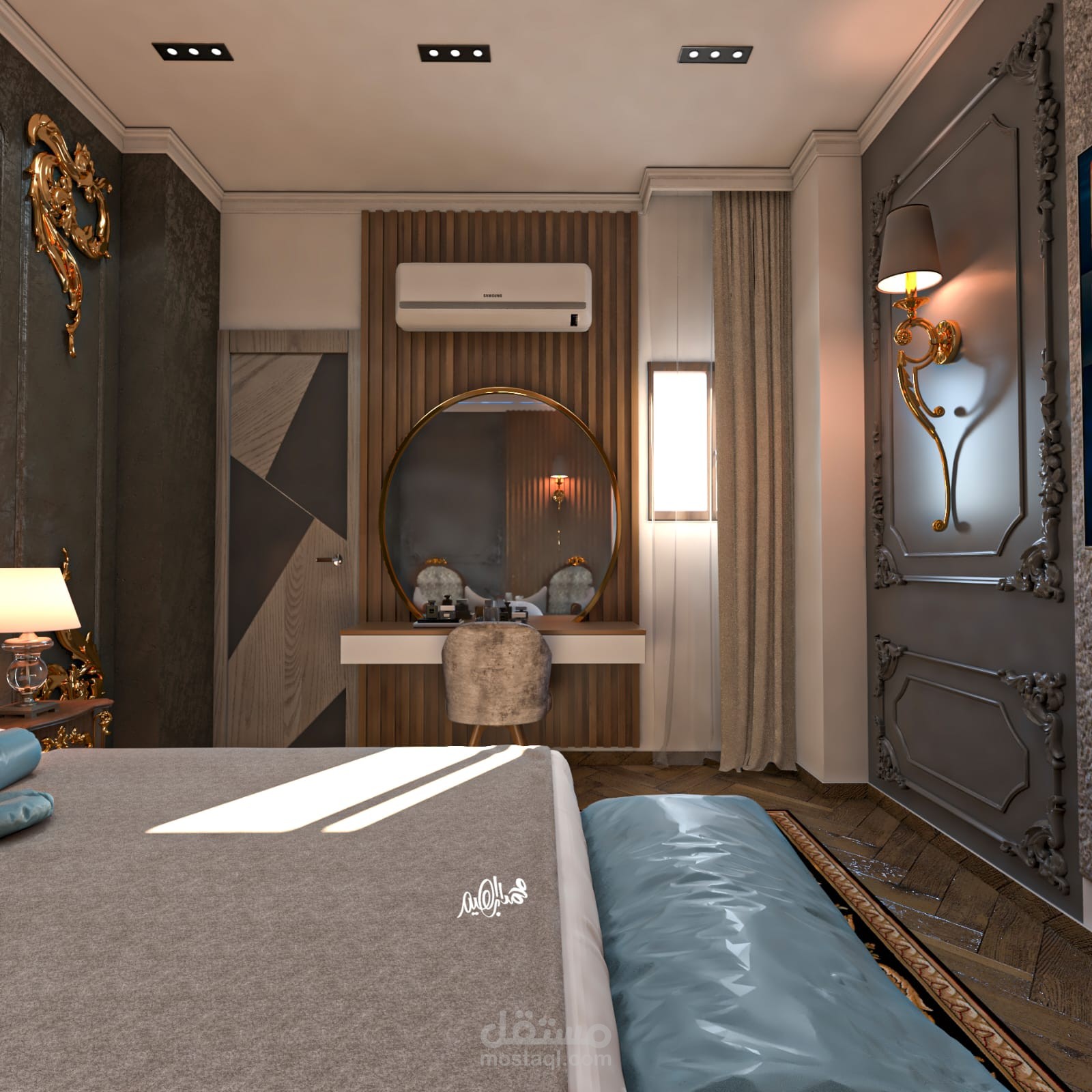 تم تصميم هذه الغرفة لتجمع بين الرقي الكلاسيكي والعملية المودرن، مع التركيز على خلق أجواء فندقية فاخرة.
