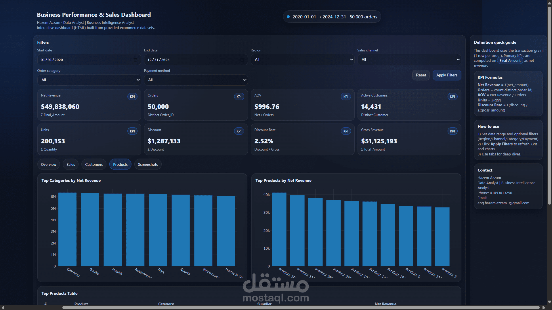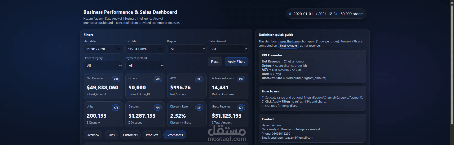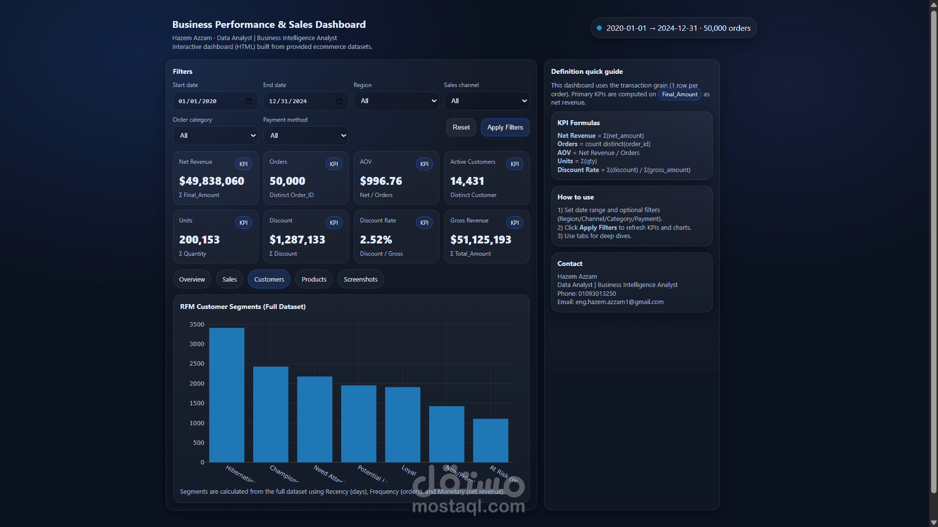 محلل بيانات ومهندس ذكاء أعمال (BI) مسؤول عن تصميم وتطوير لوحات تحكم تفاعلية لمتابعة أداء المبيعات، وتحويل البيانات الخام إلى مؤشرات دقيقة تساعد في اتخاذ القرار. يشمل الدور بناء نماذج بيانات قابلة للتوسع، وتنفيذ عمليات تنظيف ومعالجة (Data Cleaning & Transformation)، وحساب KPIs مثل صافي الإيرادات، معدل الخصم، متوسط قيمة الطلب، وتحليل القنوات البيعية. كما يتضمن تقسيم العملاء باستخدام منهجية RFM، وإنشاء تقارير تحليلية متقدمة مدعومة بالرسوم البيانية والجداول، مع اقتراح التوقعات (Predictions) والرؤى الإستراتيجية. يتم التنفيذ باستخدام أدوات مثل SQL، Excel/Sheets، Python، وDashboards على الويب، مع مراعاة جودة البيانات، سهولة الاستخدام، والتصميم الاحترافي الجذاب.