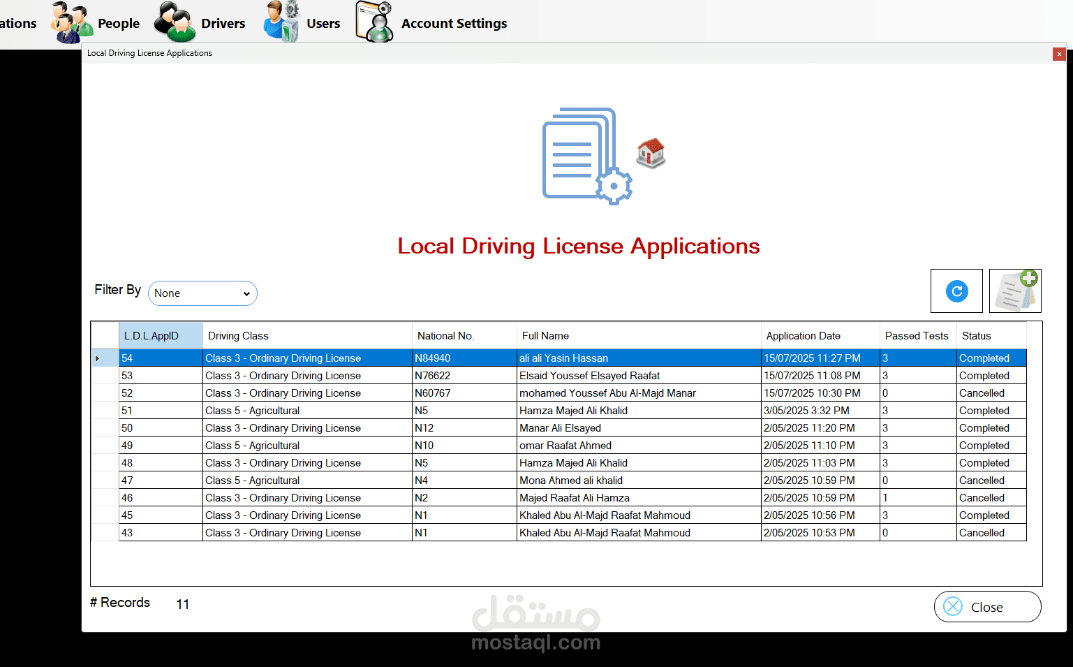 This project is a comprehensive Driving & Vehicle License Department (DVLD) management system designed to automate the issuance, renewal, replacement, and suspension handling of driver licenses and related services. Built as a Windows Forms application, it follows a 3-Tier Architecture (Presentation, Business Logic, Data Access) and implements Object-Oriented Programming (OOP) principles.