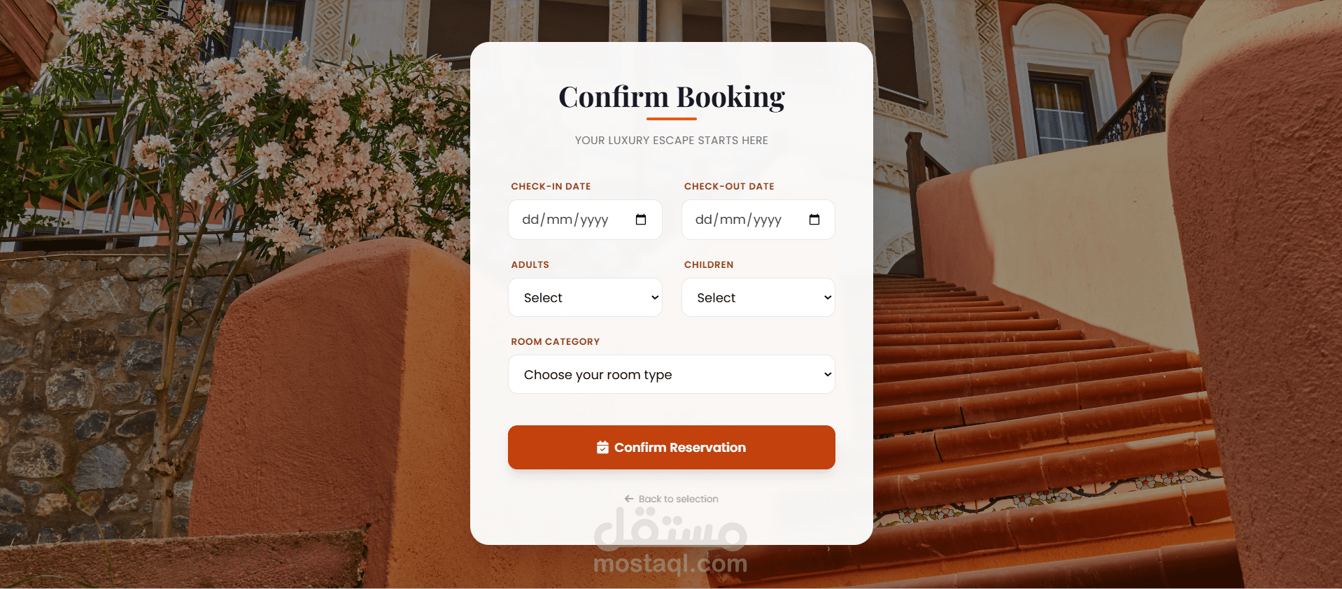 Rooms: عرض أنواع الغرف مع إمكانية اختيار الغرفة وإجراء الحجز.