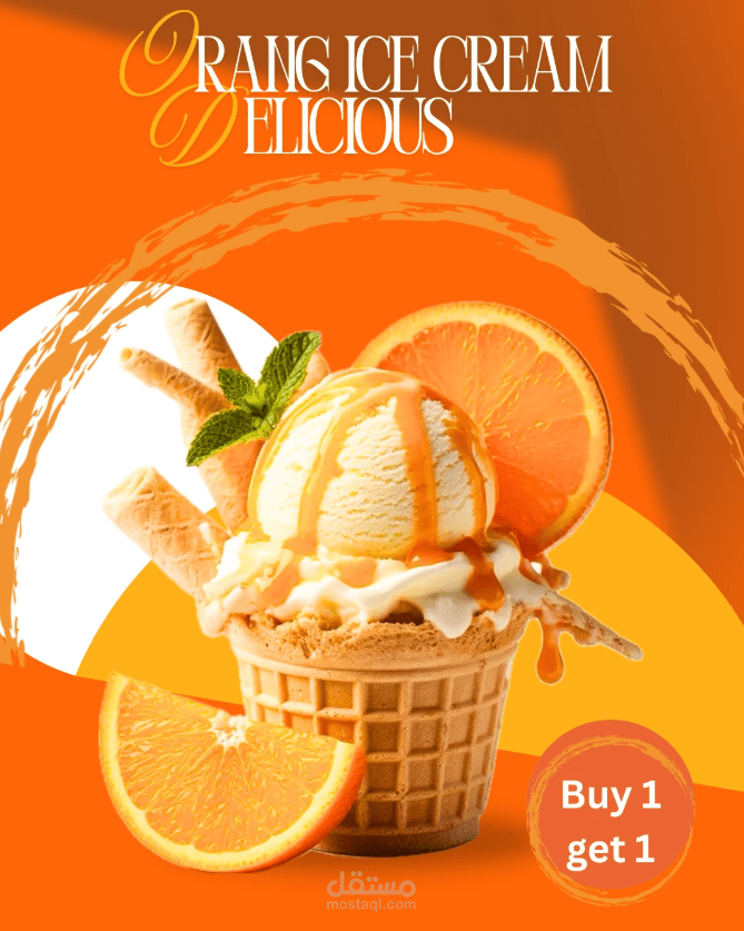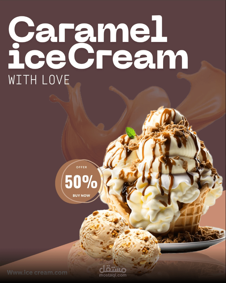 تم توظيف ألوان دافئة ولمسات فنية تعكس نعومة الآيس كريم وسلاسة الكراميل، مع إبراز العرض الترويجي بشكل واضح لتحفيز العميل على الشراء فورًا.