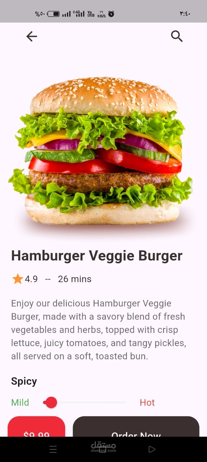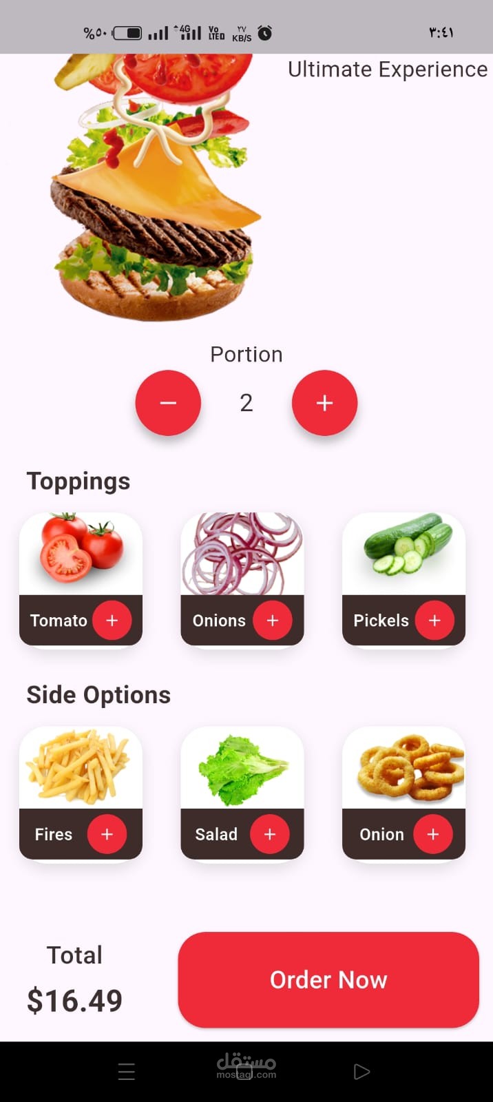 عند اختيار أي منتج يمكن للمستخدم الدخول إلى صفحة التفاصيل التي تحتوي على معلومات كاملة عن البرجر مثل المكونات والحجم والسعر مع إمكانية اختيار الإضافات المناسبة